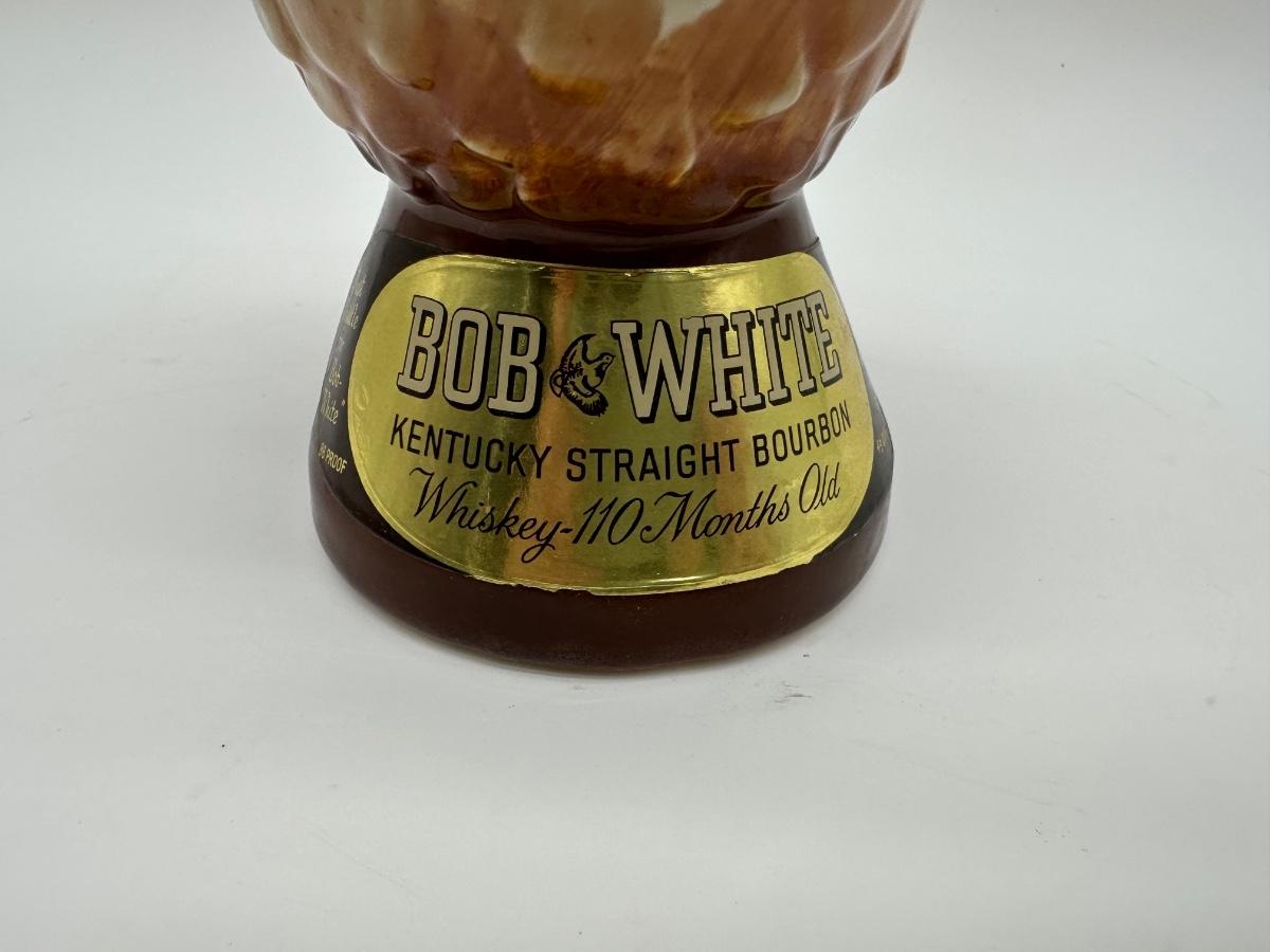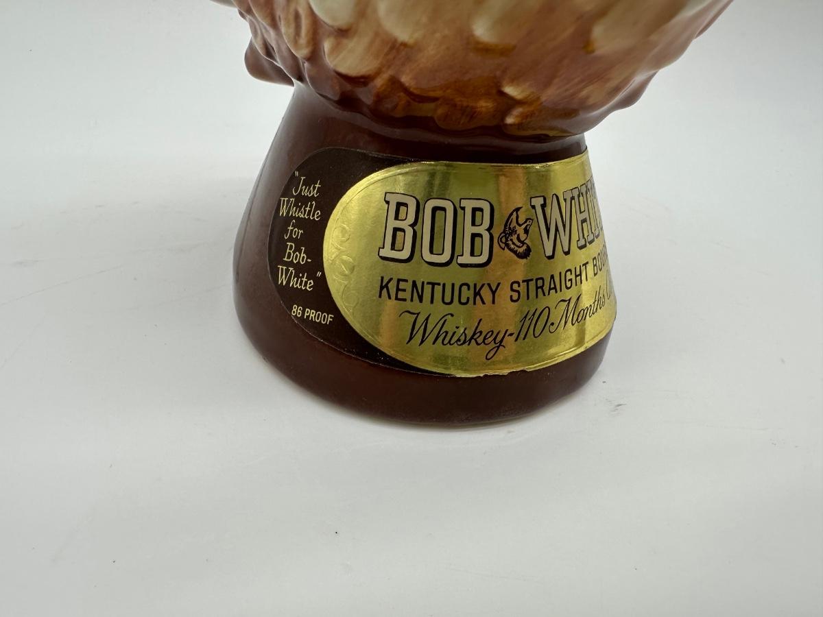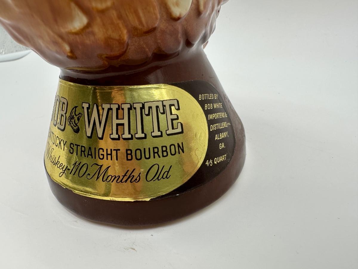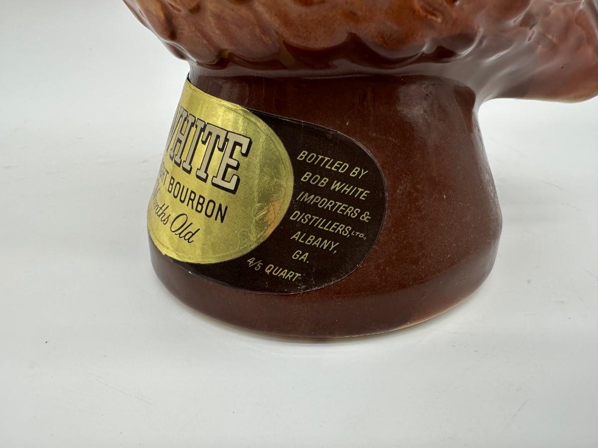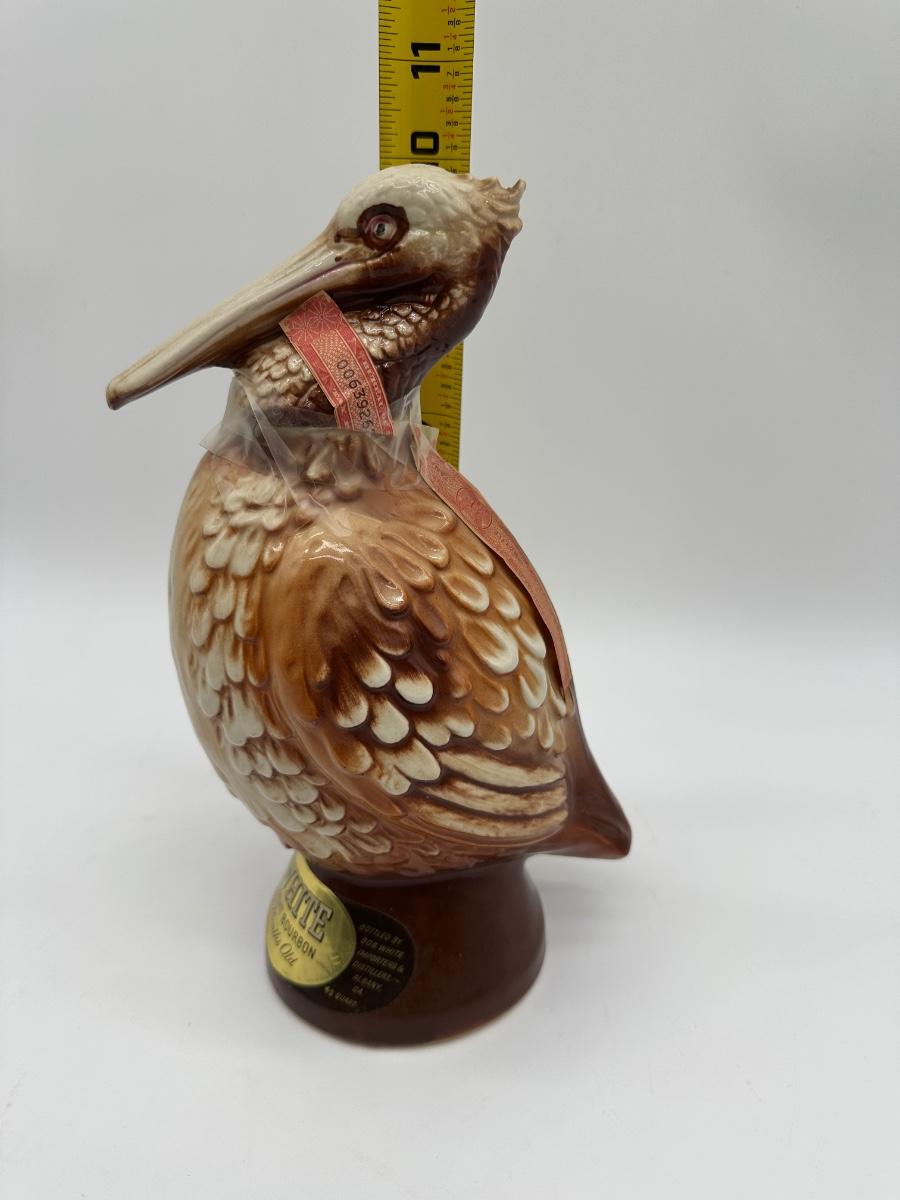 Vintage Bob White Kentucky Straight Bourbon figural whiskey decanter in the shape of a pelican. Highly detailed glazed ceramic body with original paper neck tax strip and labels present. Labeled “Whiskey – 110 Months Old”, 86 proof, 4/5 quart. Great display piece for bar, liquor, or decanter collectors.