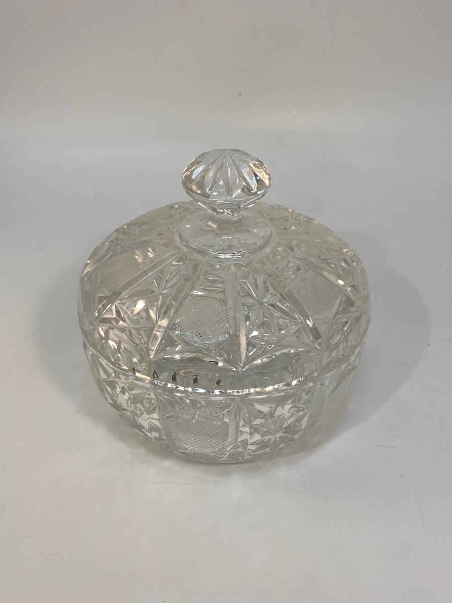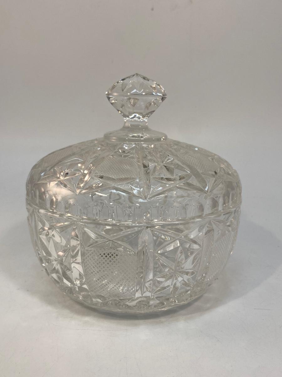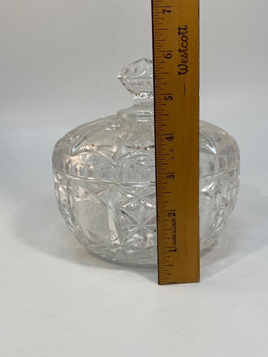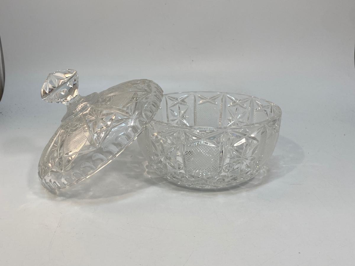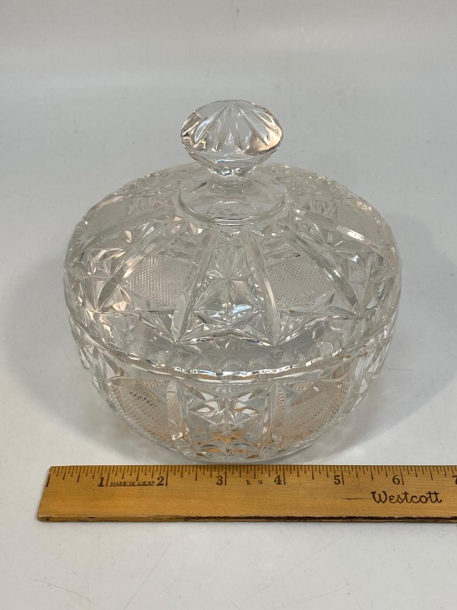 Vintage Bohemia Heavy Cut Crystal Lidded Candy Dish. In good condition. Thick crystal with a star and diamond pattern. About 6" size.