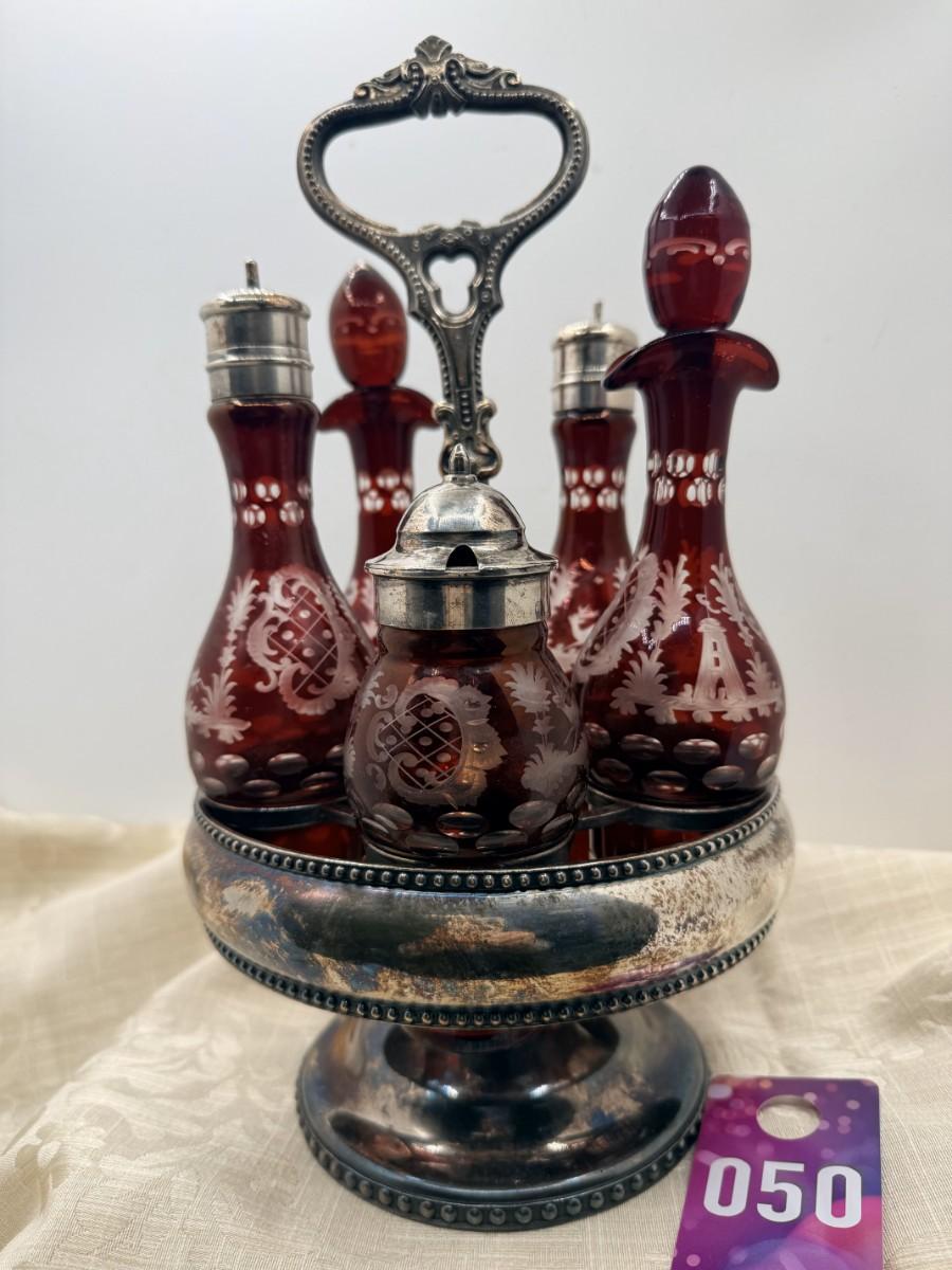 Held in silver plate stand, which needs polishing. Bottles are for oil, vinegar, salt, pepper, and mustard.