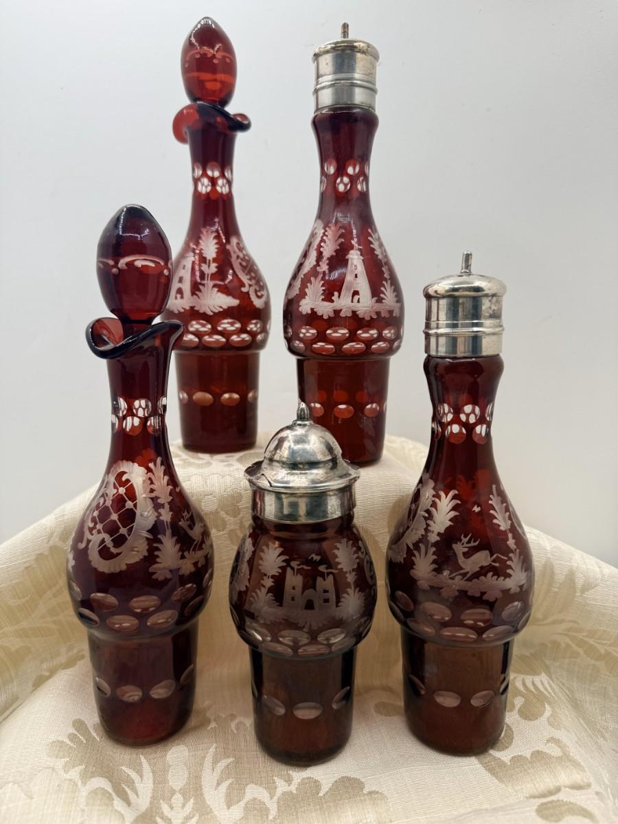 From late 19th or early 20th Century, 5 ruby red glass bottles with 'cut to clear' etchings of trees, buildings, and deer.