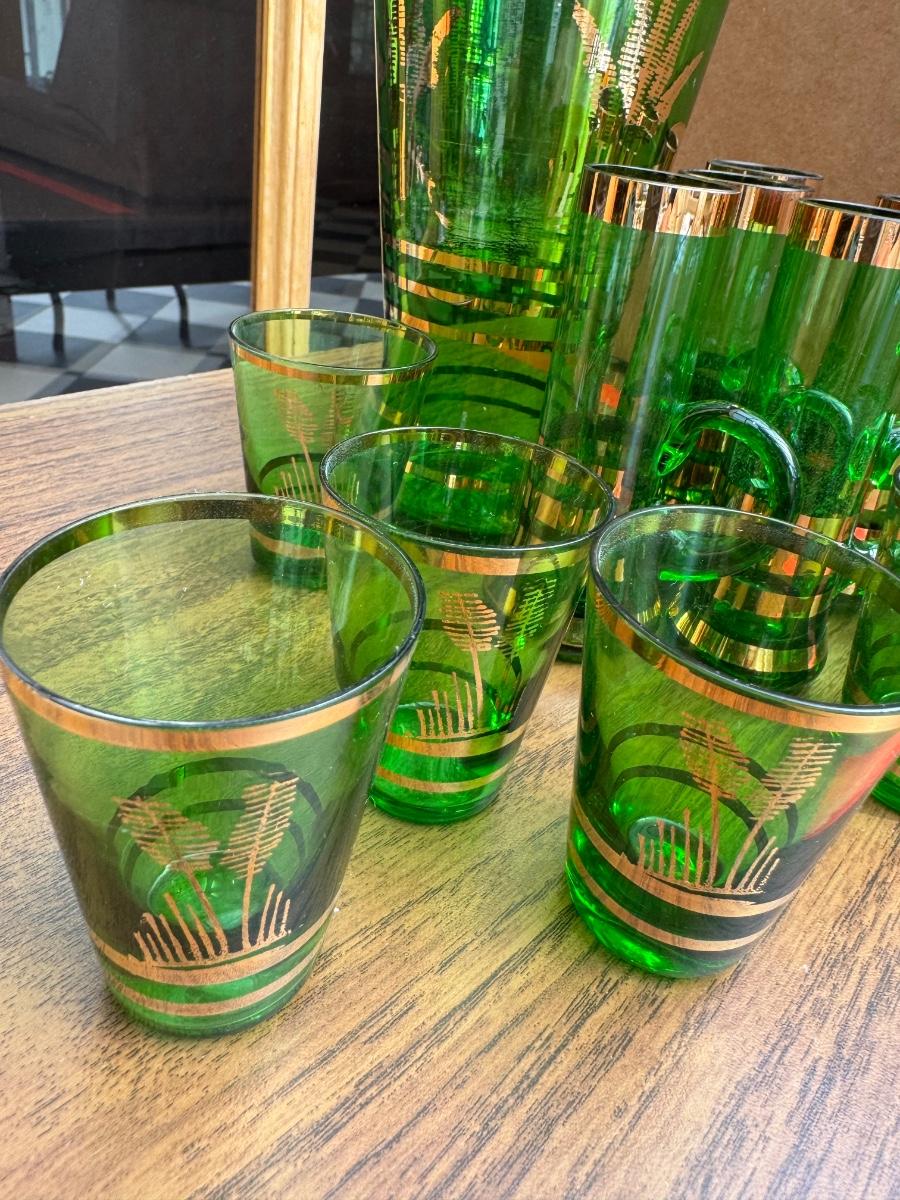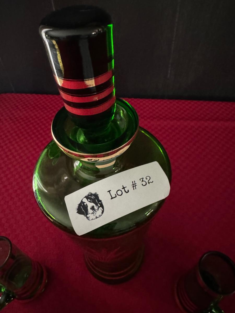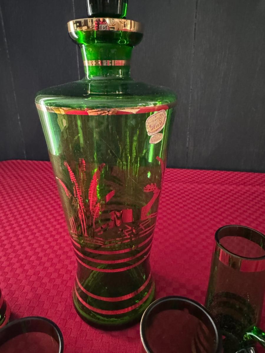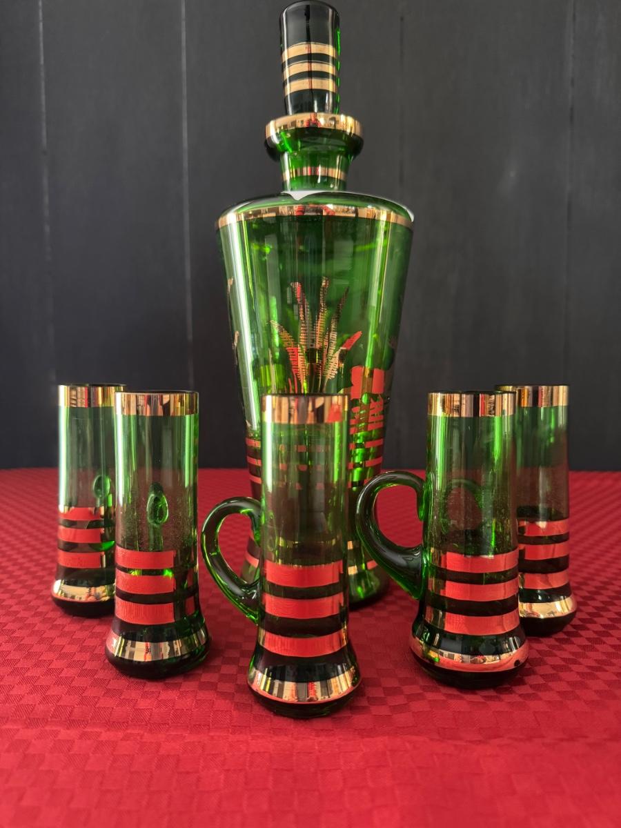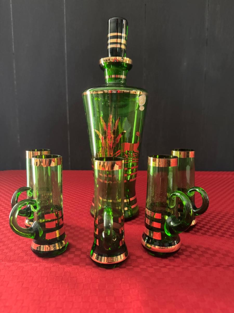 1 bottle and five glasses with handles, six shot glasses