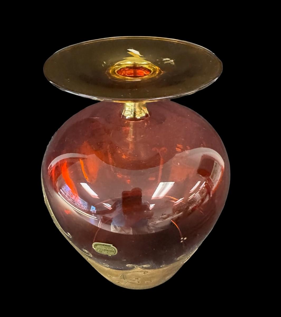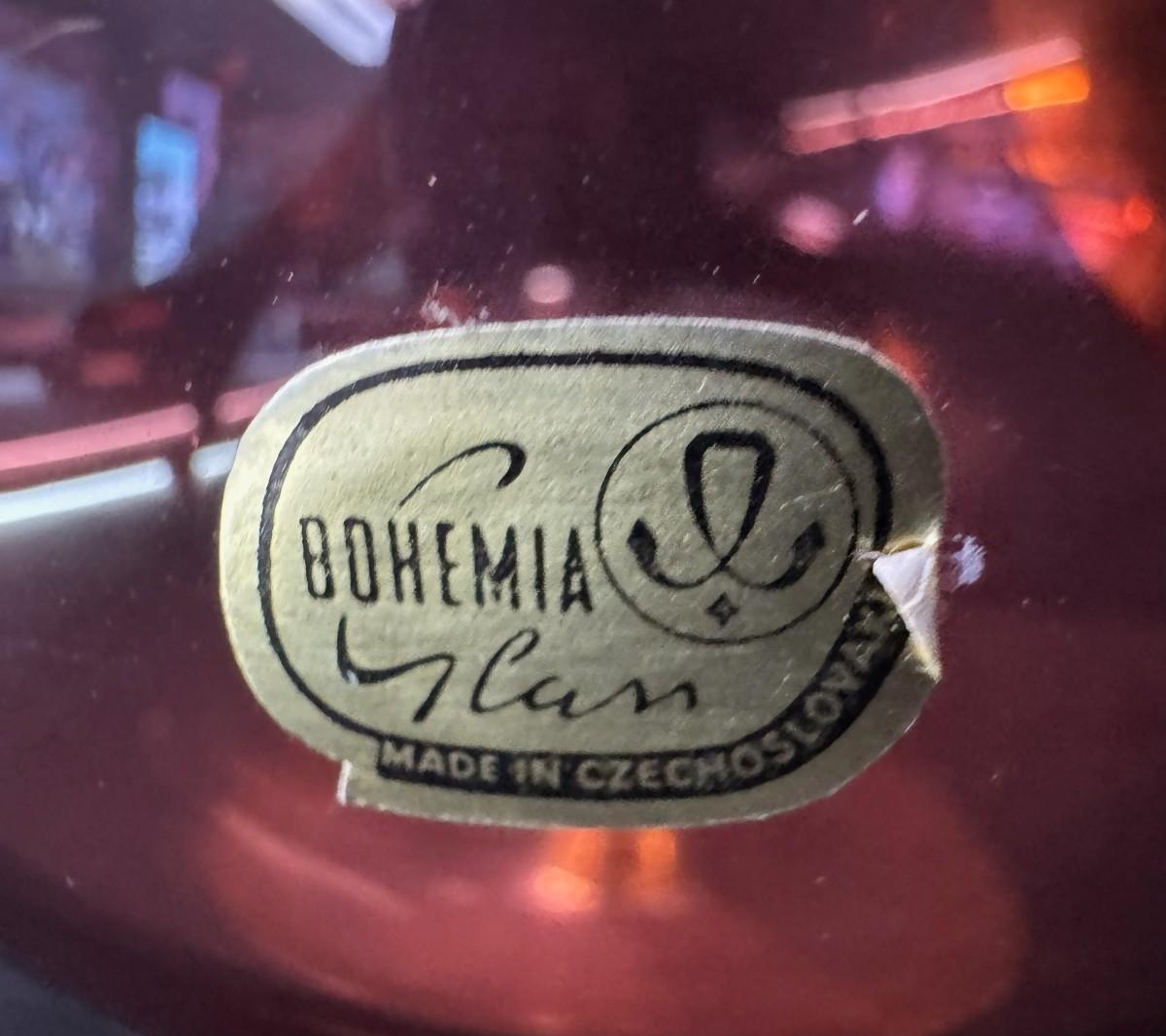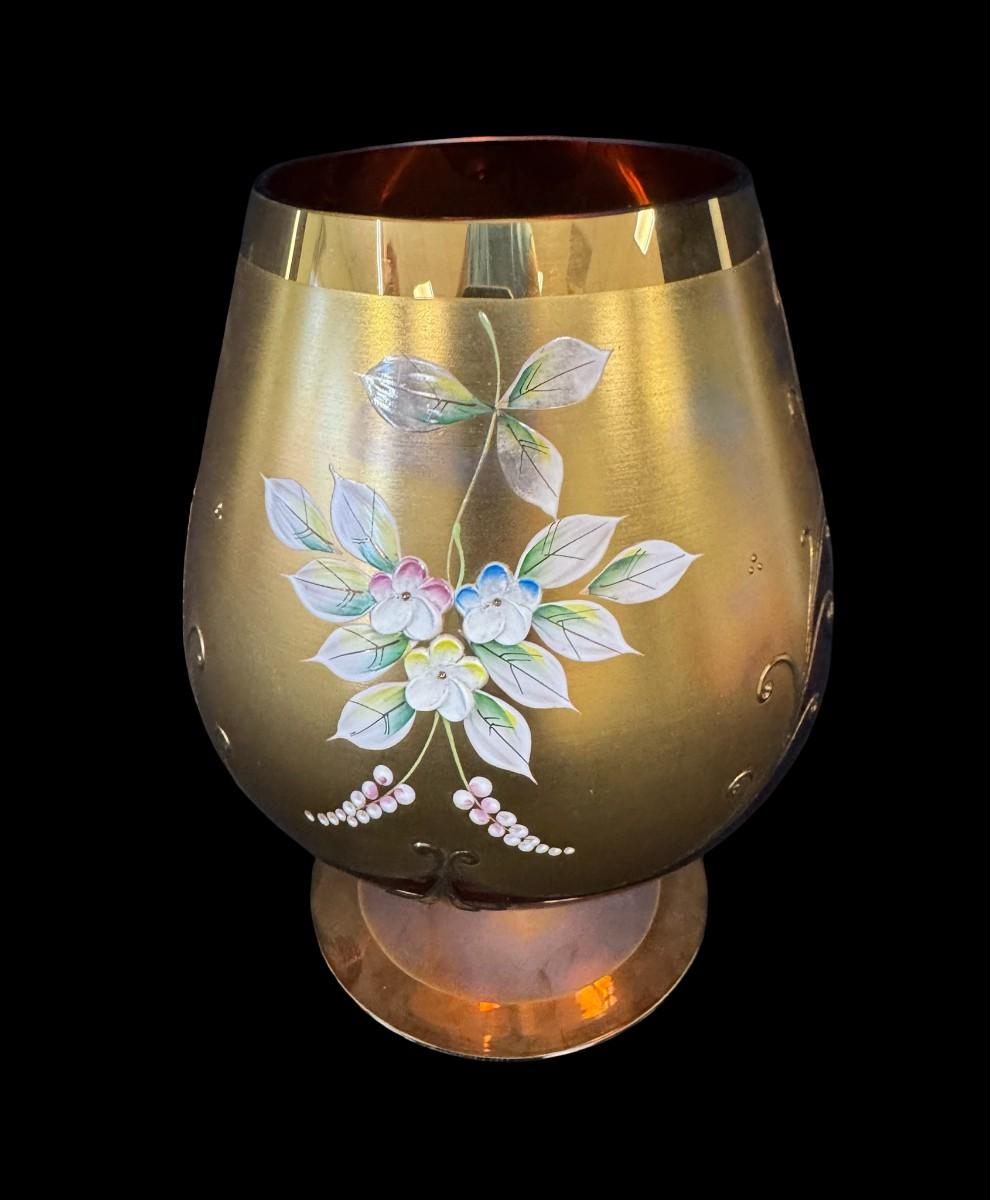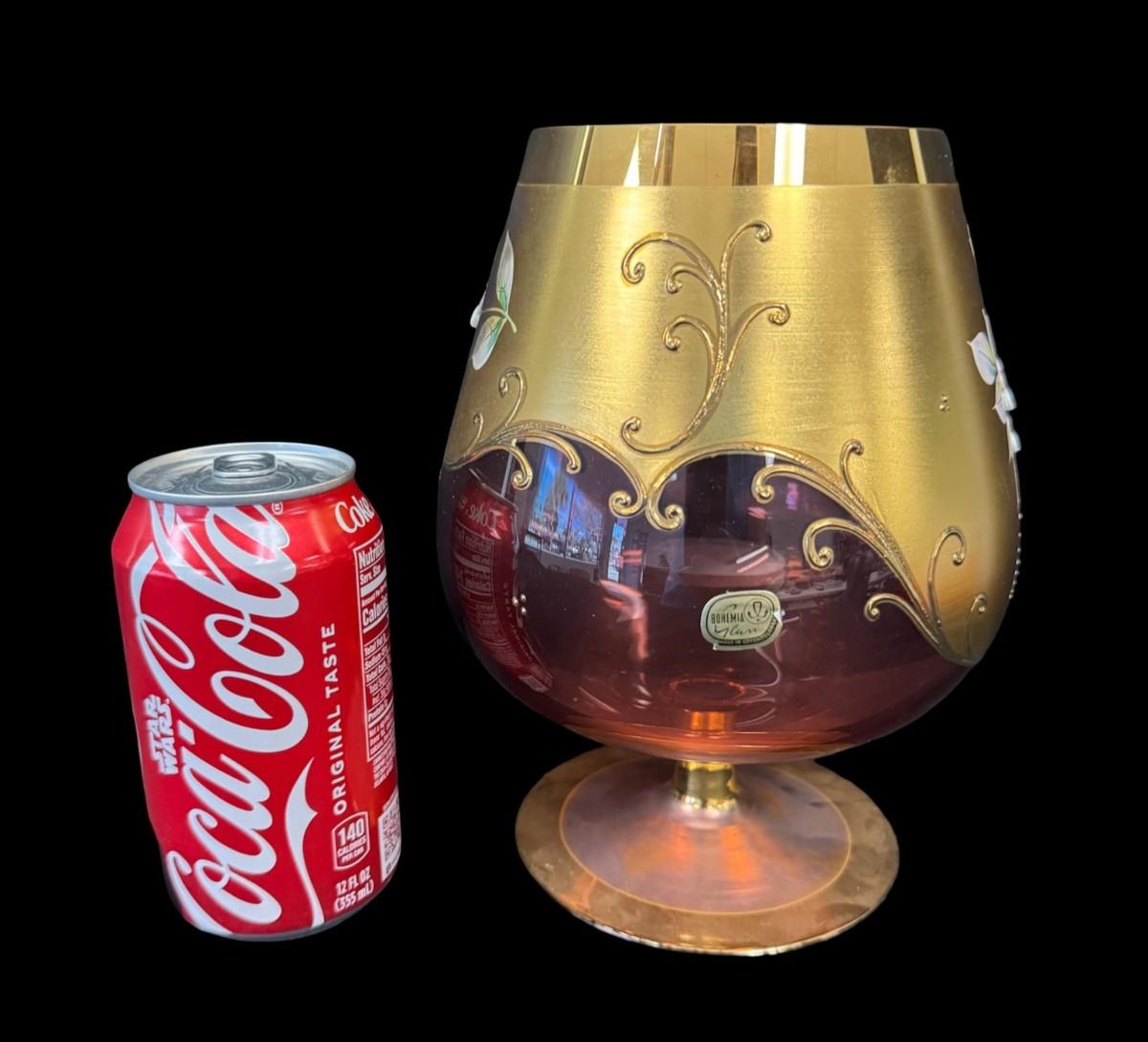 This cranberry glass vase has raised flowers and ornate gold decoration. There is still a paper label affixed. No obvious chips or cracks. Measurement: 8”H x 6” Diameter (at widest point). Pre-auction estimate: $50-$100. [RE]