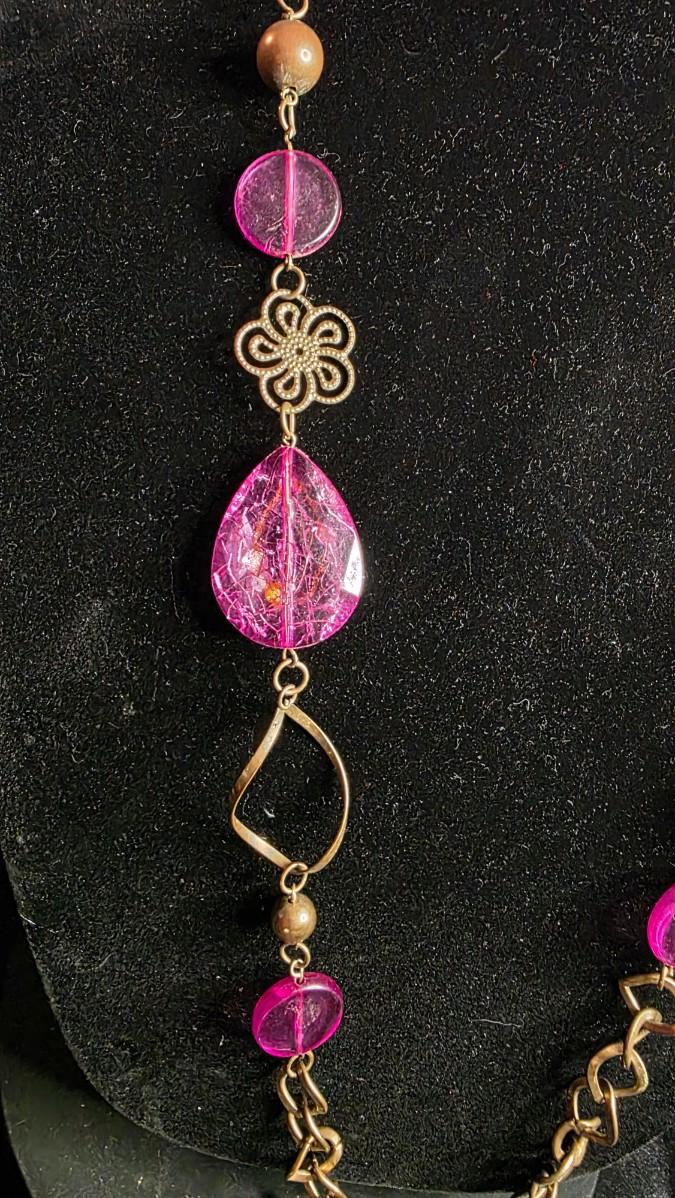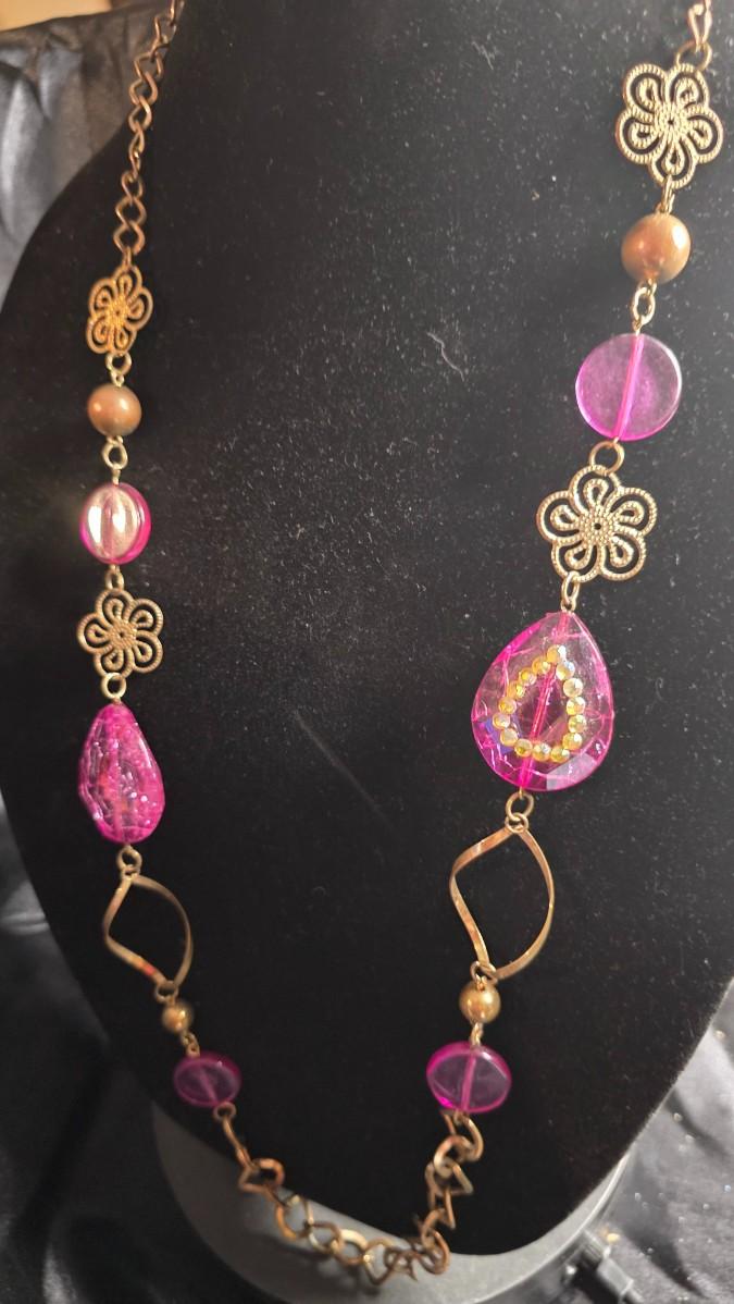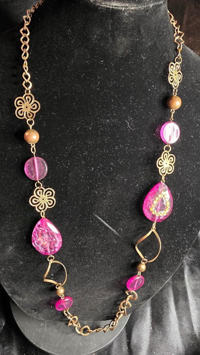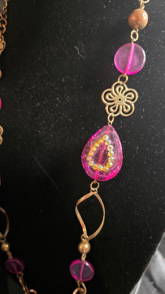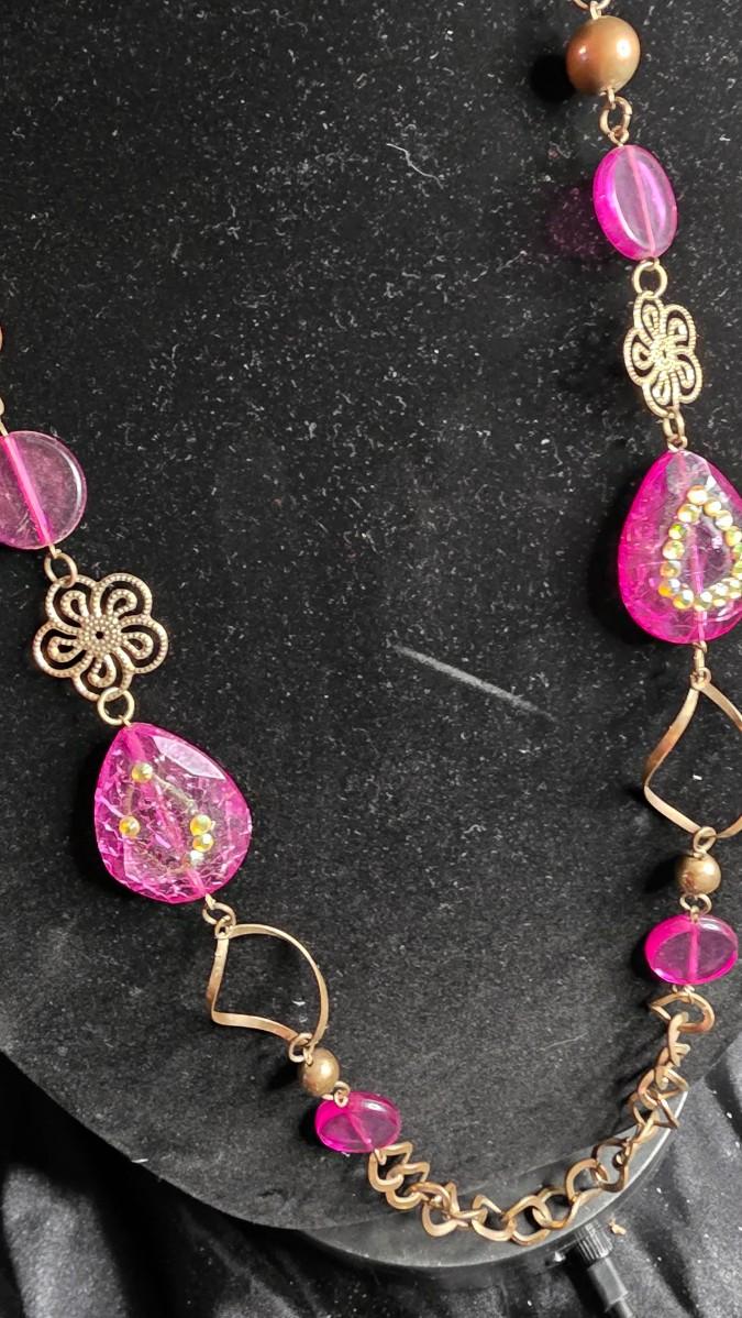 In the blush of a Bohemian twilight, where rose gardens yield to velvet night, a necklace unfurls like a secret garden in bloom—round pink crystal beads strung along a gold tone chain, interspersed with ornate filigree flowers in intricate scrollwork that curl like climbing vines, leading to a teardrop pendant that dangles with embedded sparkle, its faceted surface catching light in playful refractions of rose and gold. The chain's gentle links and lobster clasp secure the piece with quiet assurance, letting it drape close to the collarbone in a cascade of whimsy that feels both wild and refined, evoking the free-spirited elegance of 1970s boho wanderers and their love for pieces that move with the soul.