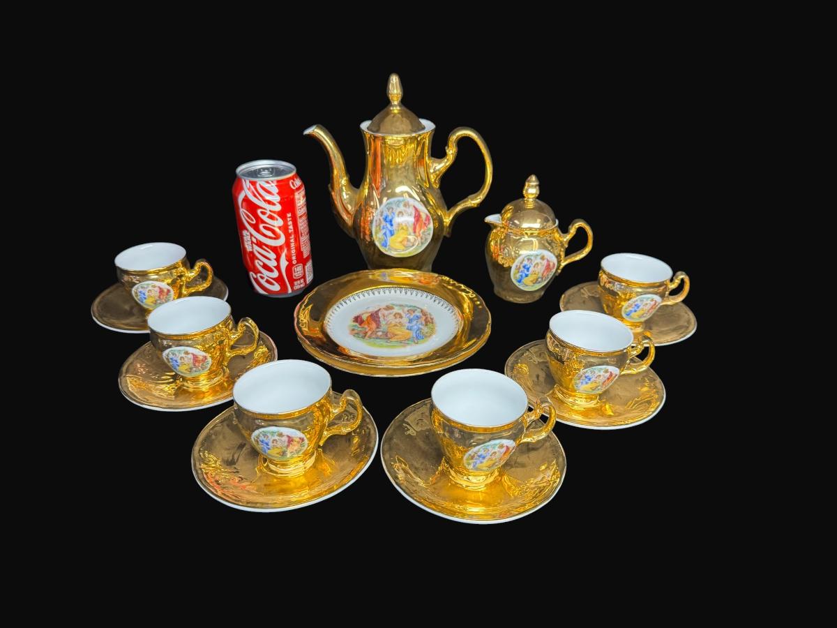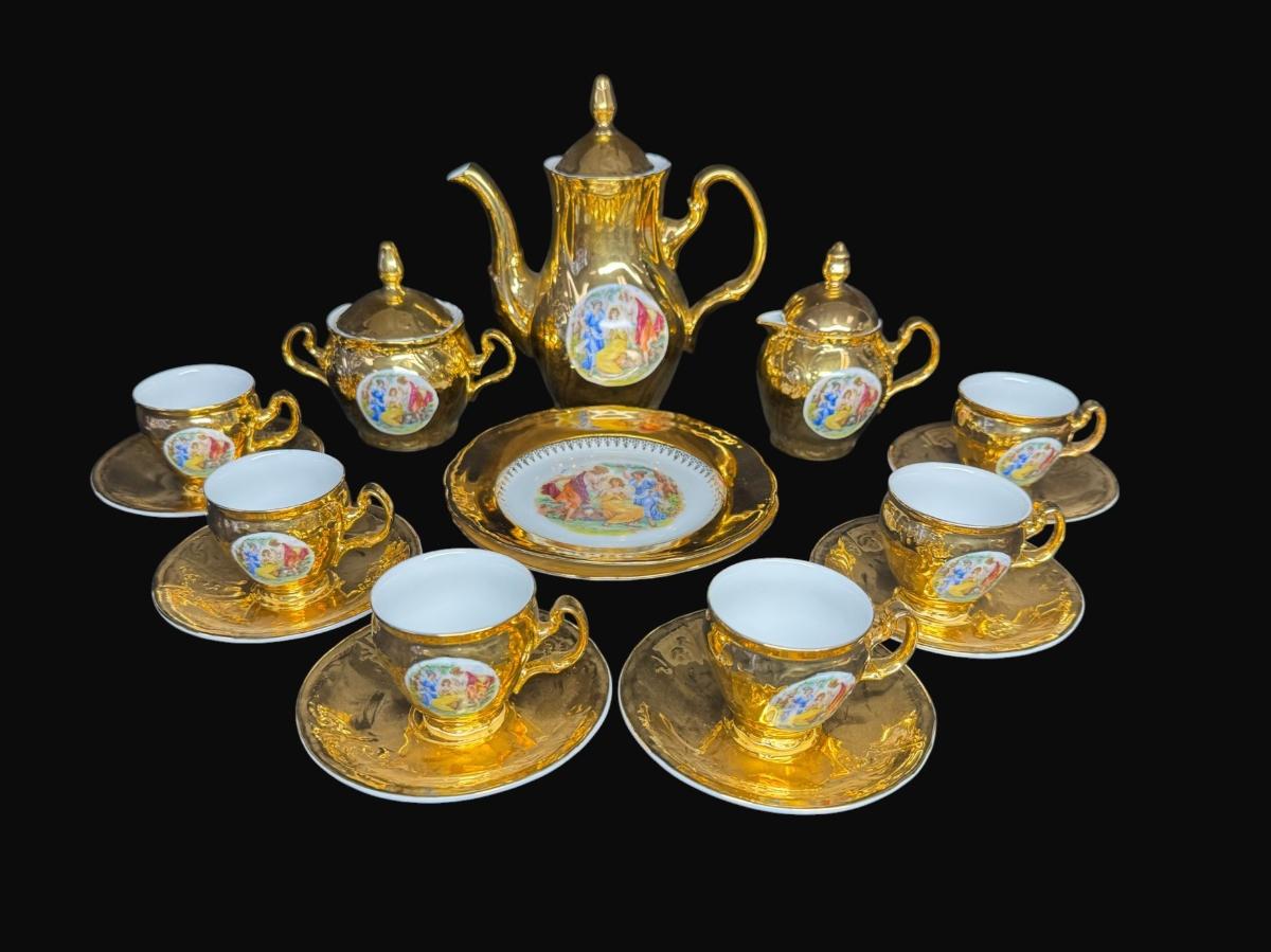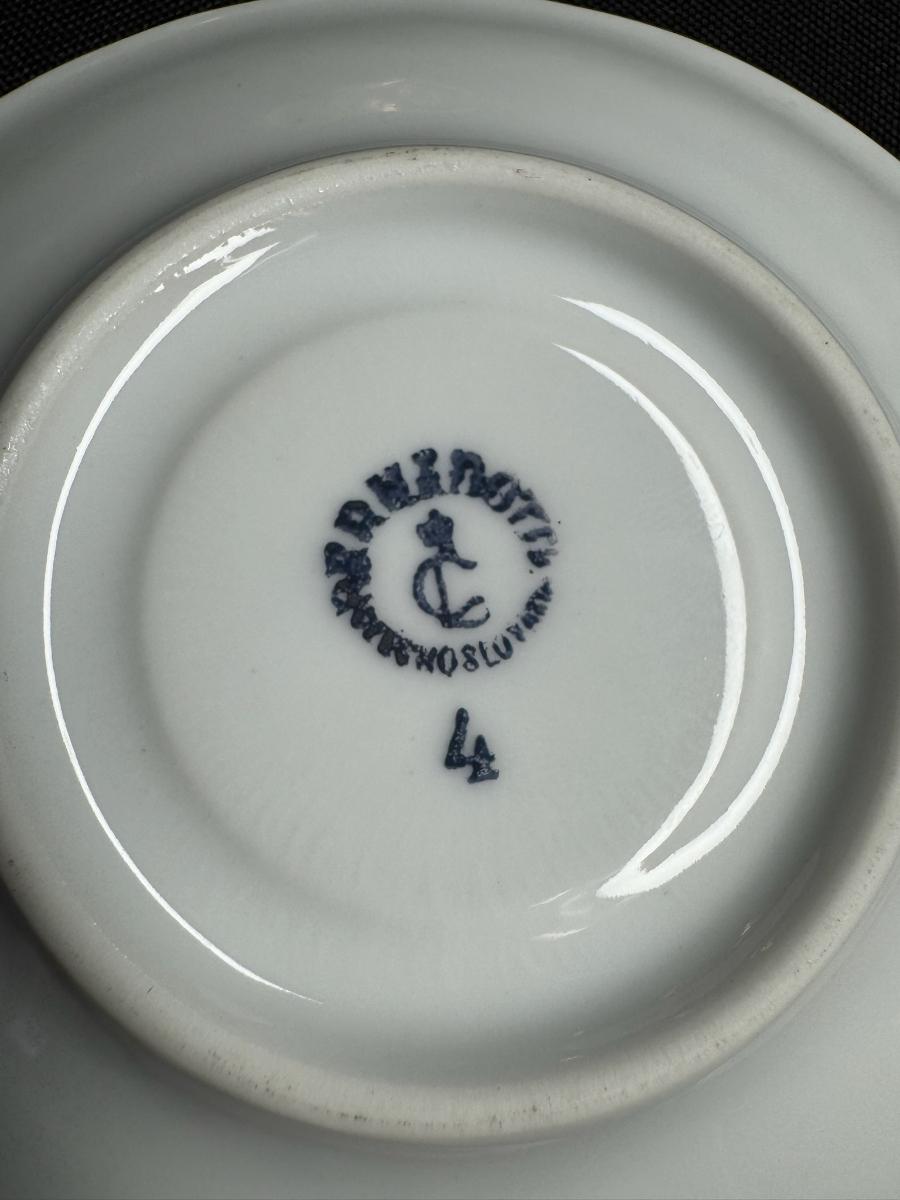 Made by Bernadotte of Czechoslovakia. Set includes teapot, creamer and sugar, cup, saucer, bread plates, and more. [RE]