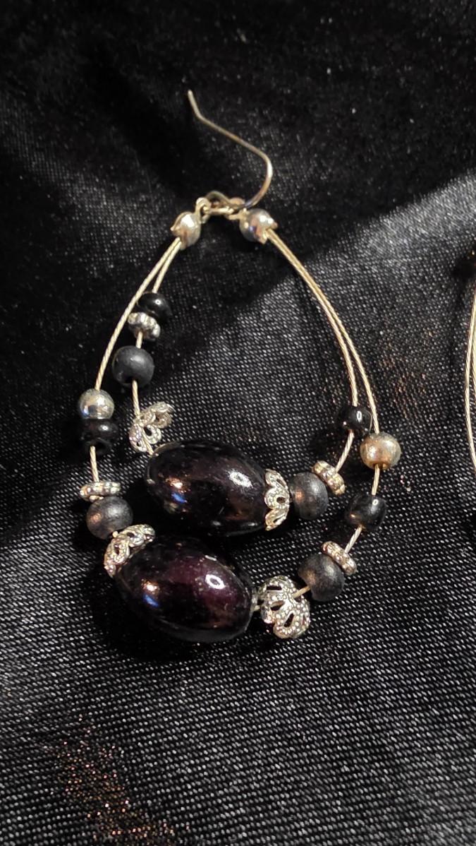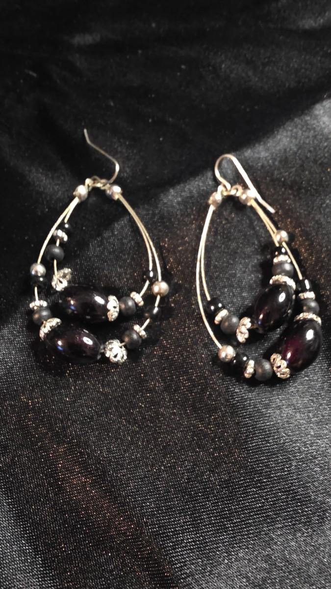 Two delicate wire arches create movement and shape, giving the earrings a graceful sway with every turn of the head. The interplay between the dark beads and the polished metallic elements feels both earthy and luxurious, making these earrings versatile enough for a candlelit evening, a night out, or a moment when you simply want to feel beautifully adorned.