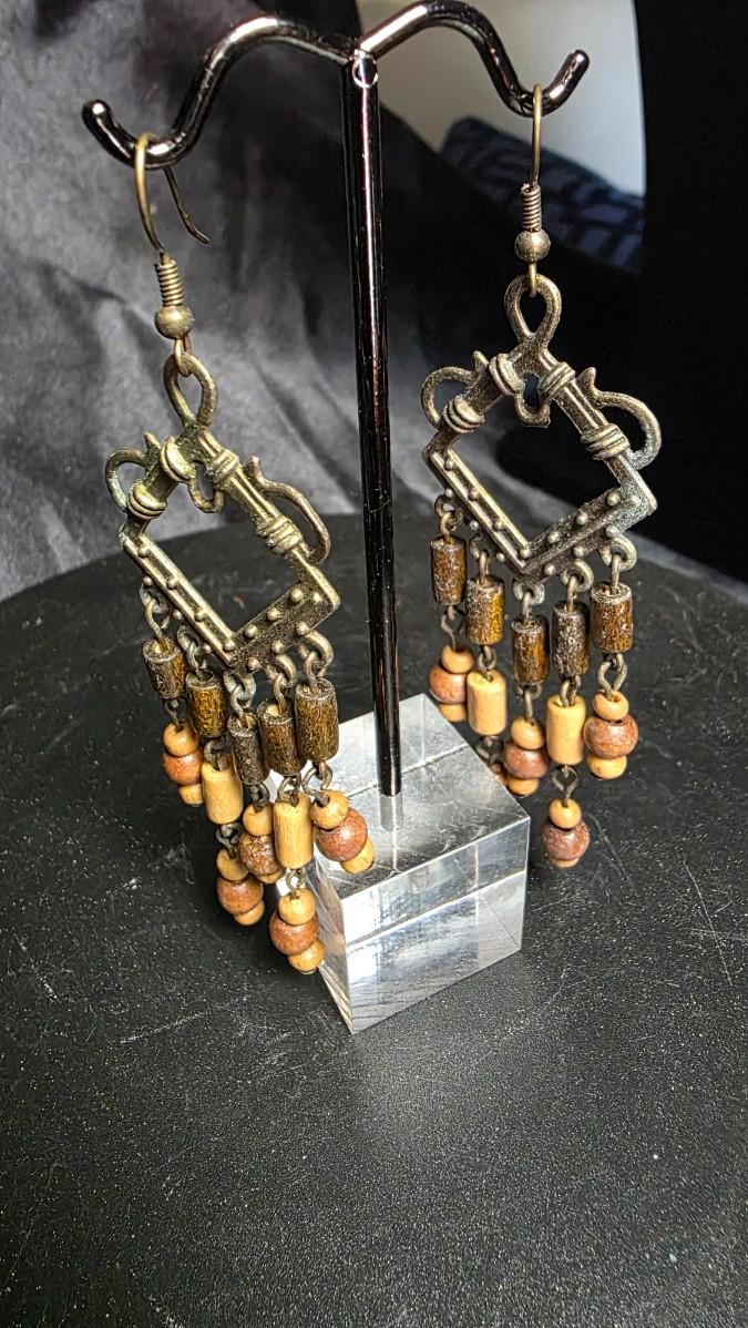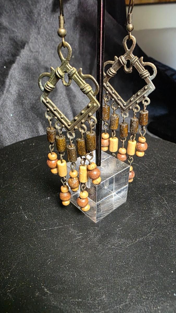 There is something deeply grounding about jewelry that feels collected rather than manufactured, and these earrings carry that energy effortlessly. The aged metal framework shows time-earned character, forming a geometric silhouette that feels both architectural and organic. From each frame, warm wooden beads cascade gently, creating soft movement with every step and a quiet rhythm that feels almost ceremonial.
