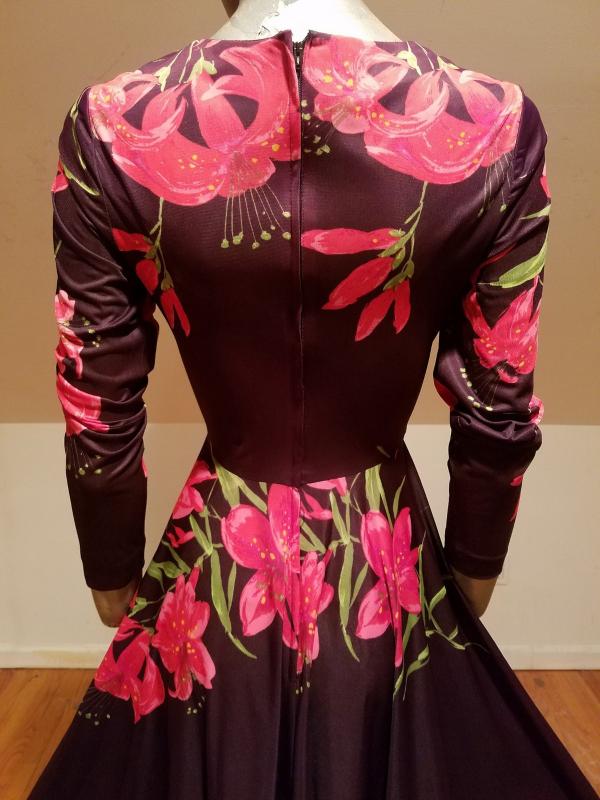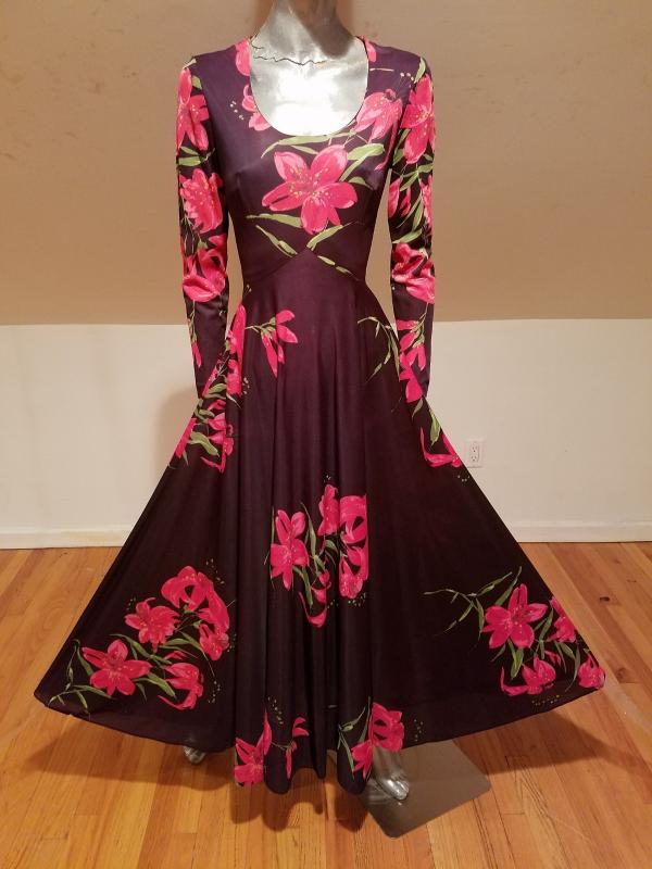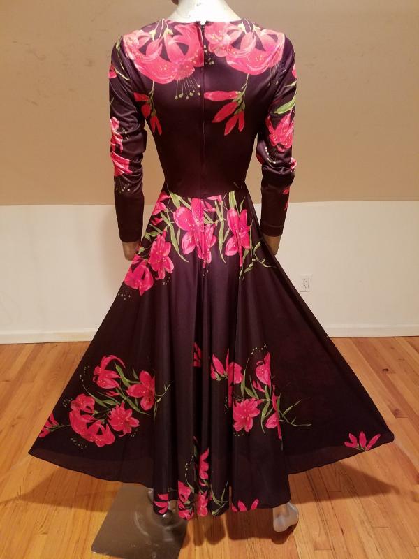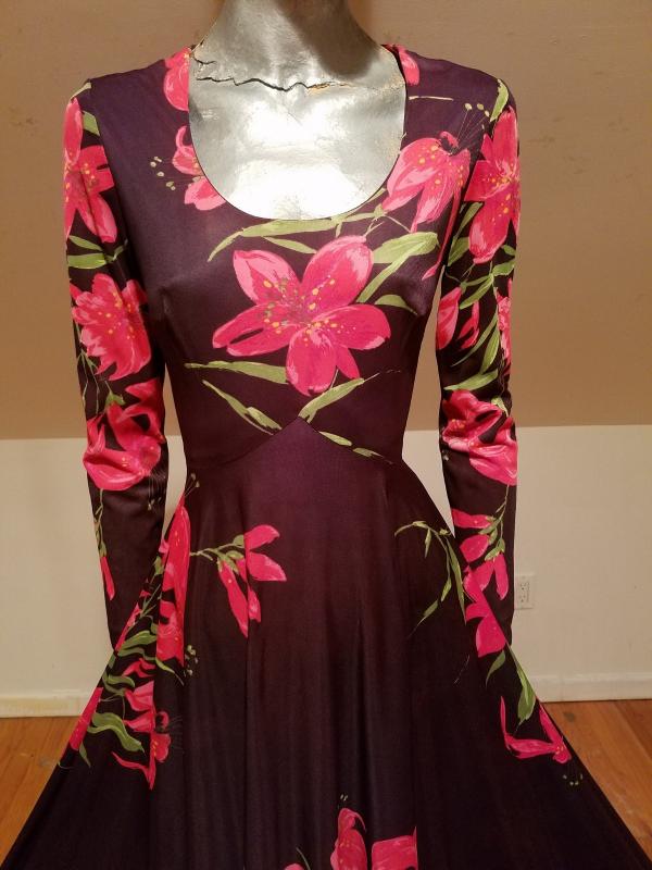 What a gorgeous 1970's maxi dress this one . Coco background with amazing red/pink floral lilly throughout. It is a jersey fluid fabric with stunning details.Fluid like a Princess dream.