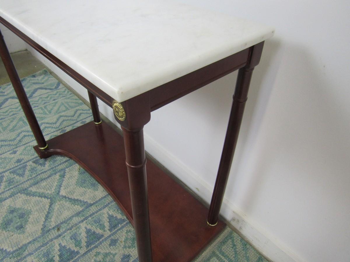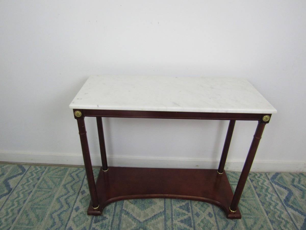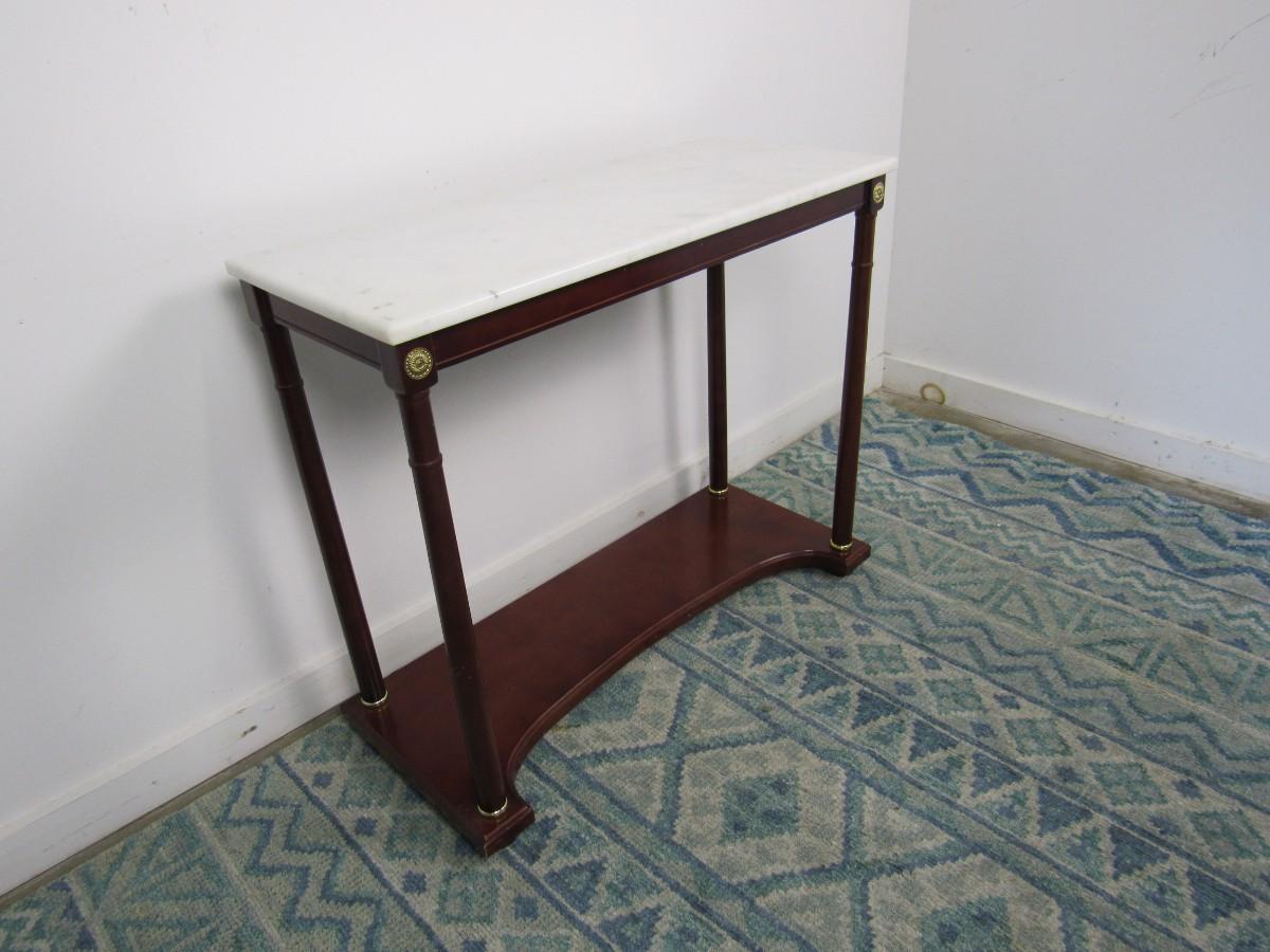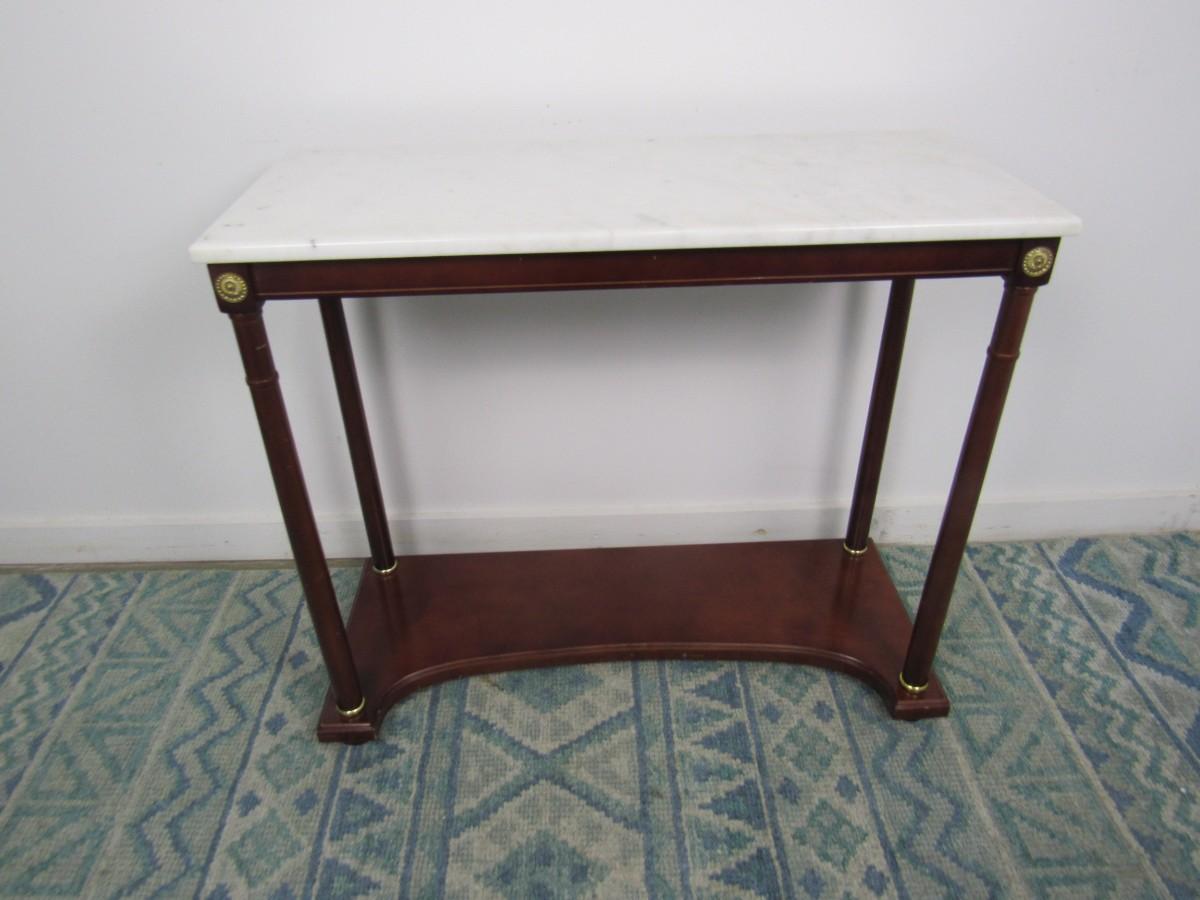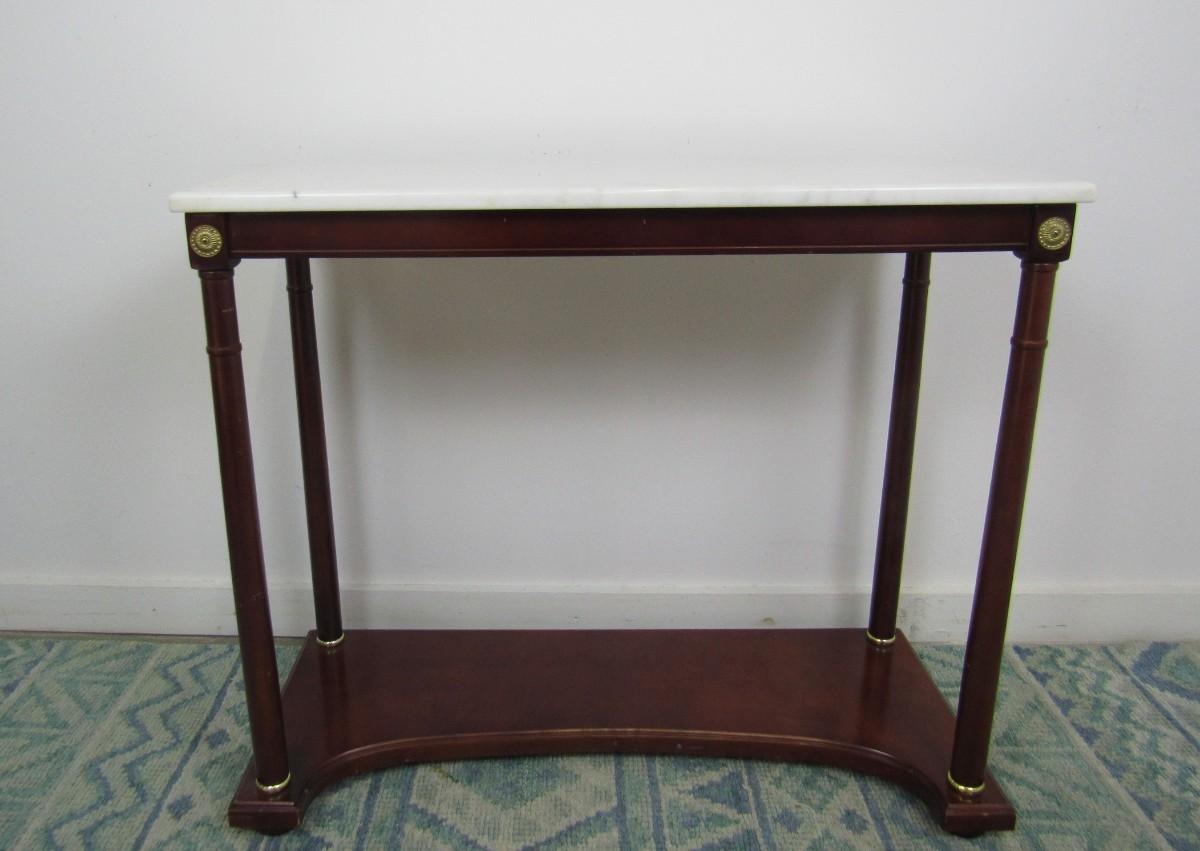 Vintage neoclassical style Bombay Co console table made from mahogany with white marble top. 35 1/4" wide x 15" deep x 30" high. Very good condition with minor scratches here and there, marble is intact.