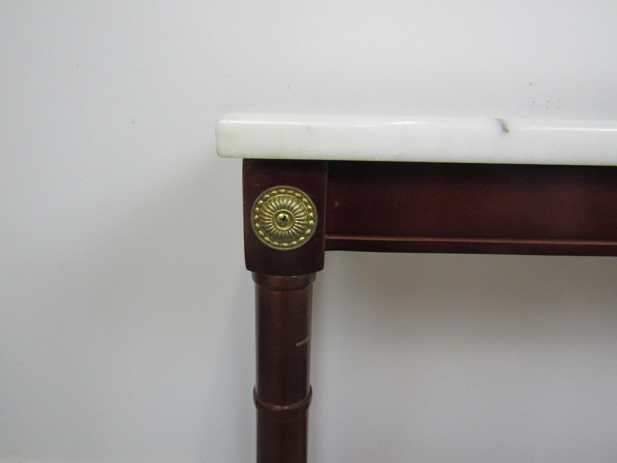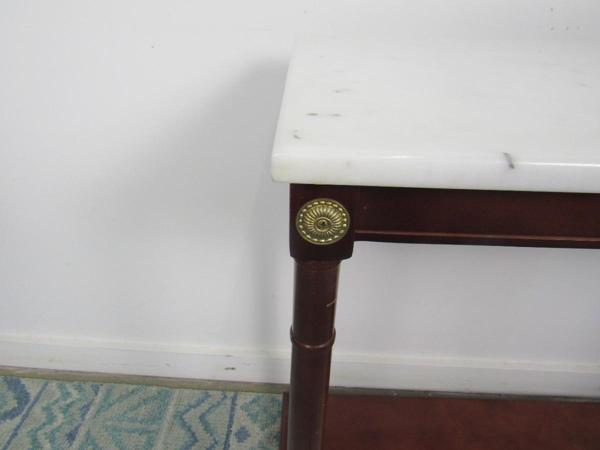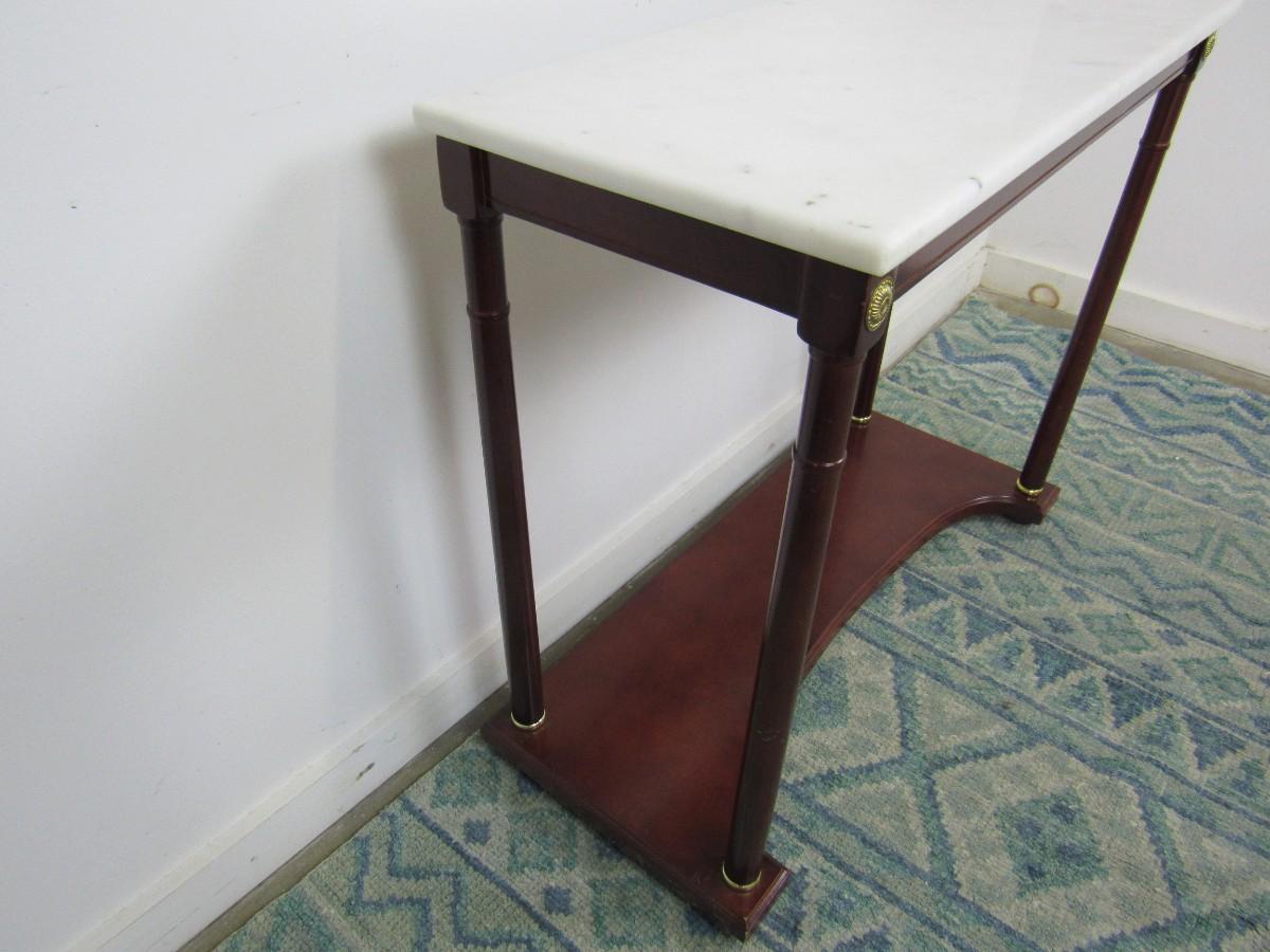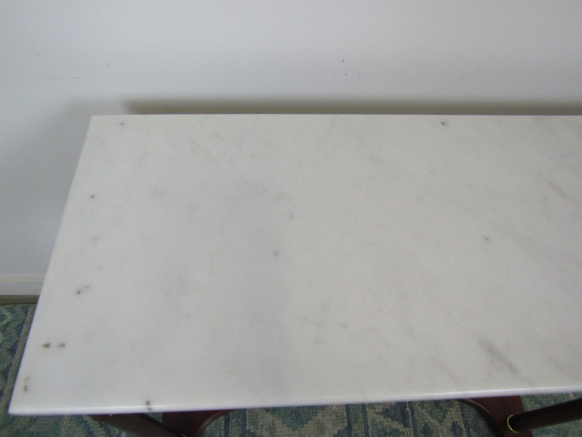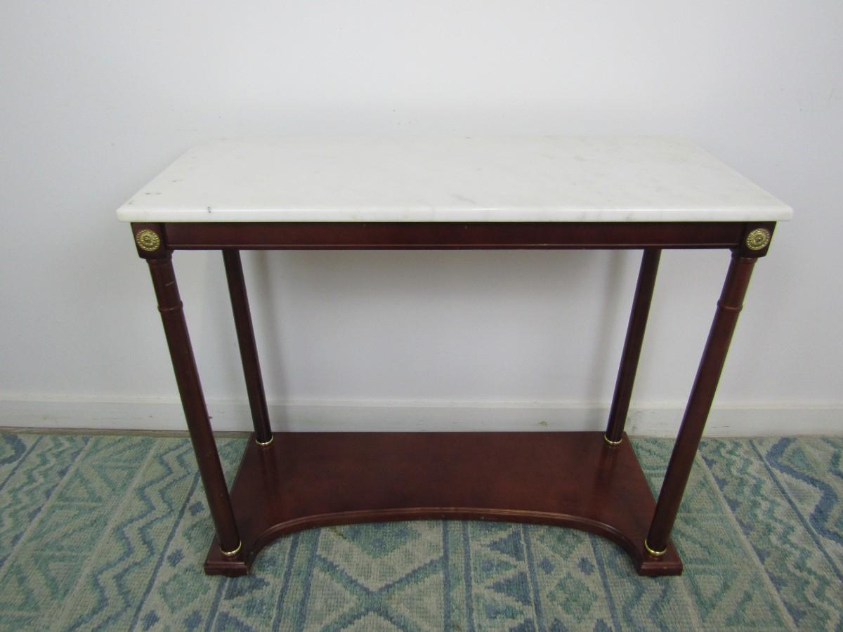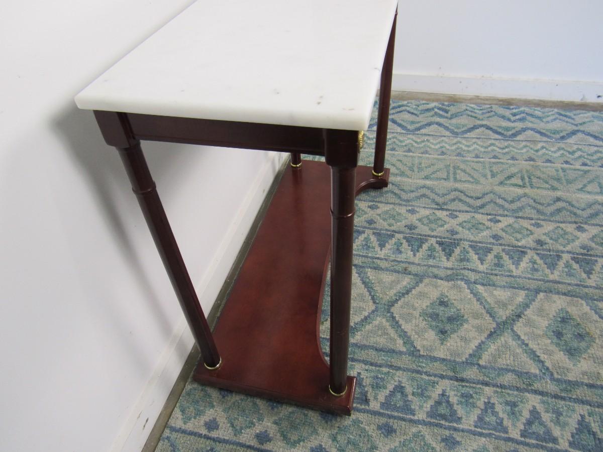 Vintage neoclassical style Bombay Co console table made from mahogany with white marble top. 35 1/4" wide x 15" deep x 30" high. Very good condition with minor scratches here and there, marble is intact.
