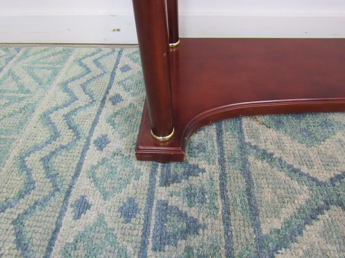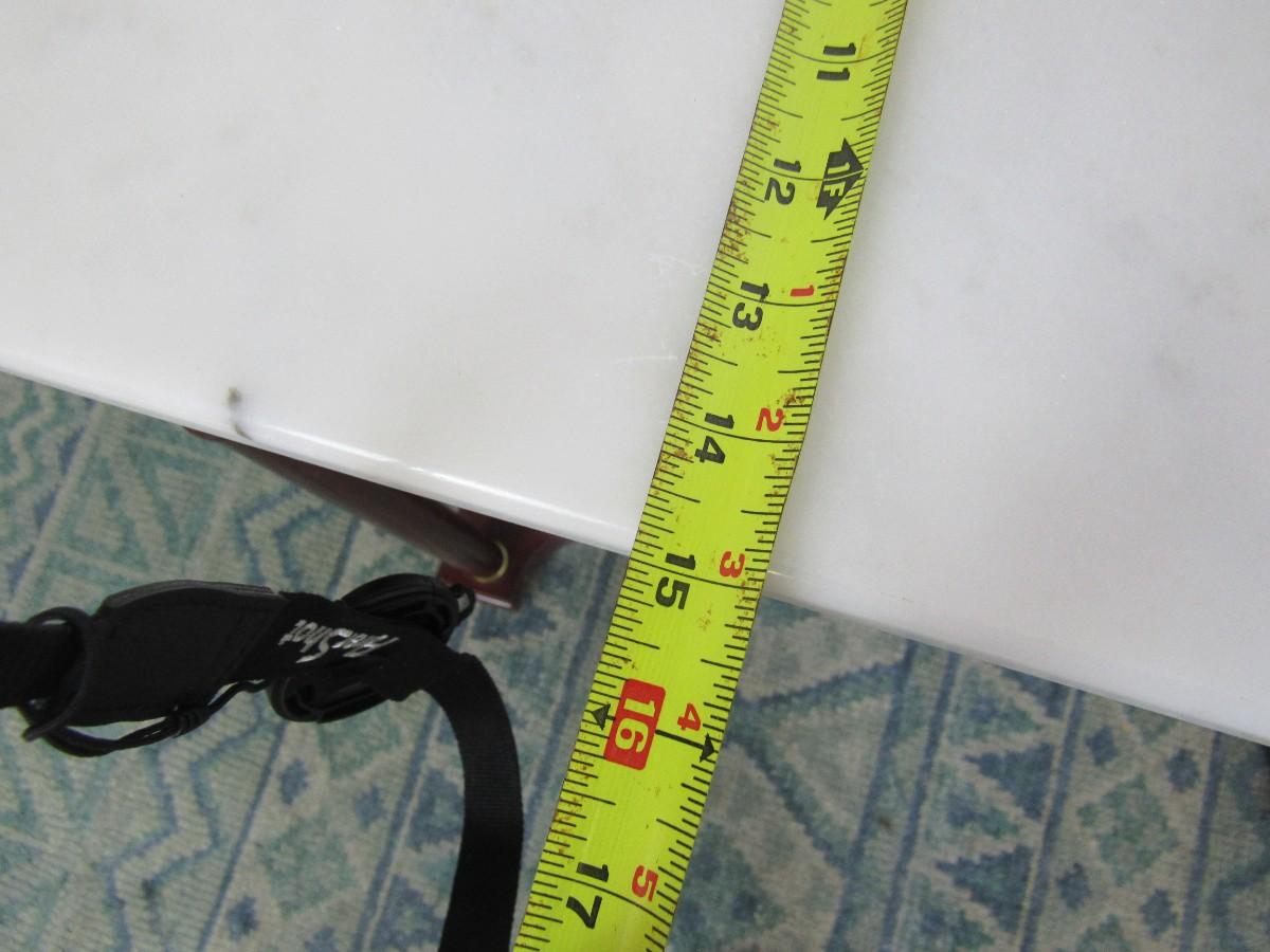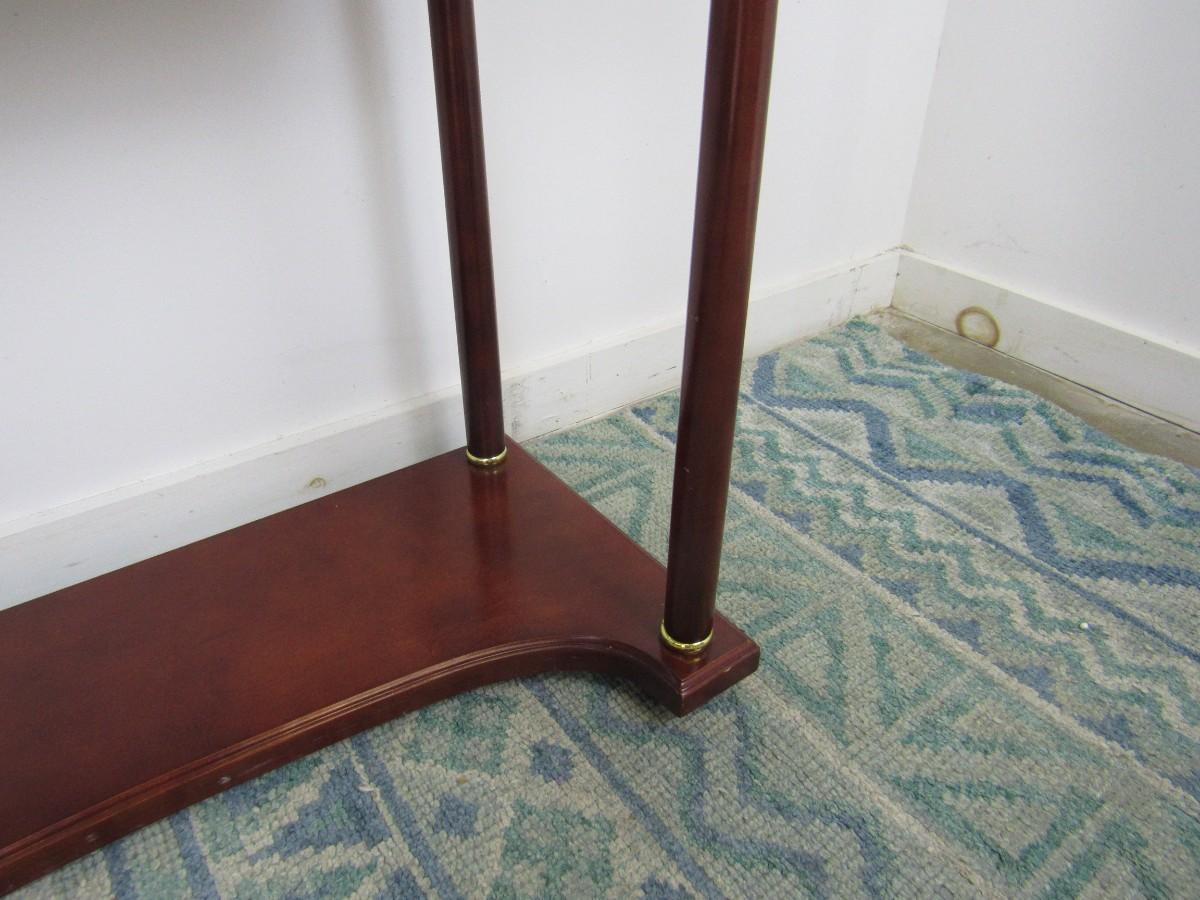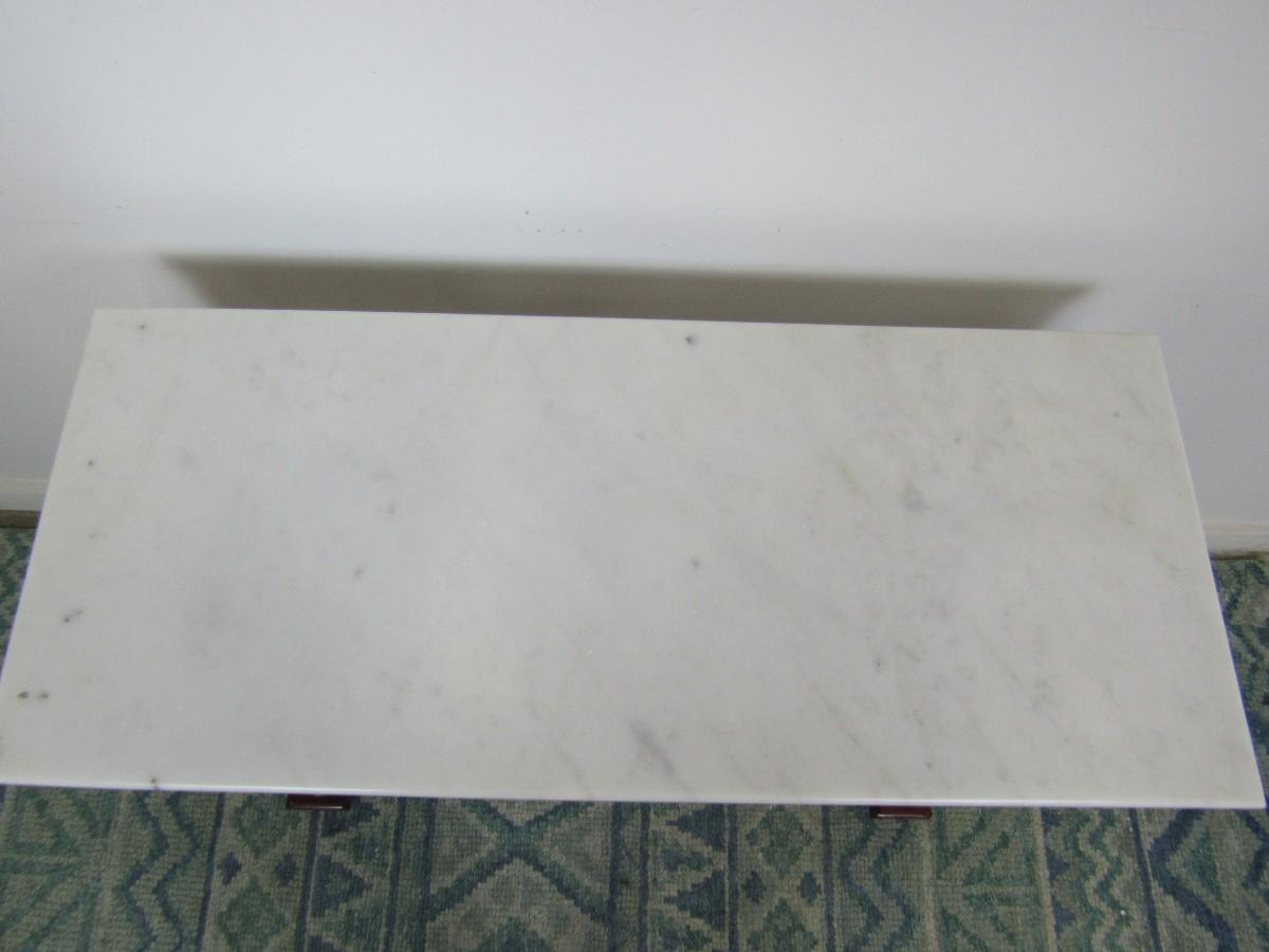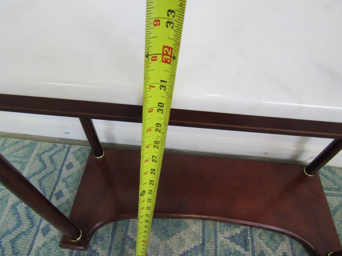 Vintage neoclassical style Bombay Co console table made from mahogany with white marble top. 35 1/4" wide x 15" deep x 30" high. Very good condition with minor scratches here and there, marble is intact.