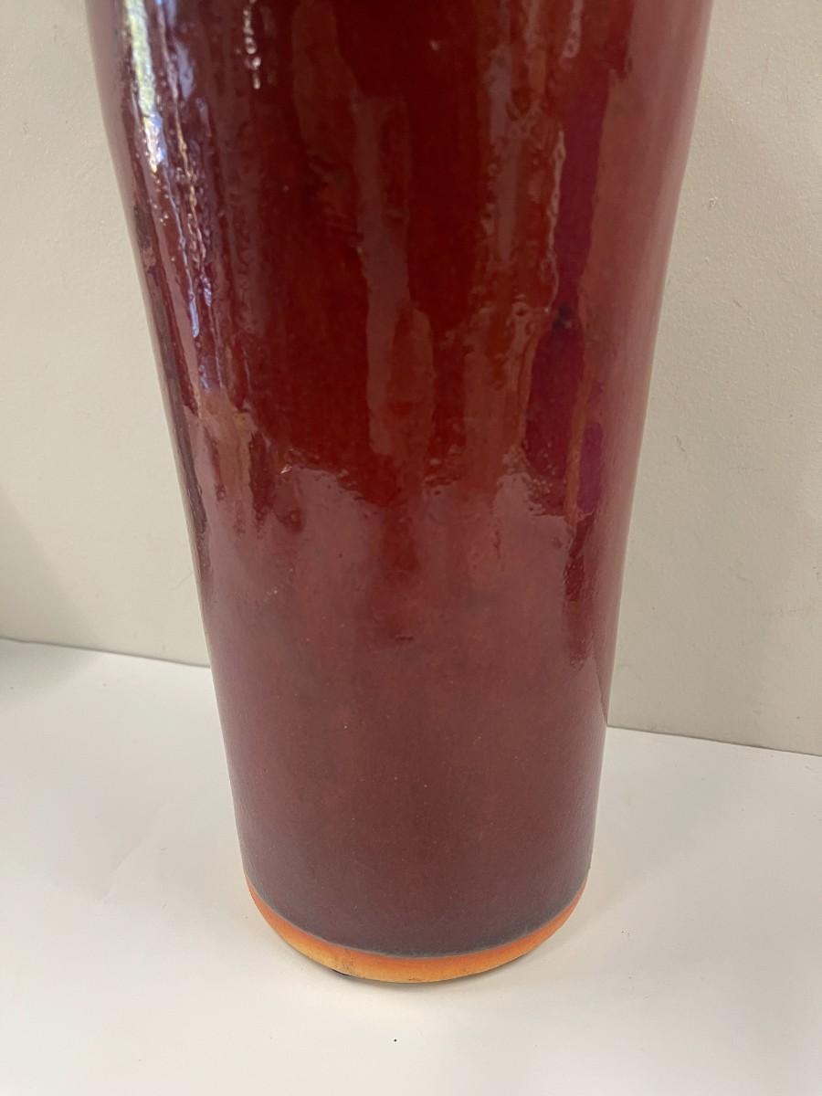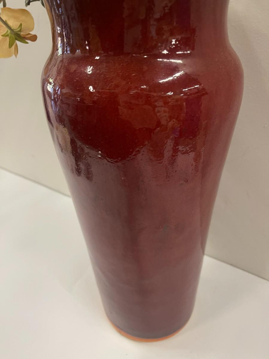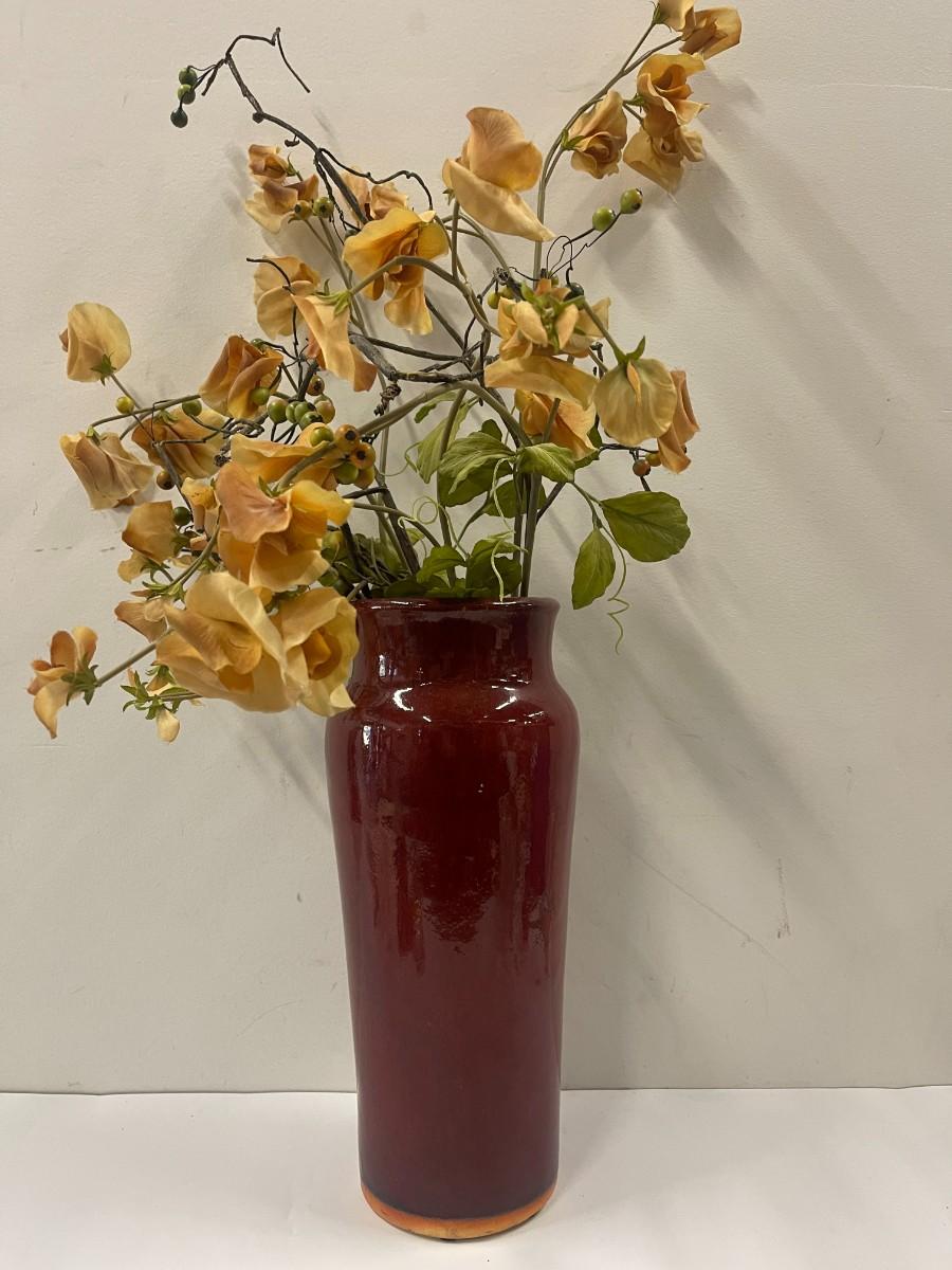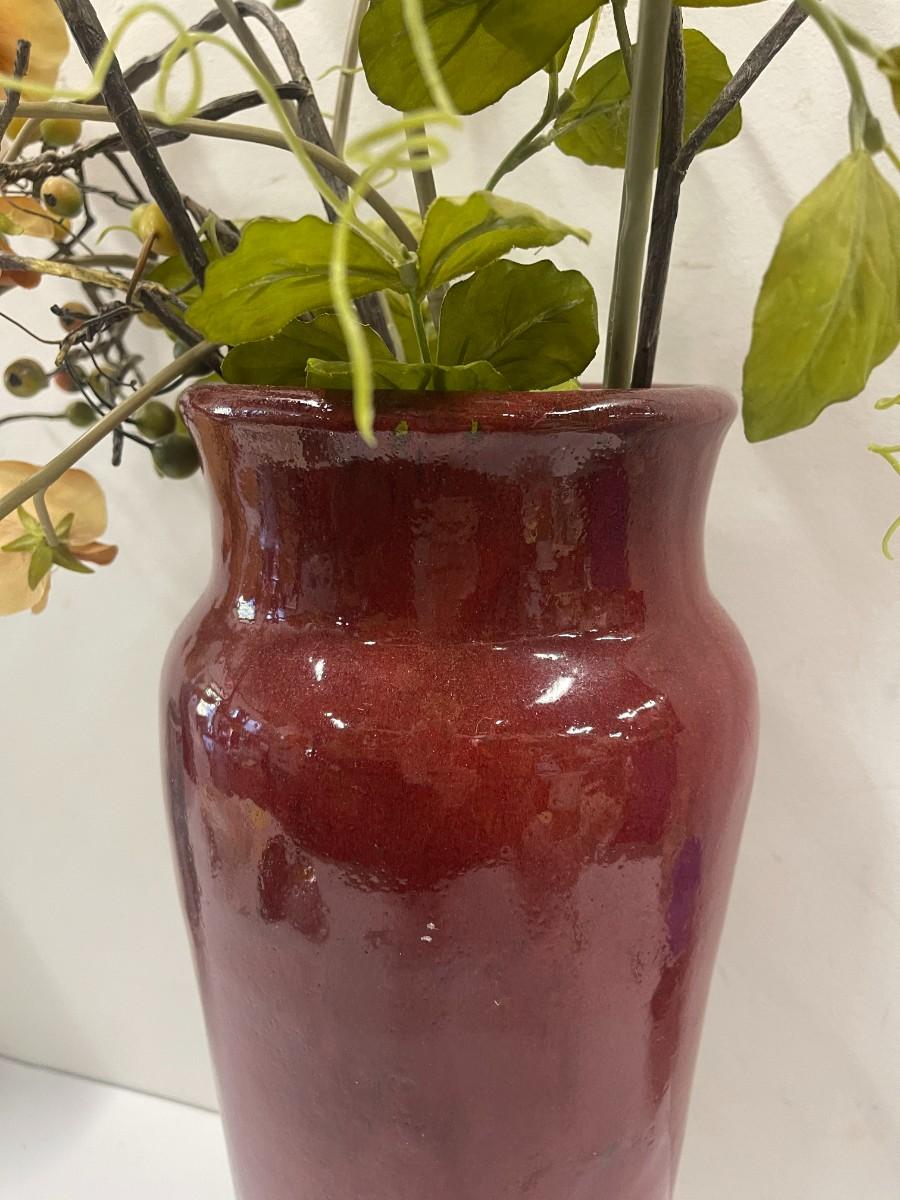 Vintage Bombay co oxblood vase with artificial flower arrangement. Vase is 15" tall x 6" wide. Excellent condition.