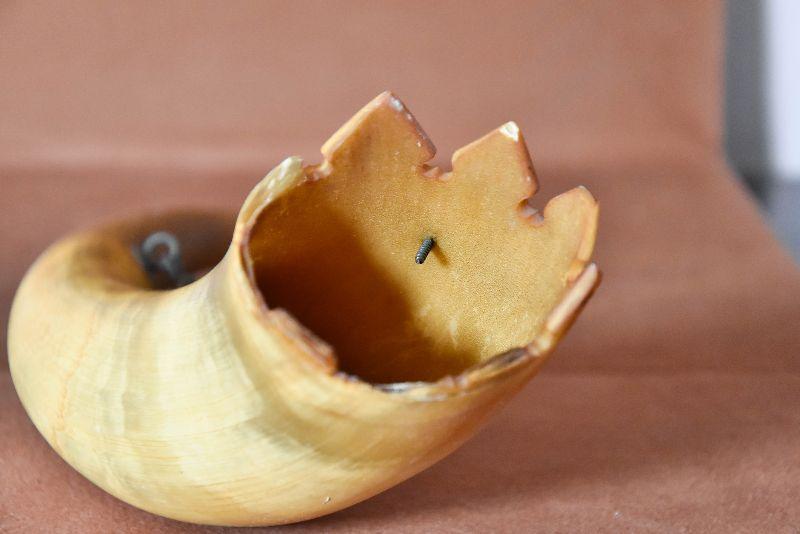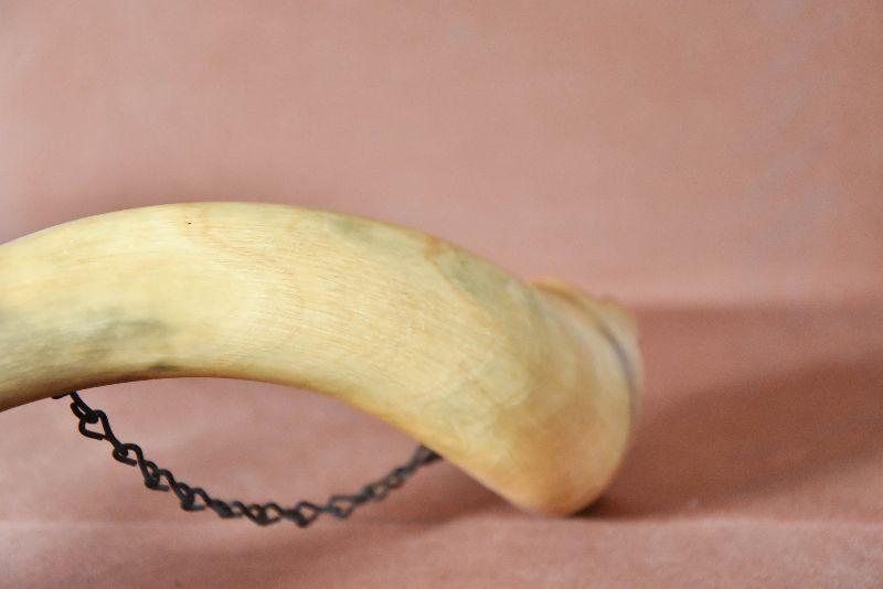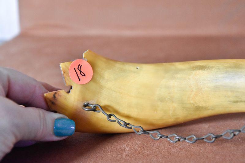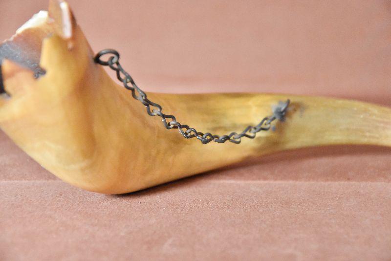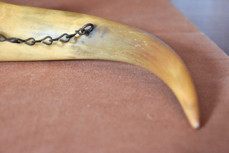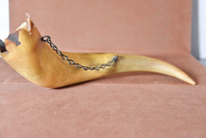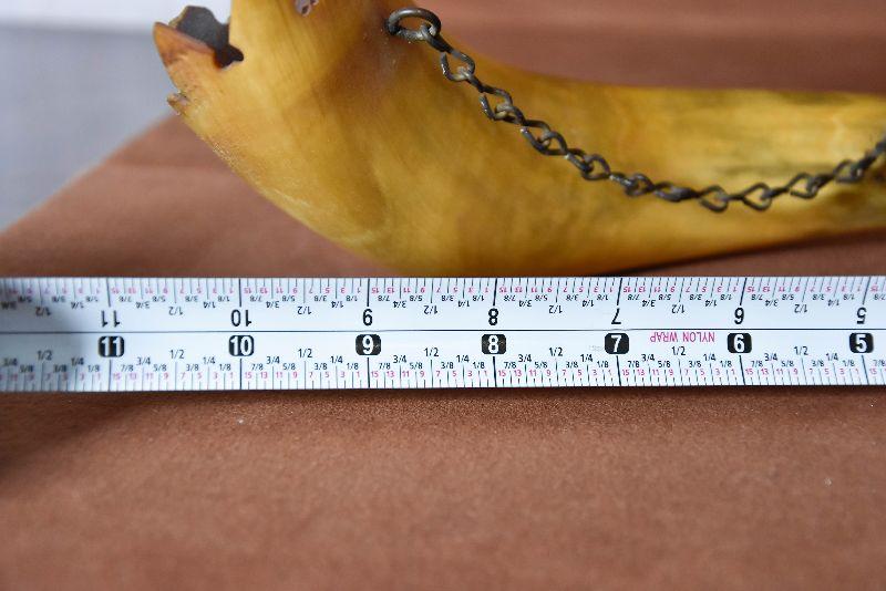 11" in length with chain. Some of the carving at the top is broken off. Still a very unique piece.