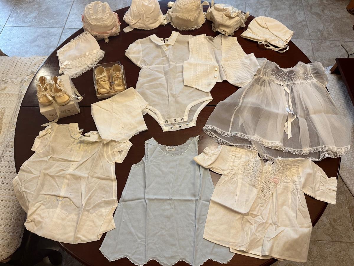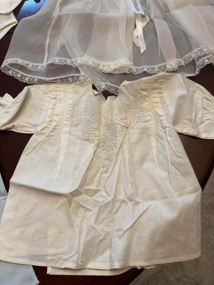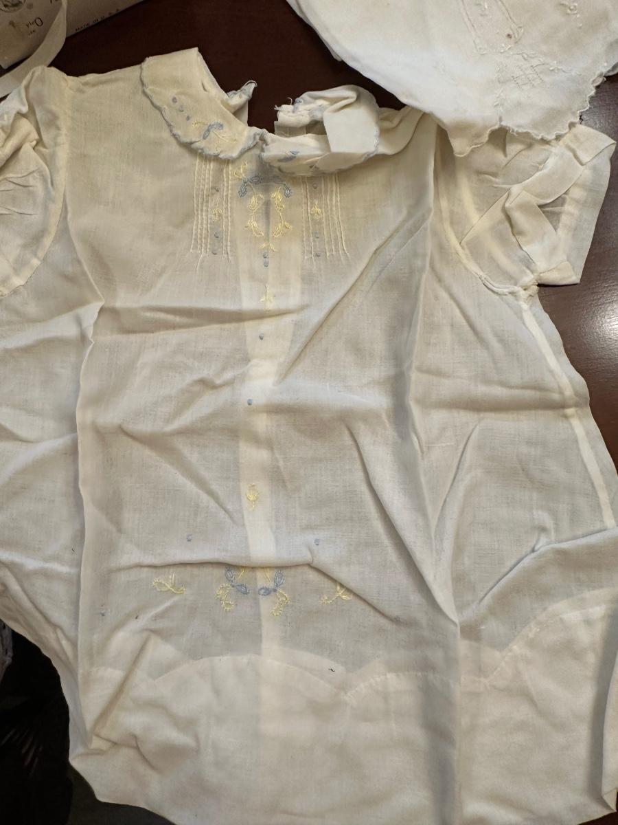 No stains. All beautiful handmade infant outfits, shoes (size 0) and bonnets.