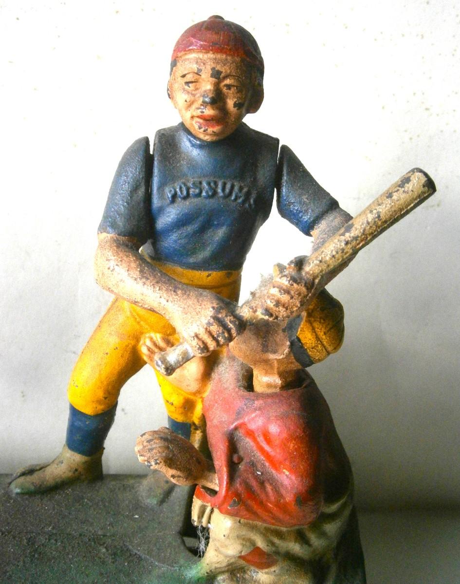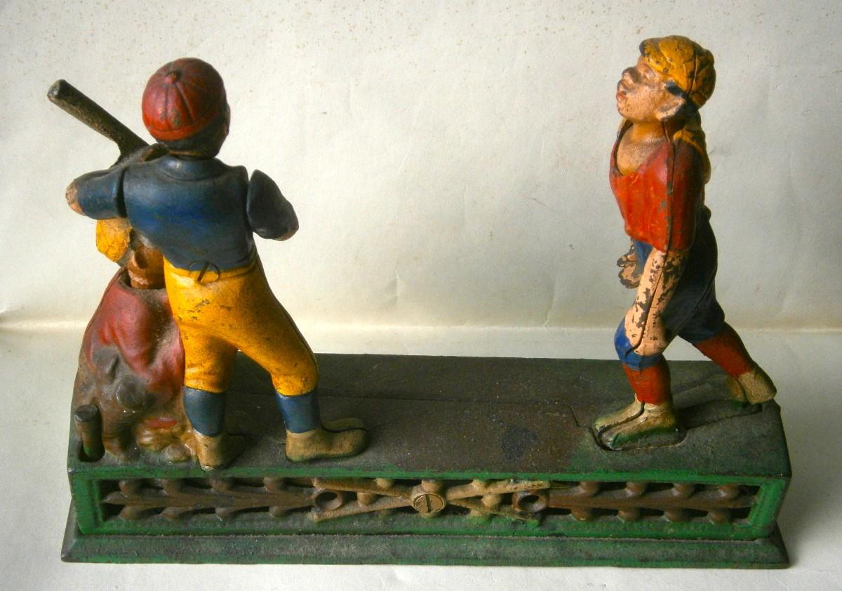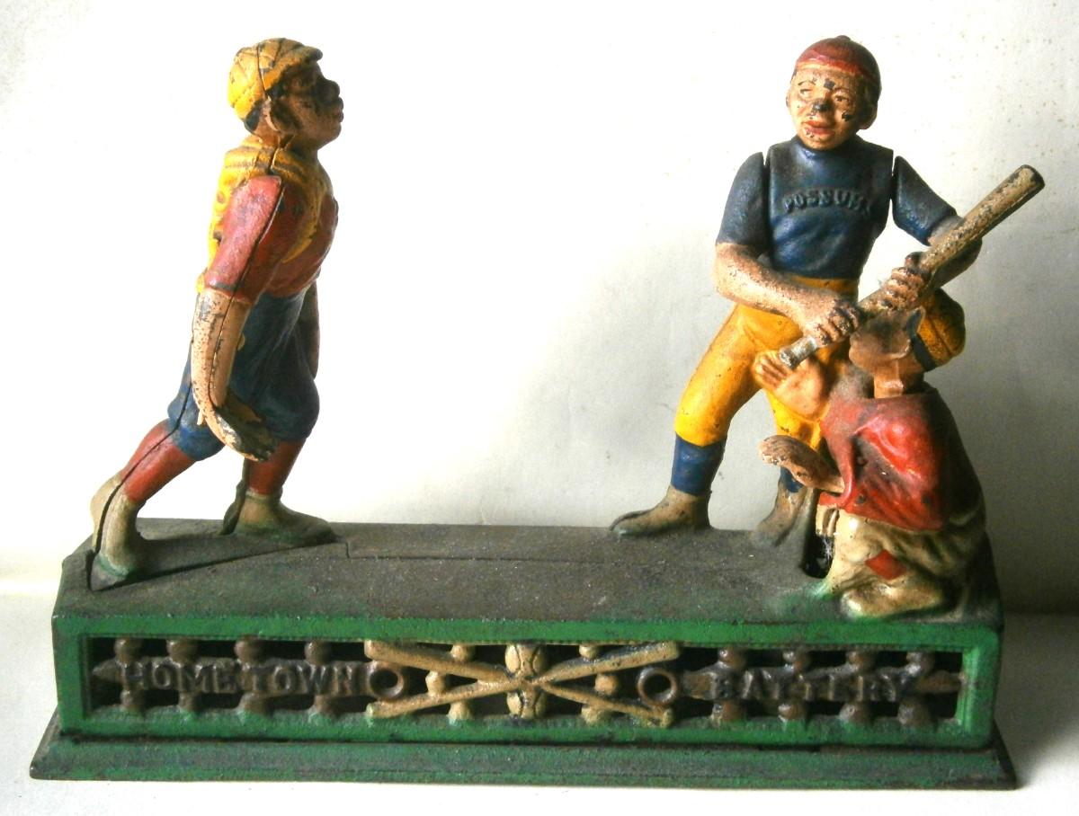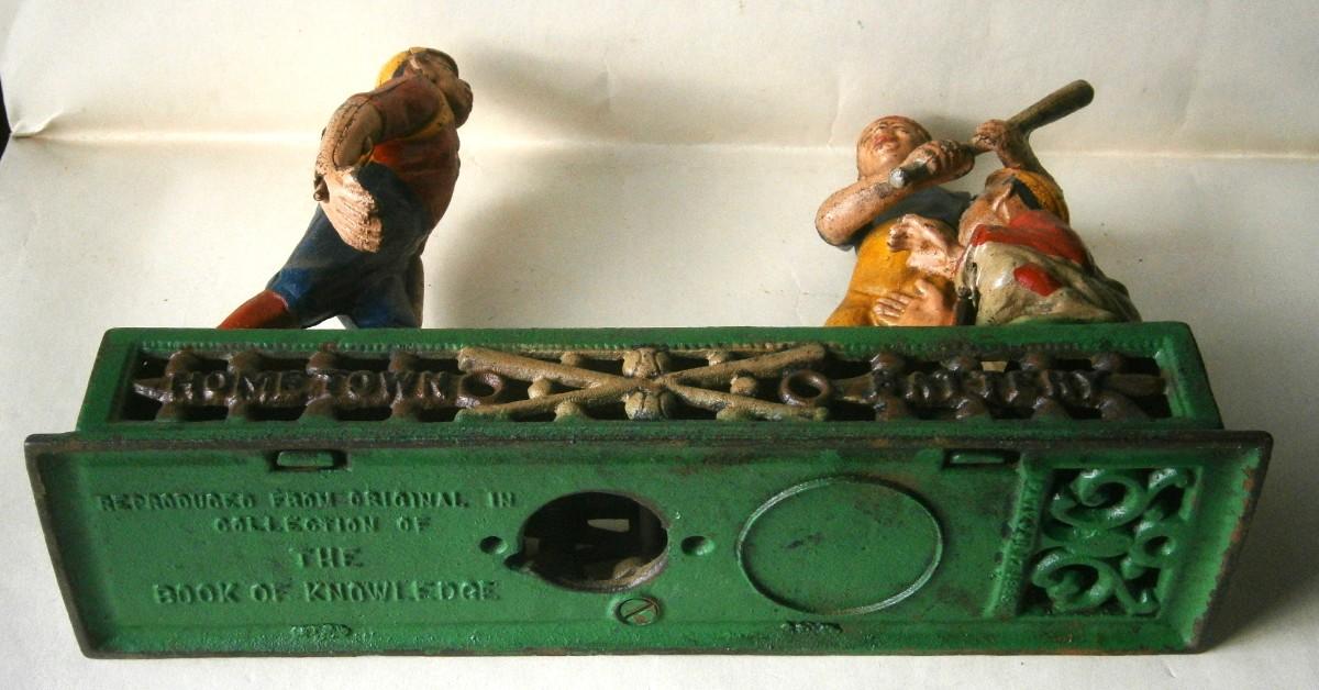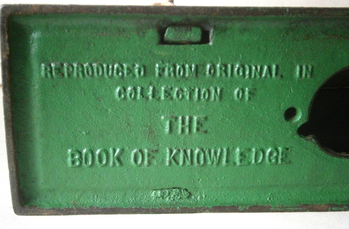 Vintage Book of Knowledge “Hometown Battery” cast iron mechanical bank. Circa 1960's-70's, 9 1/2 in. long, missing trap otherwise complete, not working properly - arm does not lock when loading coin.