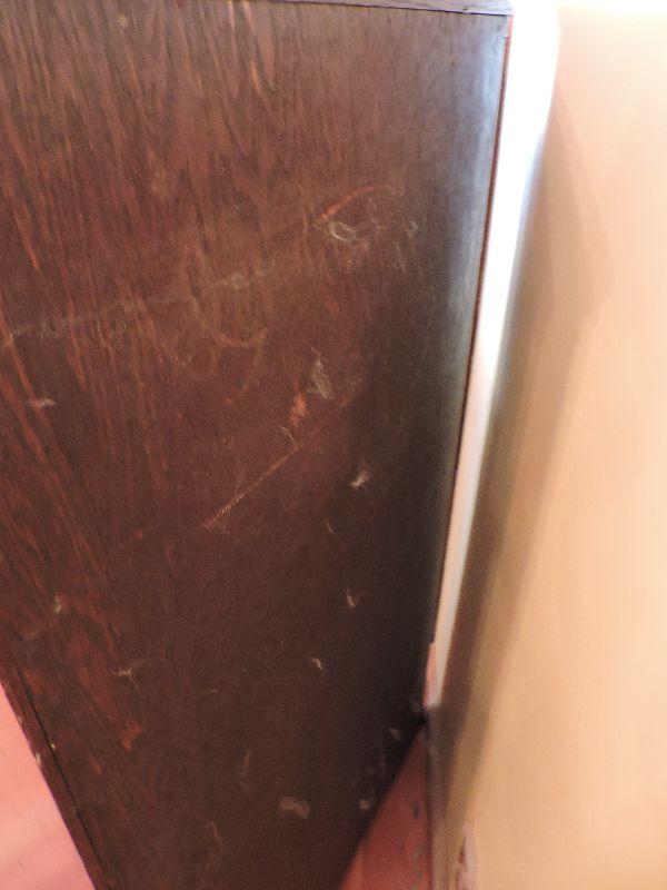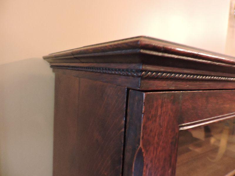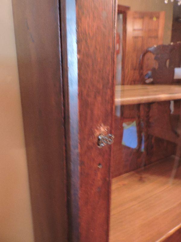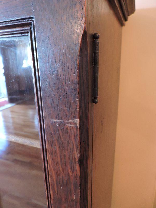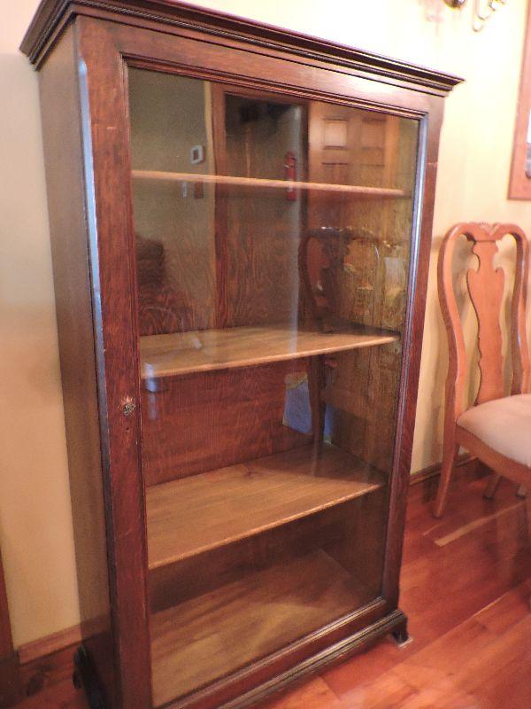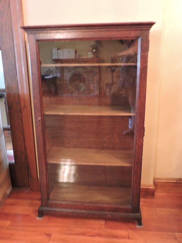 Wooden bookcase/display case, with 4 shelves and glass door. Wear noted. Bring help to move. Please read Terms and Conditions before placing a bid. Pick up is Friday, October 25th between 4 and 7, and Saturday, October 26th between 9 and 1. Props included in photos are not included in listing. All measurements are approximate. Comes from home with cats.