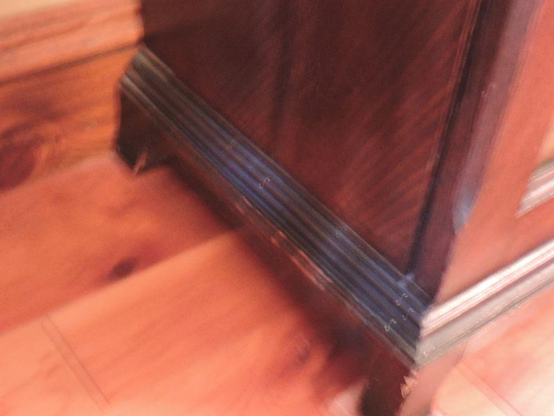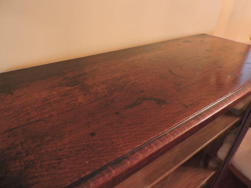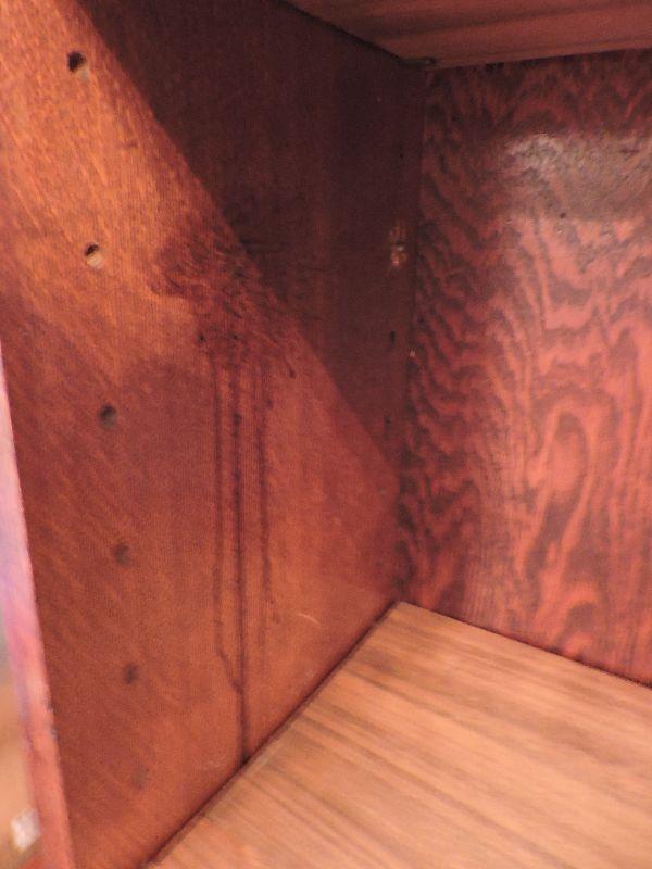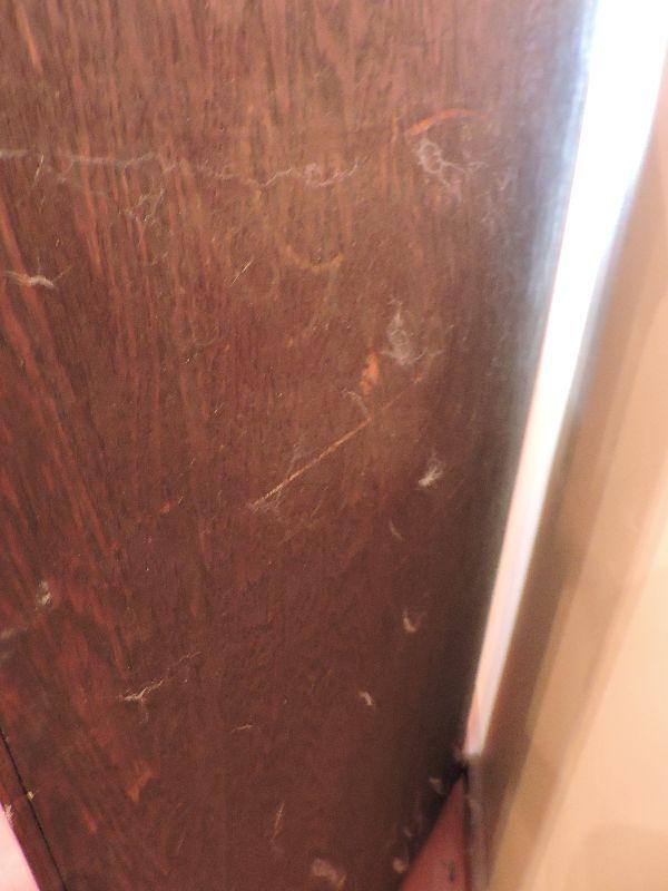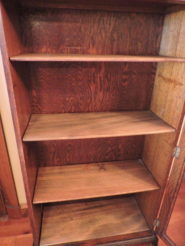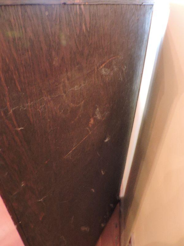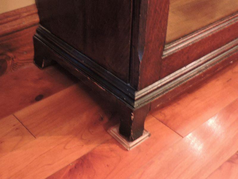 Wooden bookcase/display case, with 4 shelves and glass door. Wear noted. Bring help to move. Please read Terms and Conditions before placing a bid. Pick up is Friday, October 25th between 4 and 7, and Saturday, October 26th between 9 and 1. Props included in photos are not included in listing. All measurements are approximate. Comes from home with cats.