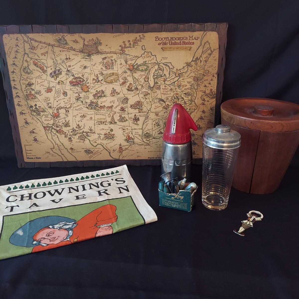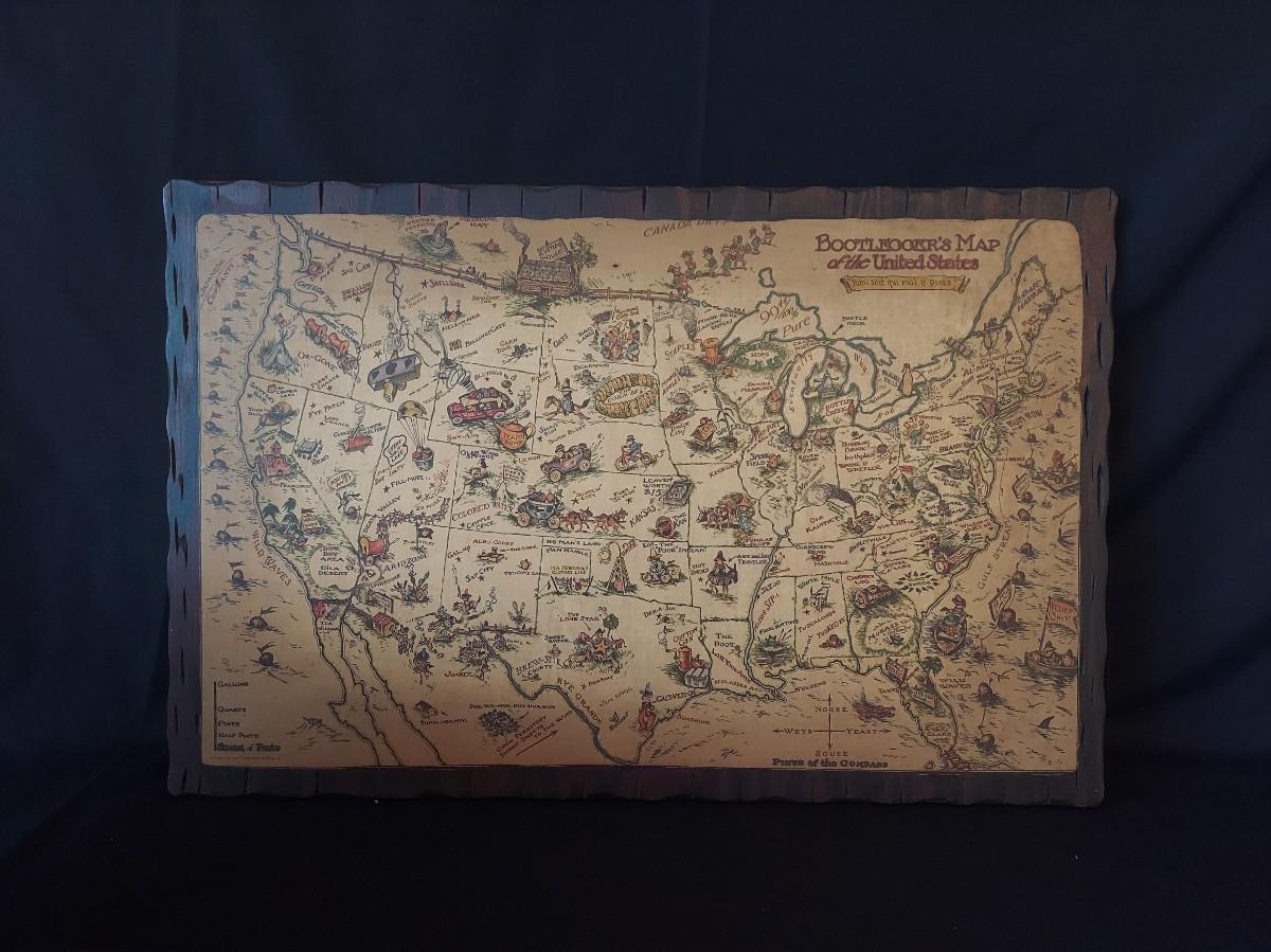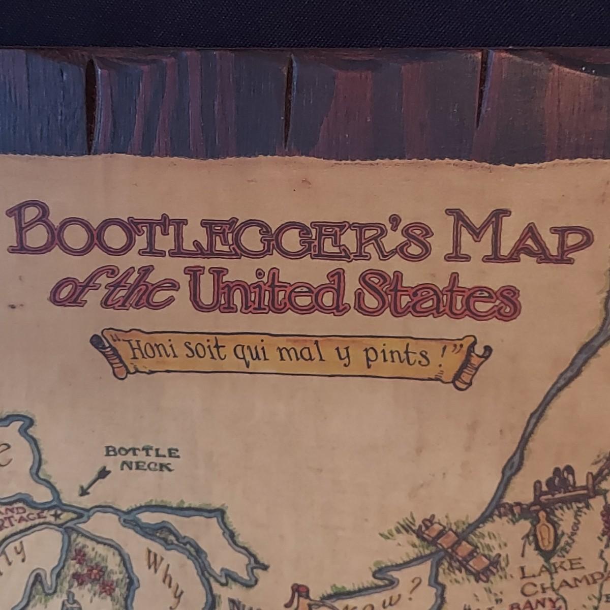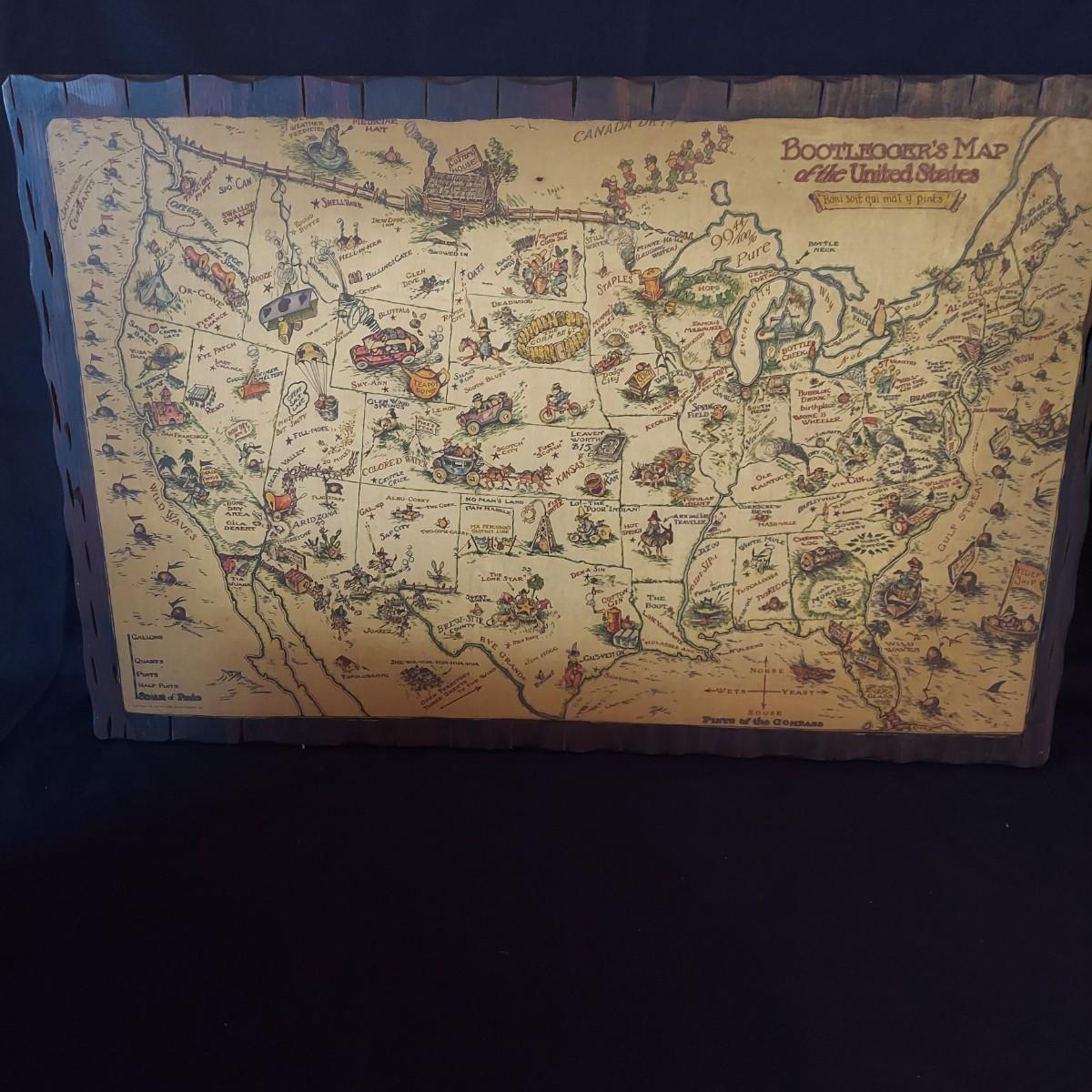 Large novelty bootlegger's map mounted on wood that measures 29” x 19"H. With a wooden ice bucket, glass drink Shaker and more. Please see photos for details. Shipping available