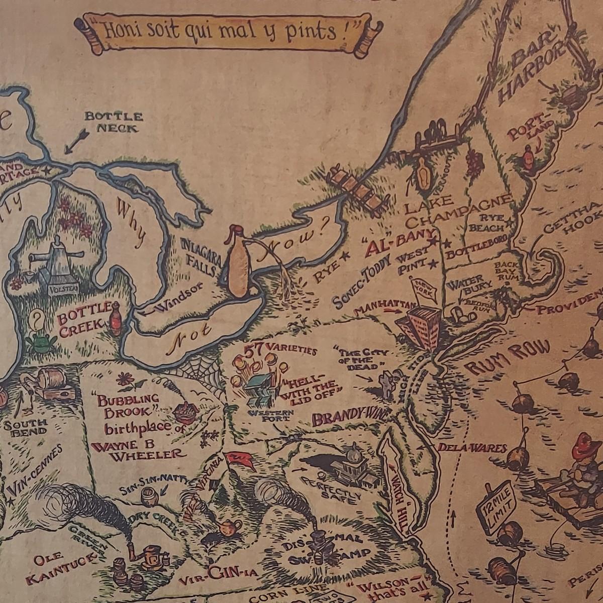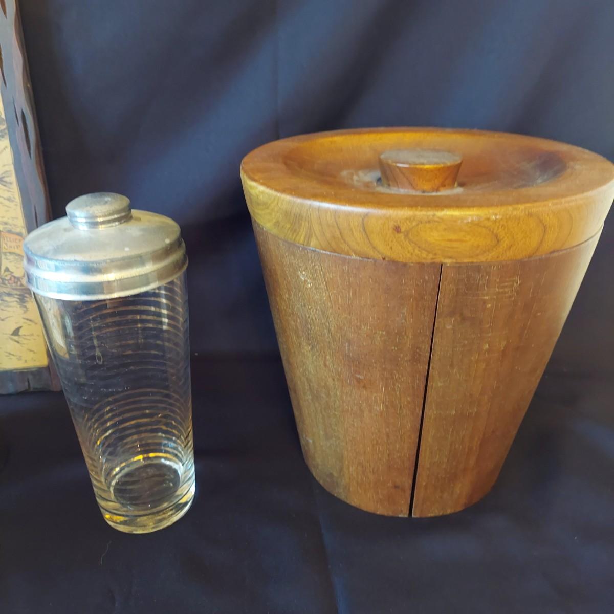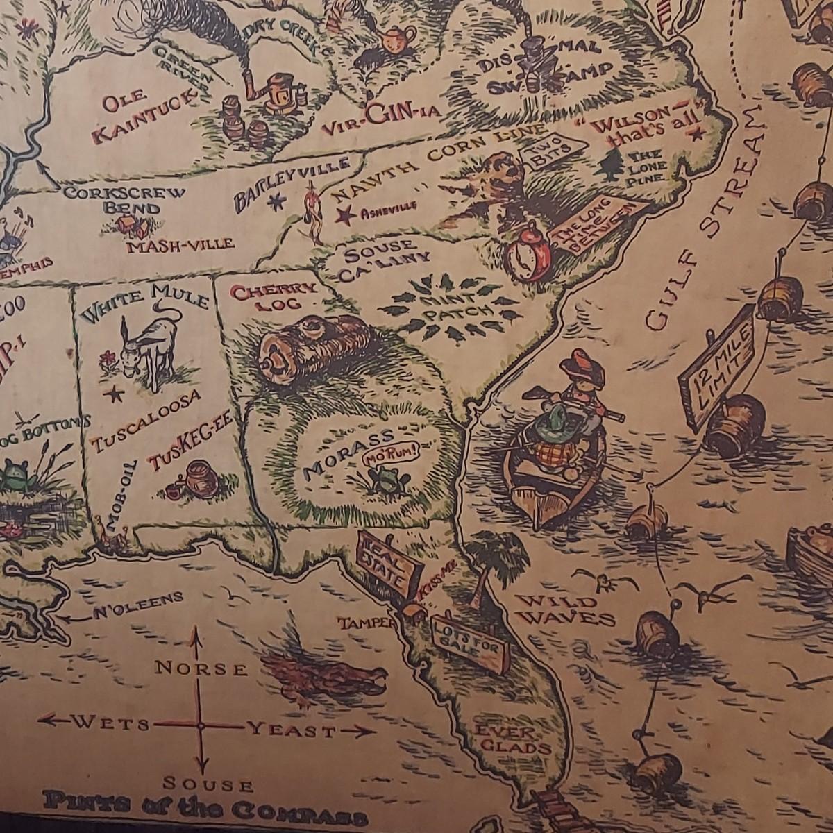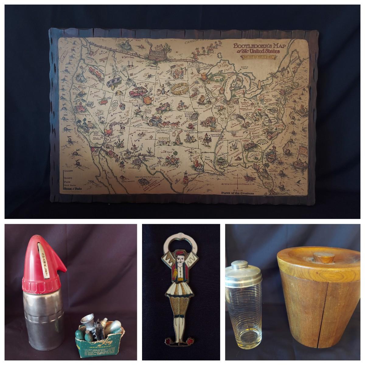 Large novelty bootlegger's map mounted on wood that measures 29” x 19"H. With a wooden ice bucket, glass drink Shaker and more. Please see photos for details. Shipping available