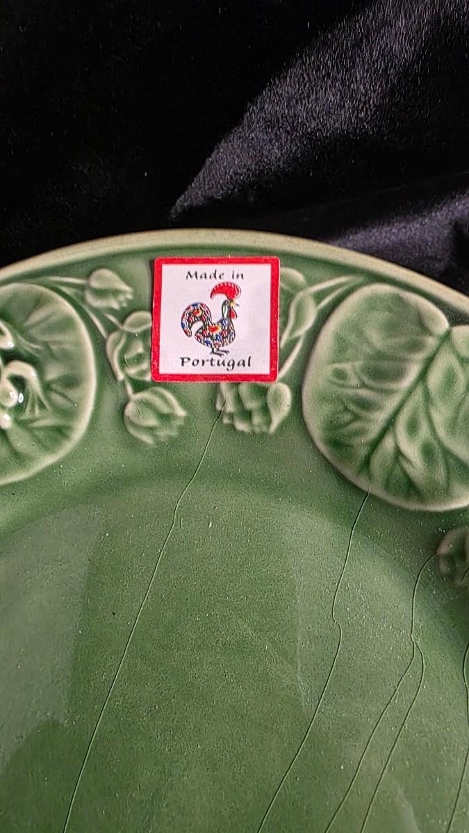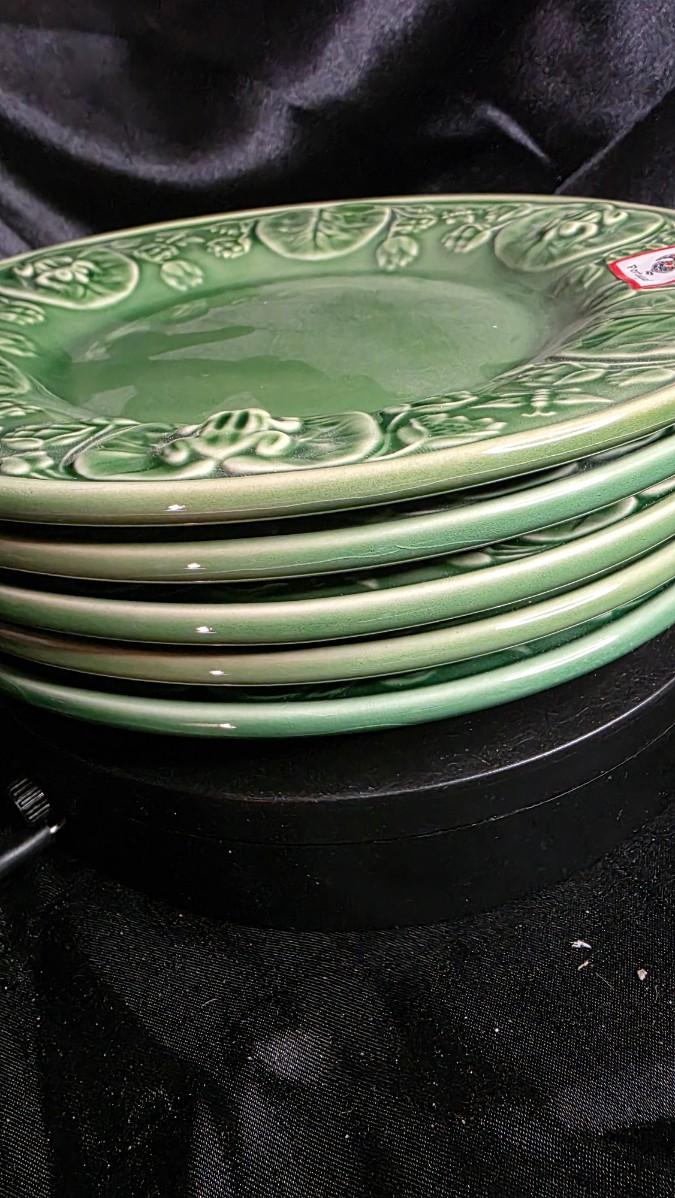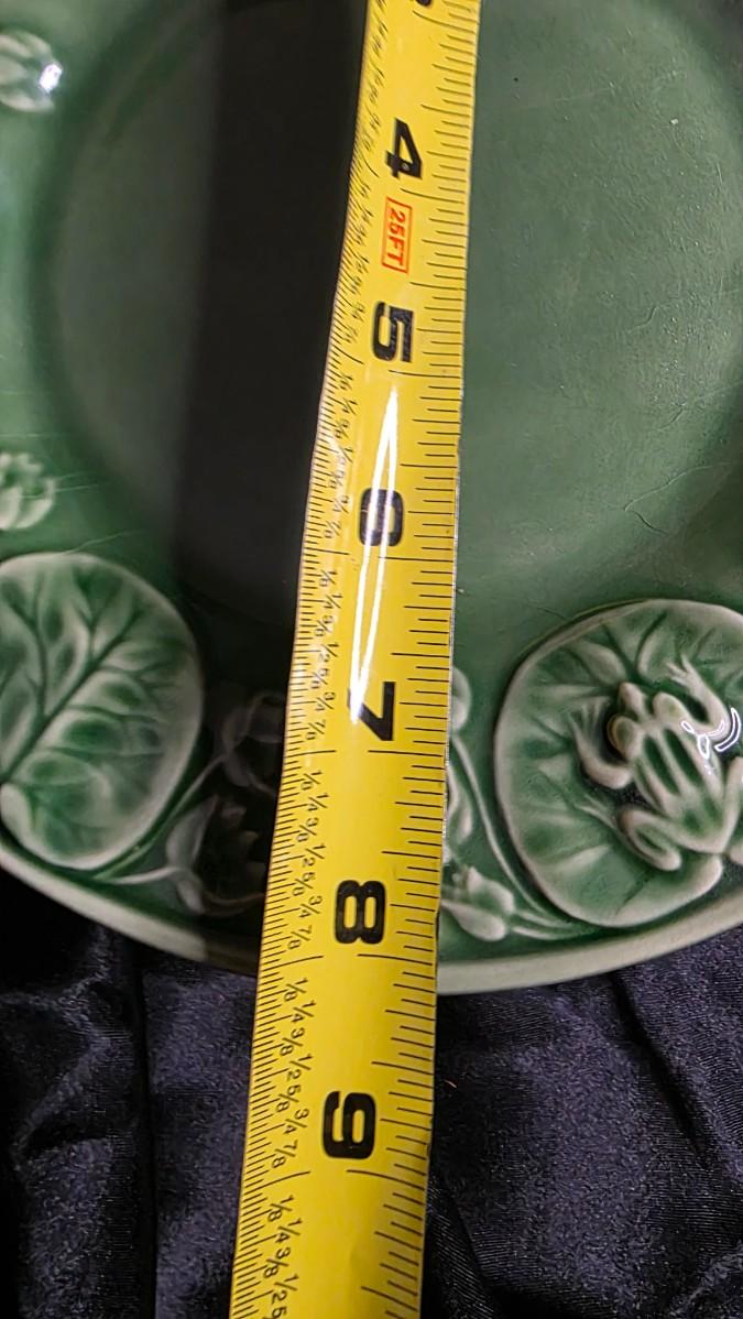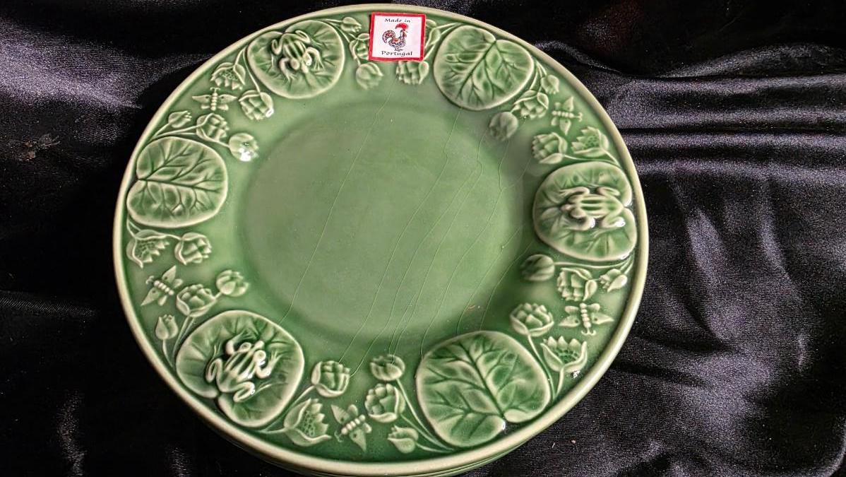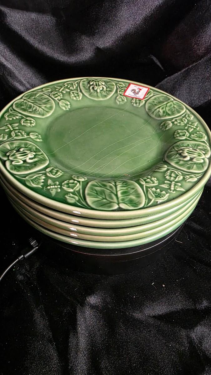 Comps: Vintage Bordallo Pinheiro frog lily leaf majolica plate sets (5 pieces, 8") sell $90–$180 on eBay/Etsy; the full embossed green pattern, intact condition, and "004" marking add premium over singles at $20–$50 each.