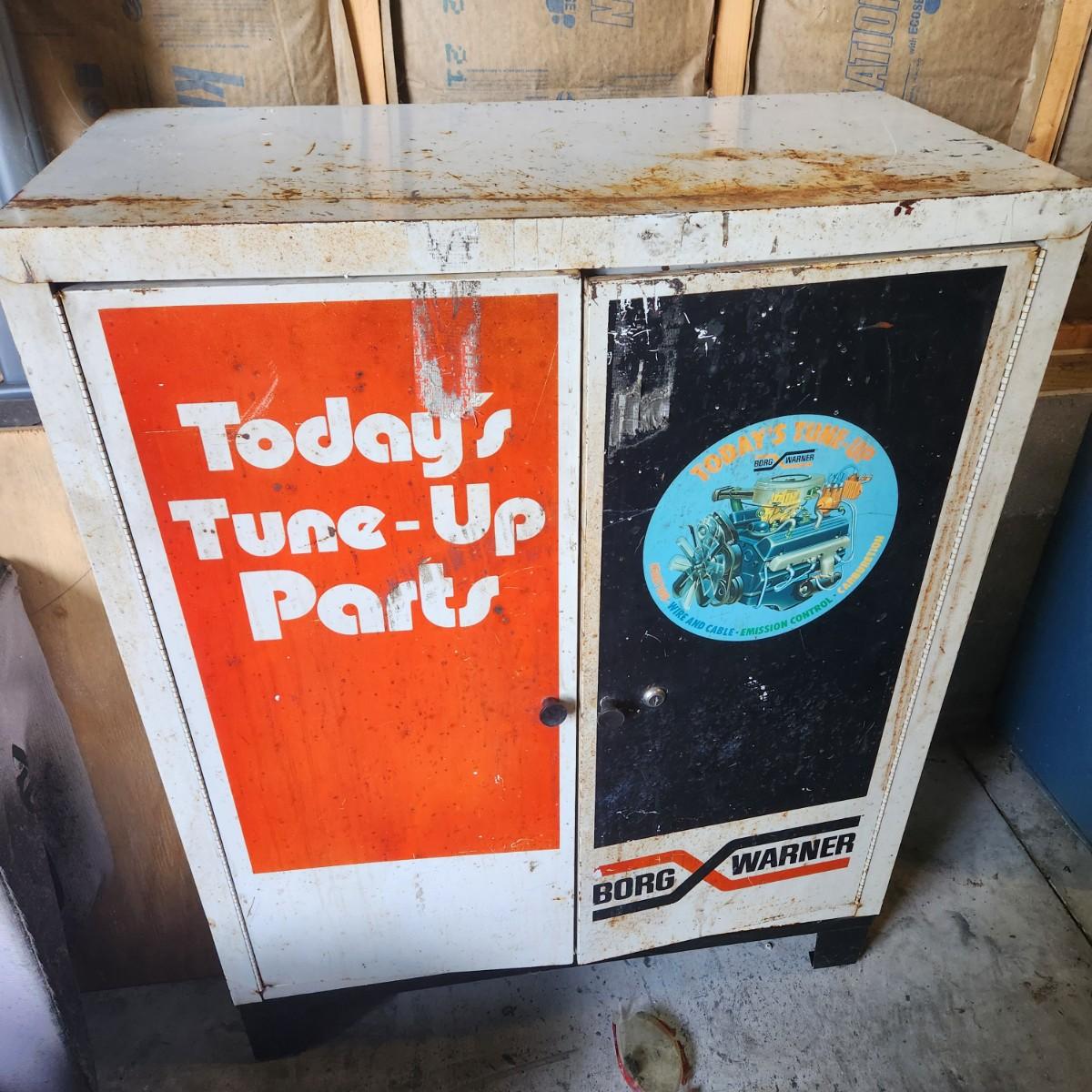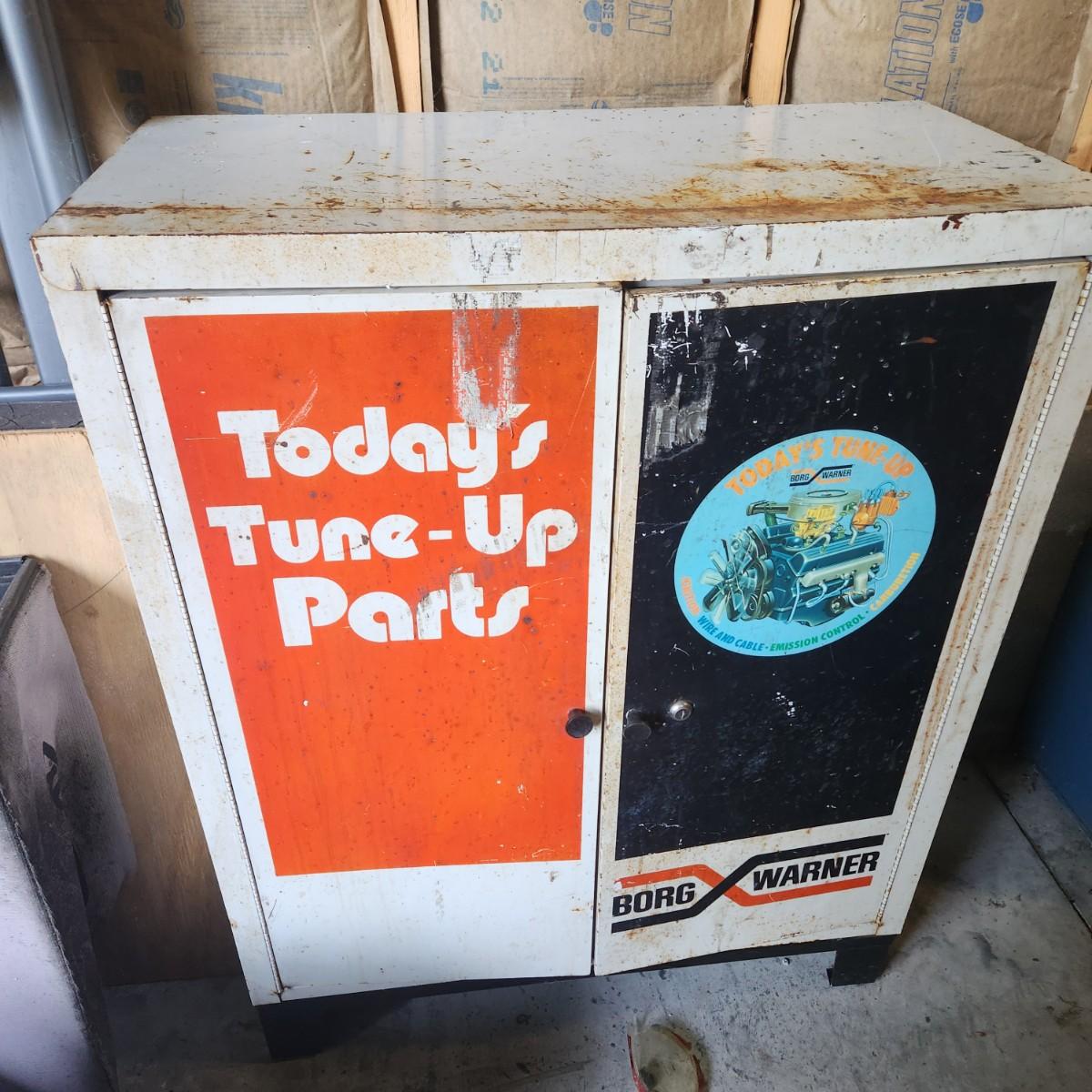 Vintage Borg Warner Metal Cabinet w 3 Shelves Today's Tune up parts