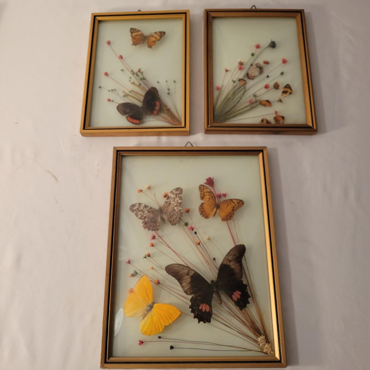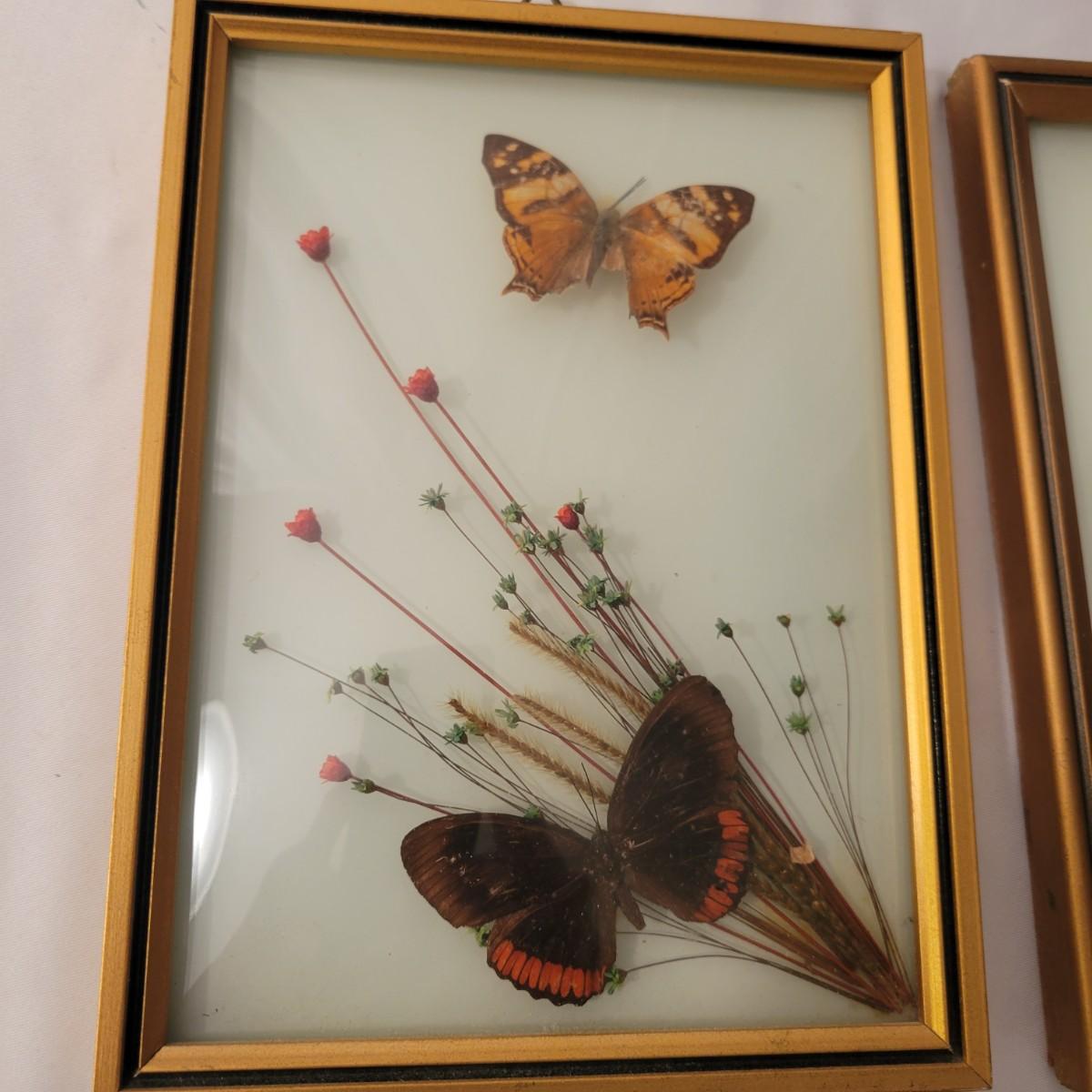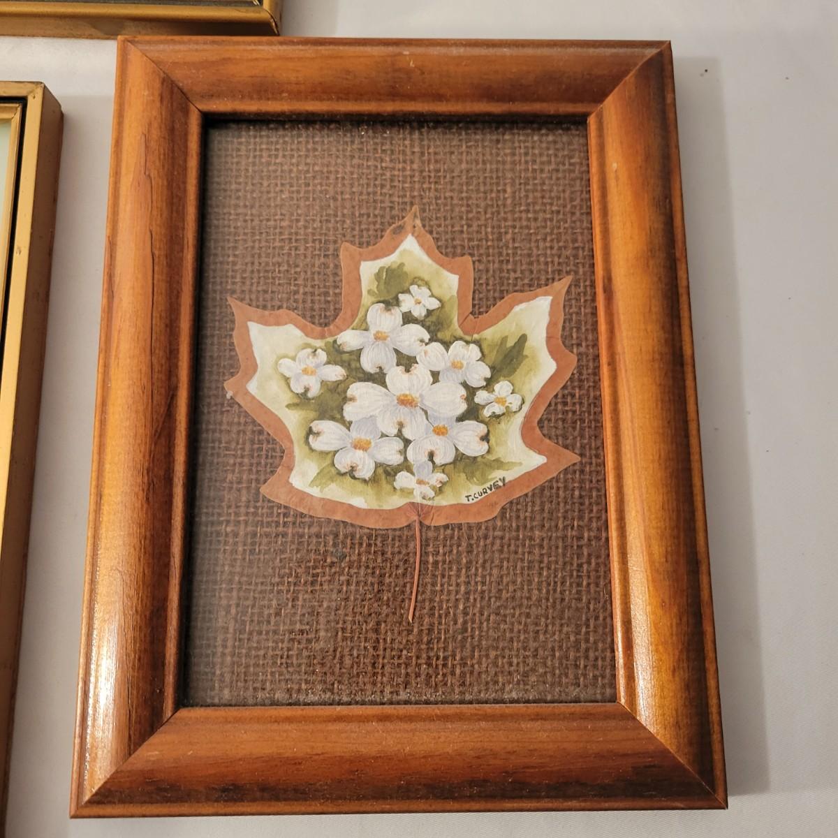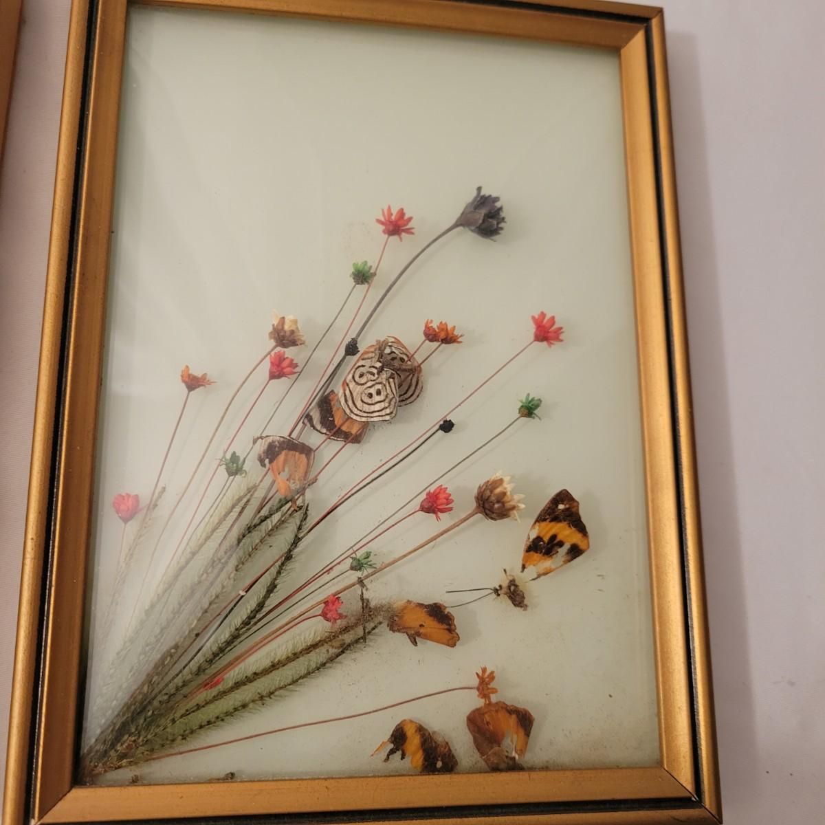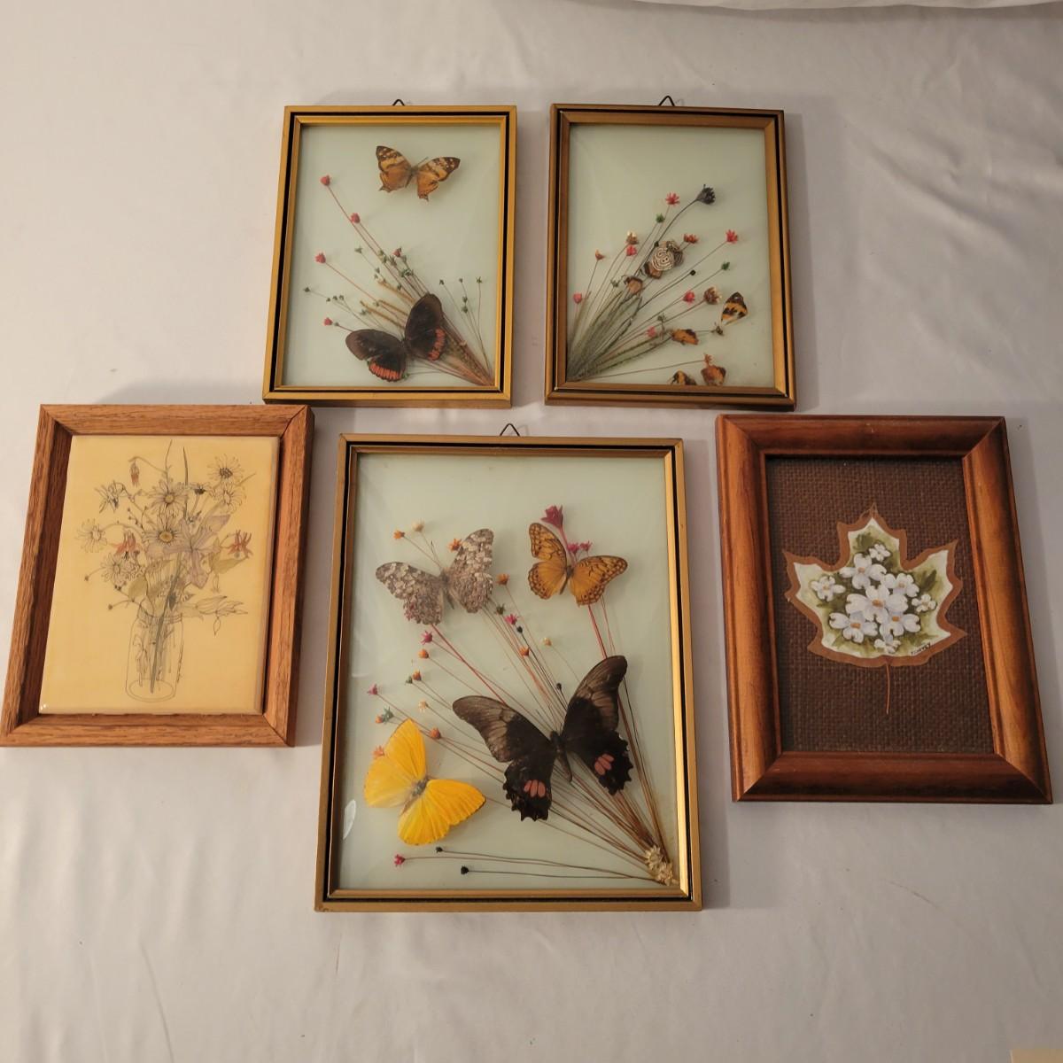 An assortment of five framed botanical pieces. Three matching pieces are of dries flowers ans preserved butterflies with bubble glass in wooden gold finished frames. The largest piece measures approximately 7.5" x 10" and in one of the smaller pieces, the butterflies are falling apart. Also incluslded is a painted title that is signed in a wooden frame and a hand painted and signed leaf with dogwoods painted on it. Shipping available