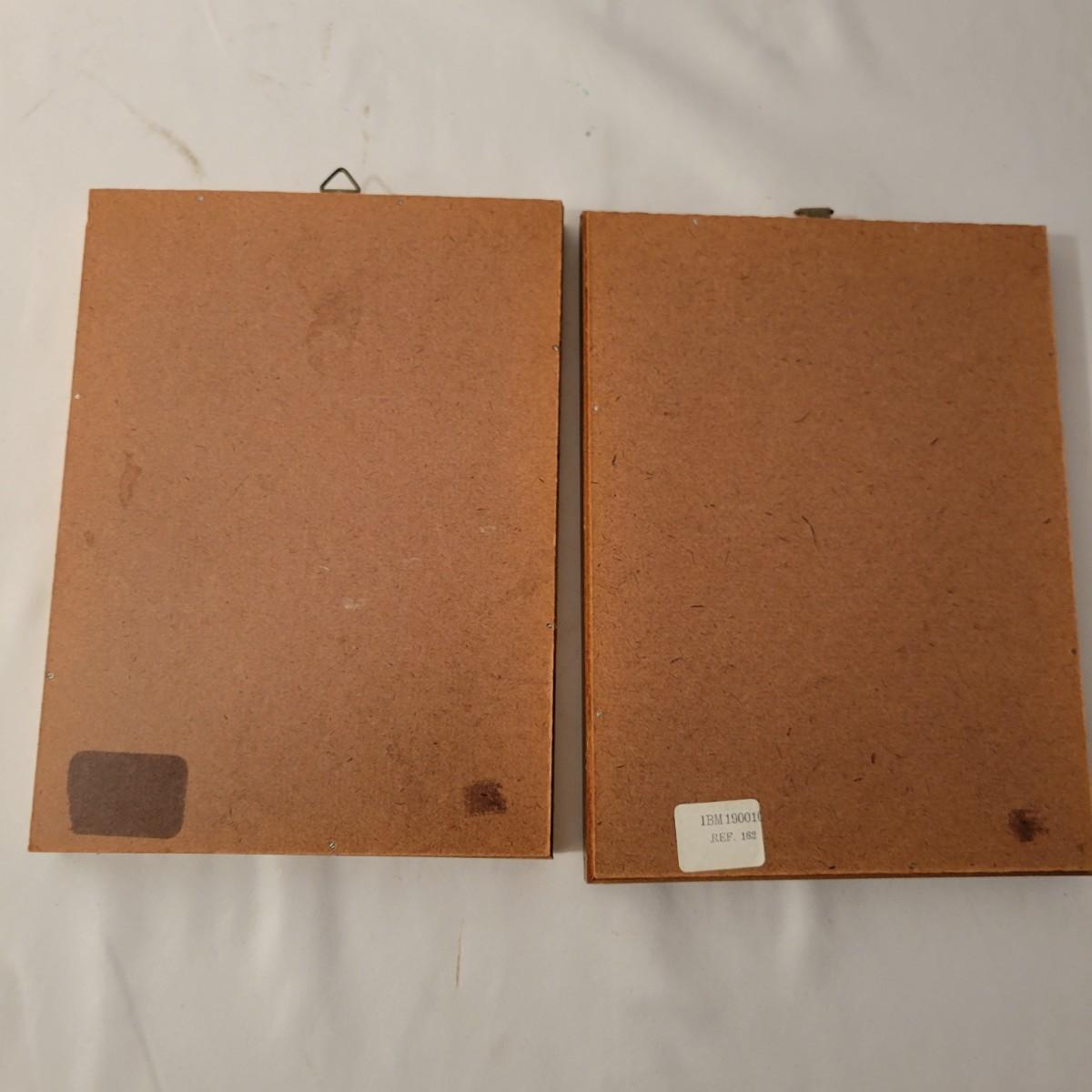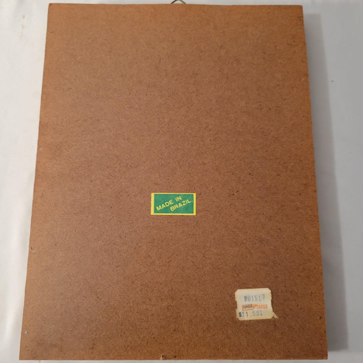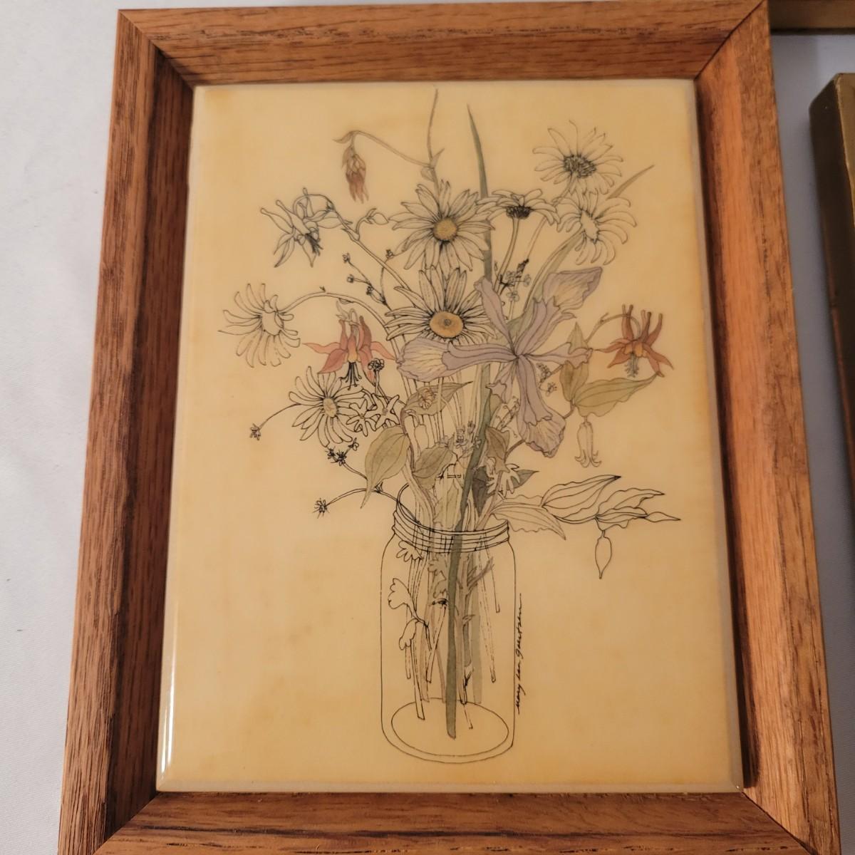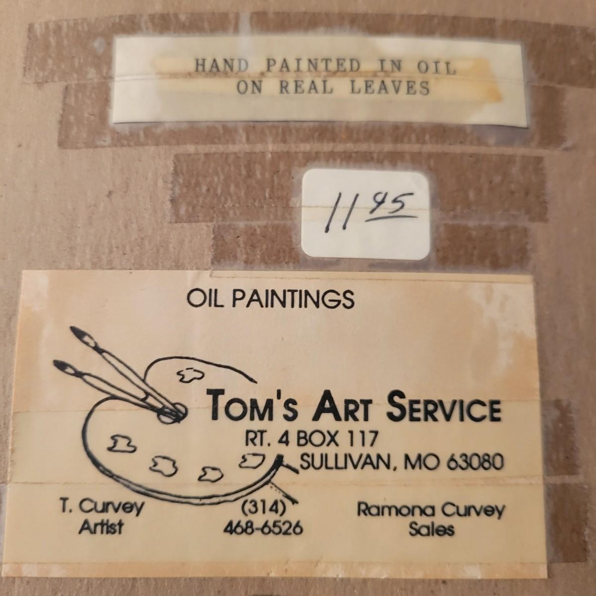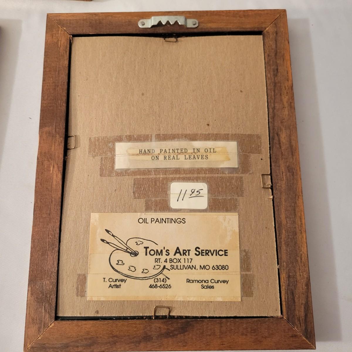 An assortment of five framed botanical pieces. Three matching pieces are of dries flowers ans preserved butterflies with bubble glass in wooden gold finished frames. The largest piece measures approximately 7.5" x 10" and in one of the smaller pieces, the butterflies are falling apart. Also incluslded is a painted title that is signed in a wooden frame and a hand painted and signed leaf with dogwoods painted on it. Shipping available