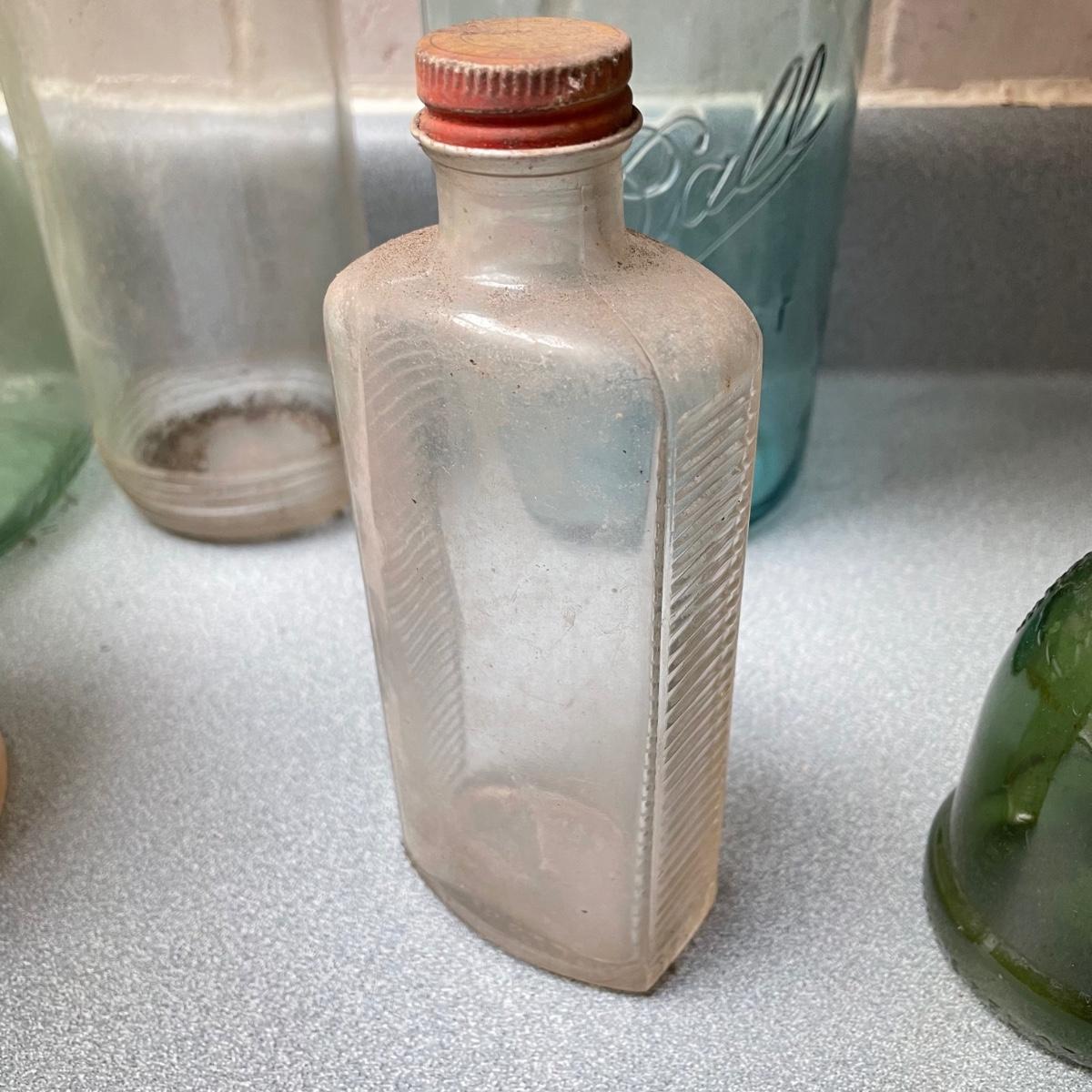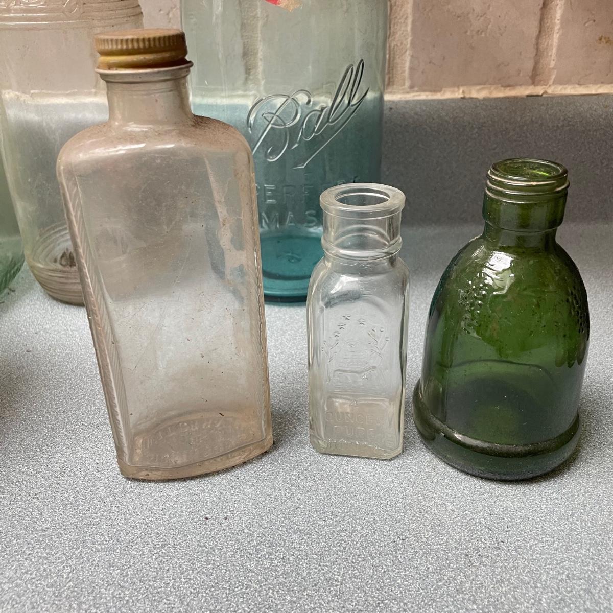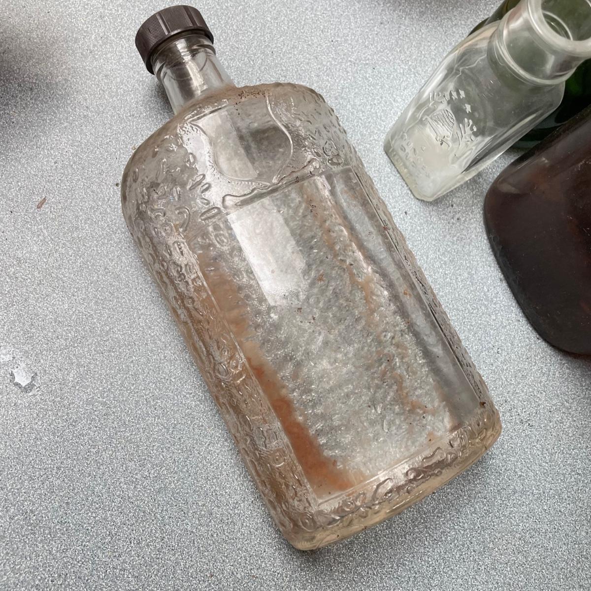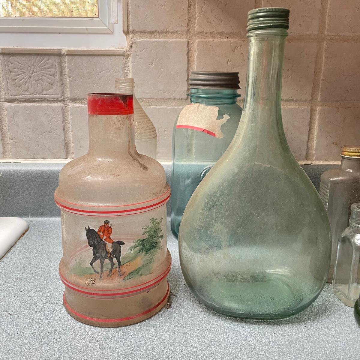 Twelve vintage liquor bottles, some of which are embossed with designs, like the New Jersey bottle. Eleven of the twelve bottles appear to be pint sized. Lot also includes a 4oz honey jar, a 5” tall green bottle with embossed grape leaves, a 9” tall bottle with a painted duck hunt scene. Lot also features a 9.5” tall aqua blue ball jar (most likely a quart size) with a porcelain and zinc lid. The final two are a vintage wine style bottle and a neat Texize bottle. See images. Shipping available.