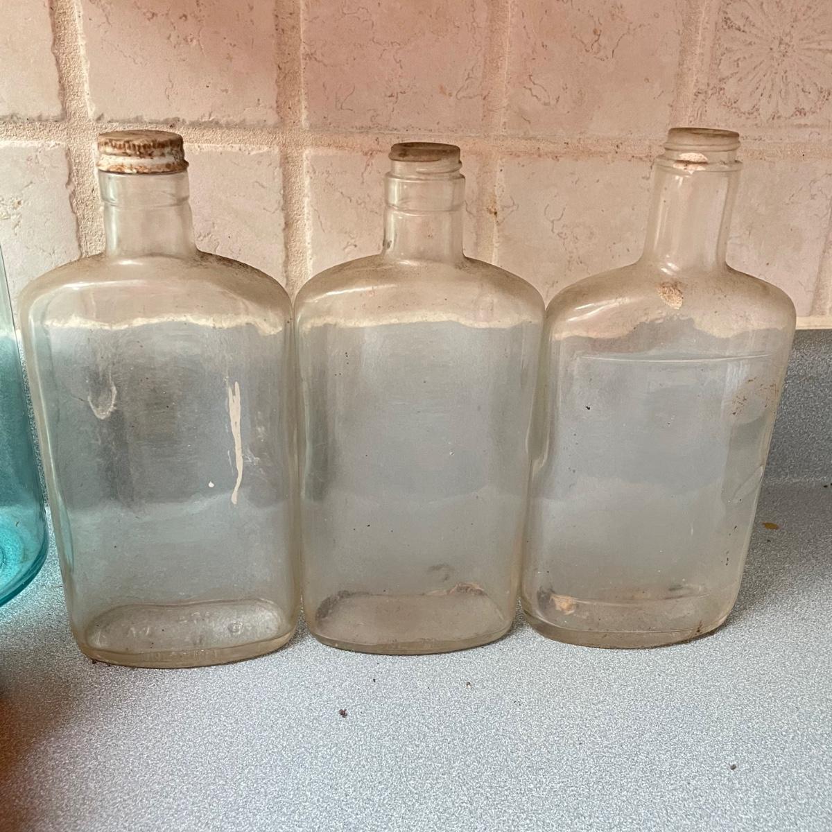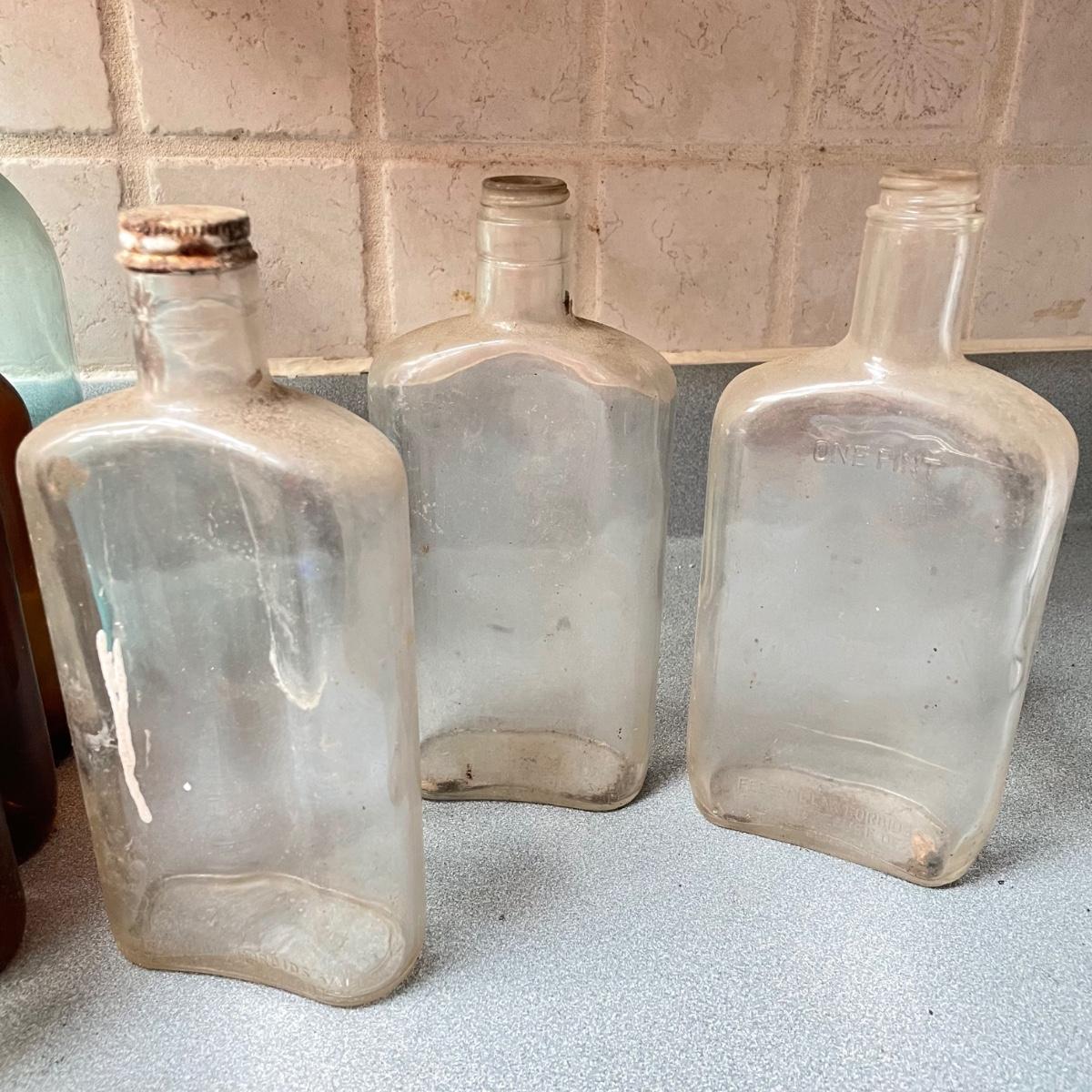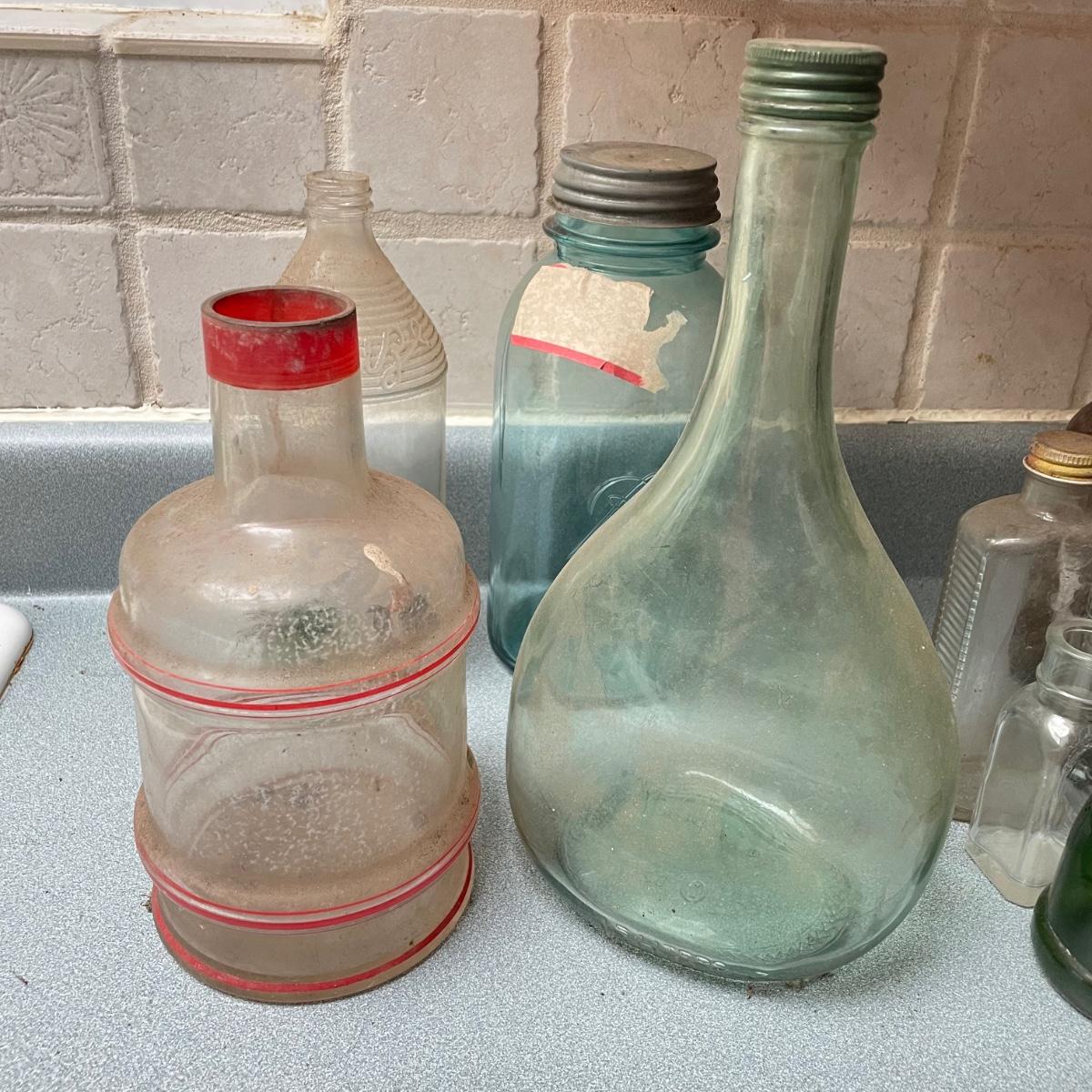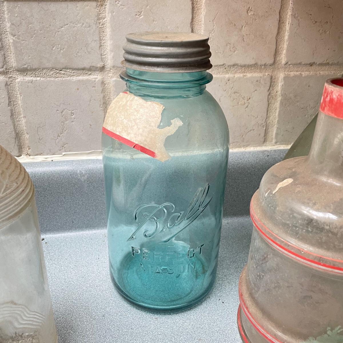 Twelve vintage liquor bottles, some of which are embossed with designs, like the New Jersey bottle. Eleven of the twelve bottles appear to be pint sized. Lot also includes a 4oz honey jar, a 5” tall green bottle with embossed grape leaves, a 9” tall bottle with a painted duck hunt scene. Lot also features a 9.5” tall aqua blue ball jar (most likely a quart size) with a porcelain and zinc lid. The final two are a vintage wine style bottle and a neat Texize bottle. See images. Shipping available.
