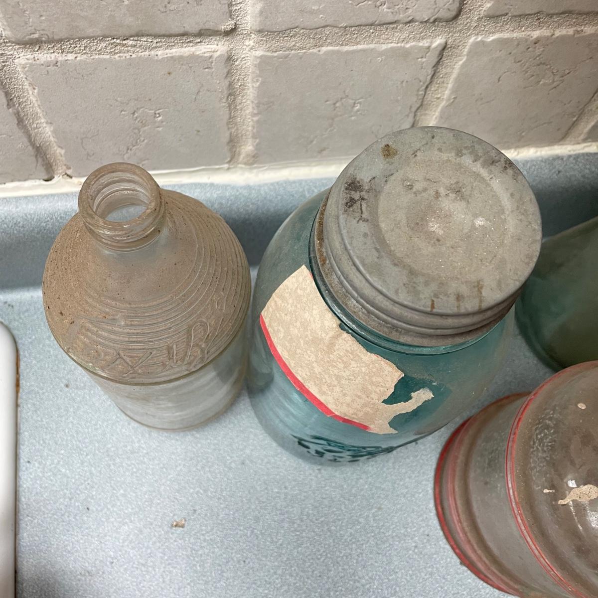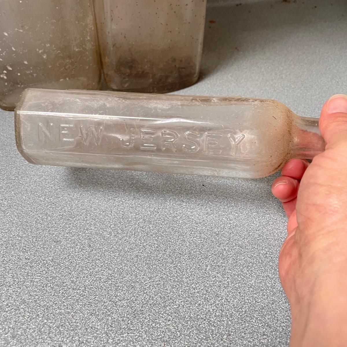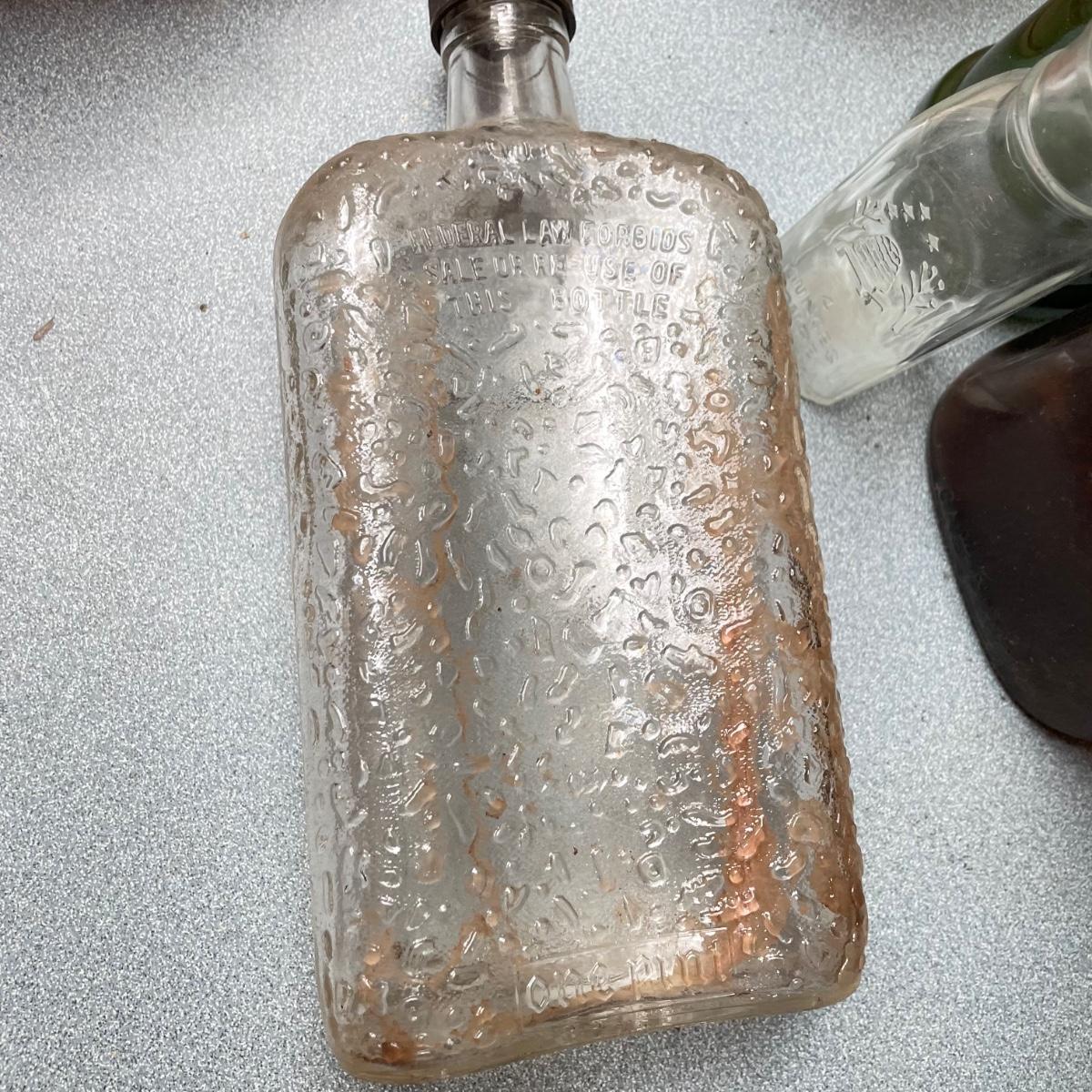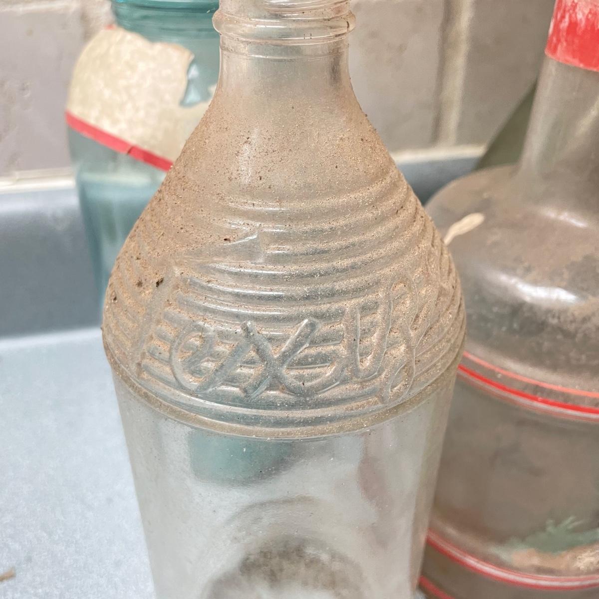 Twelve vintage liquor bottles, some of which are embossed with designs, like the New Jersey bottle. Eleven of the twelve bottles appear to be pint sized. Lot also includes a 4oz honey jar, a 5” tall green bottle with embossed grape leaves, a 9” tall bottle with a painted duck hunt scene. Lot also features a 9.5” tall aqua blue ball jar (most likely a quart size) with a porcelain and zinc lid. The final two are a vintage wine style bottle and a neat Texize bottle. See images. Shipping available.