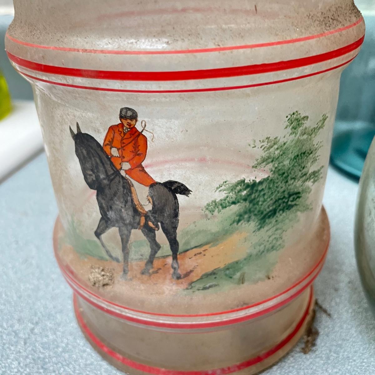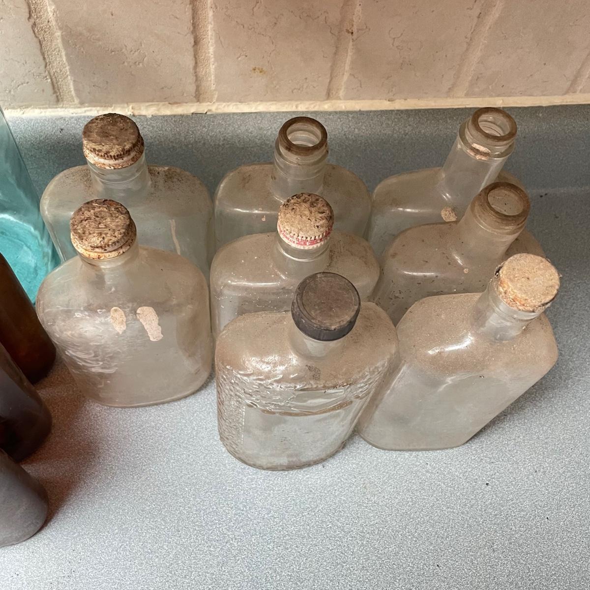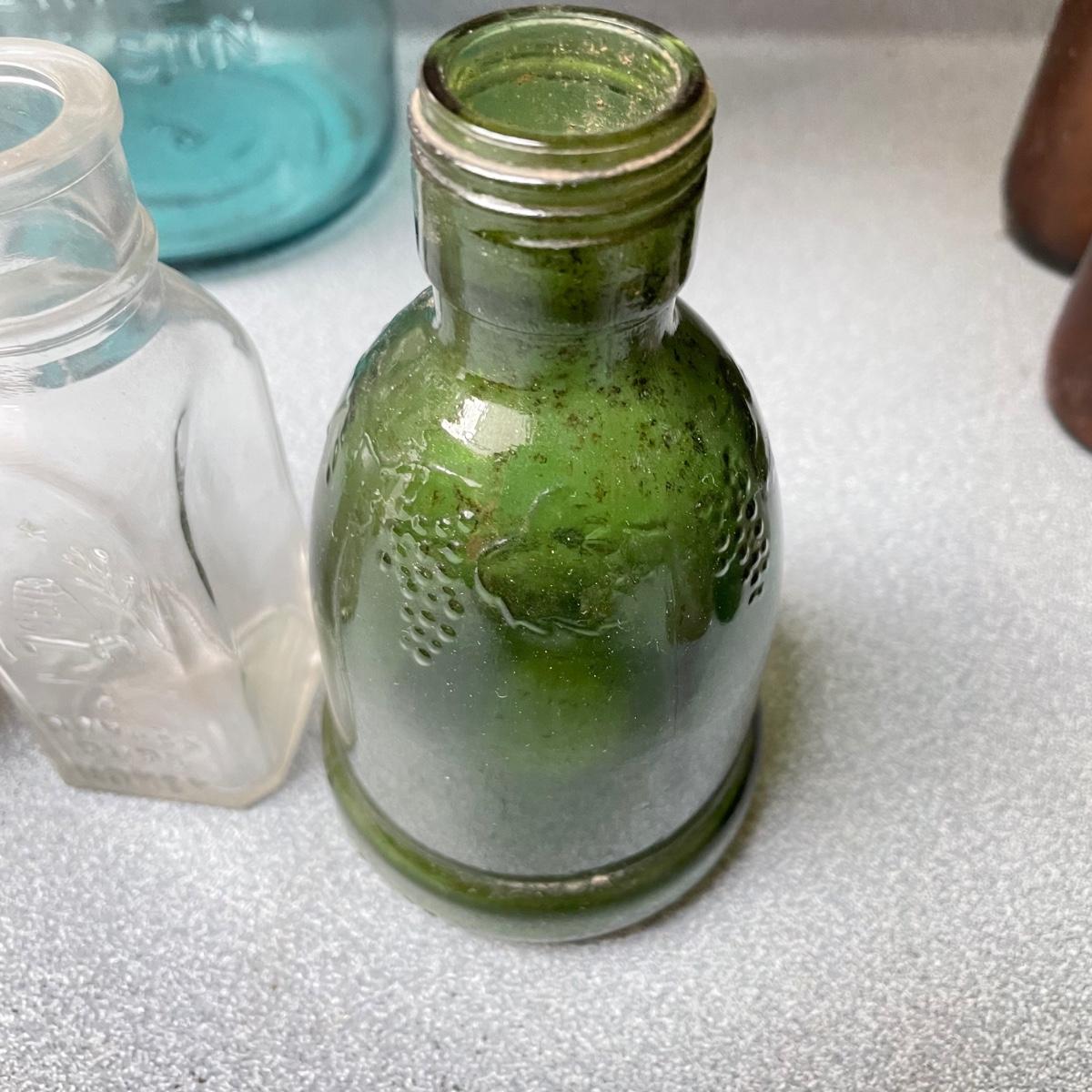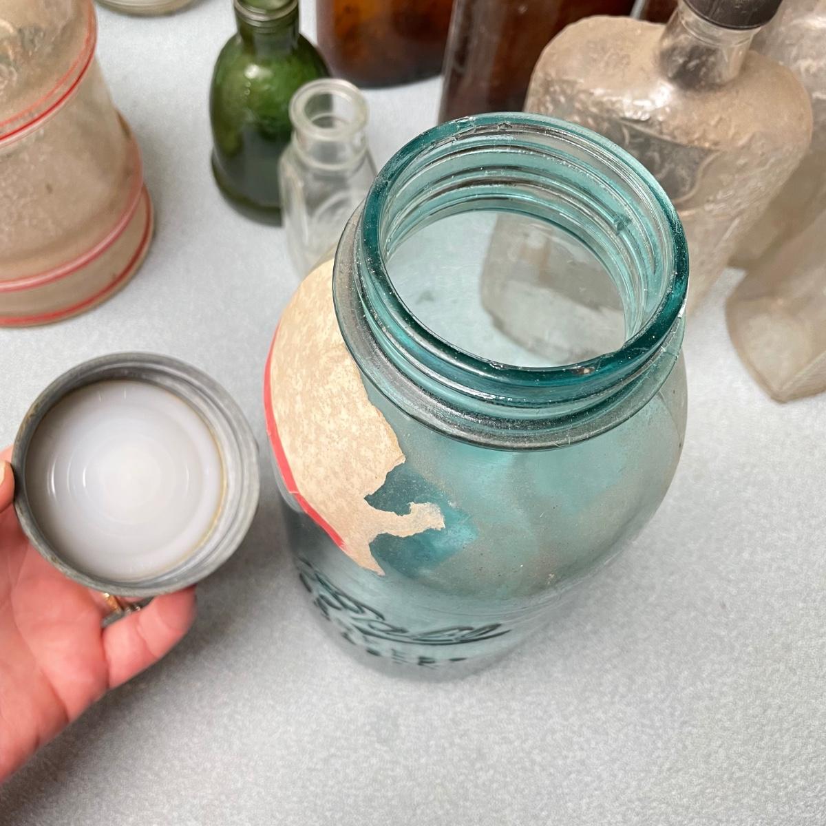 Twelve vintage liquor bottles, some of which are embossed with designs, like the New Jersey bottle. Eleven of the twelve bottles appear to be pint sized. Lot also includes a 4oz honey jar, a 5” tall green bottle with embossed grape leaves, a 9” tall bottle with a painted duck hunt scene. Lot also features a 9.5” tall aqua blue ball jar (most likely a quart size) with a porcelain and zinc lid. The final two are a vintage wine style bottle and a neat Texize bottle. See images. Shipping available.