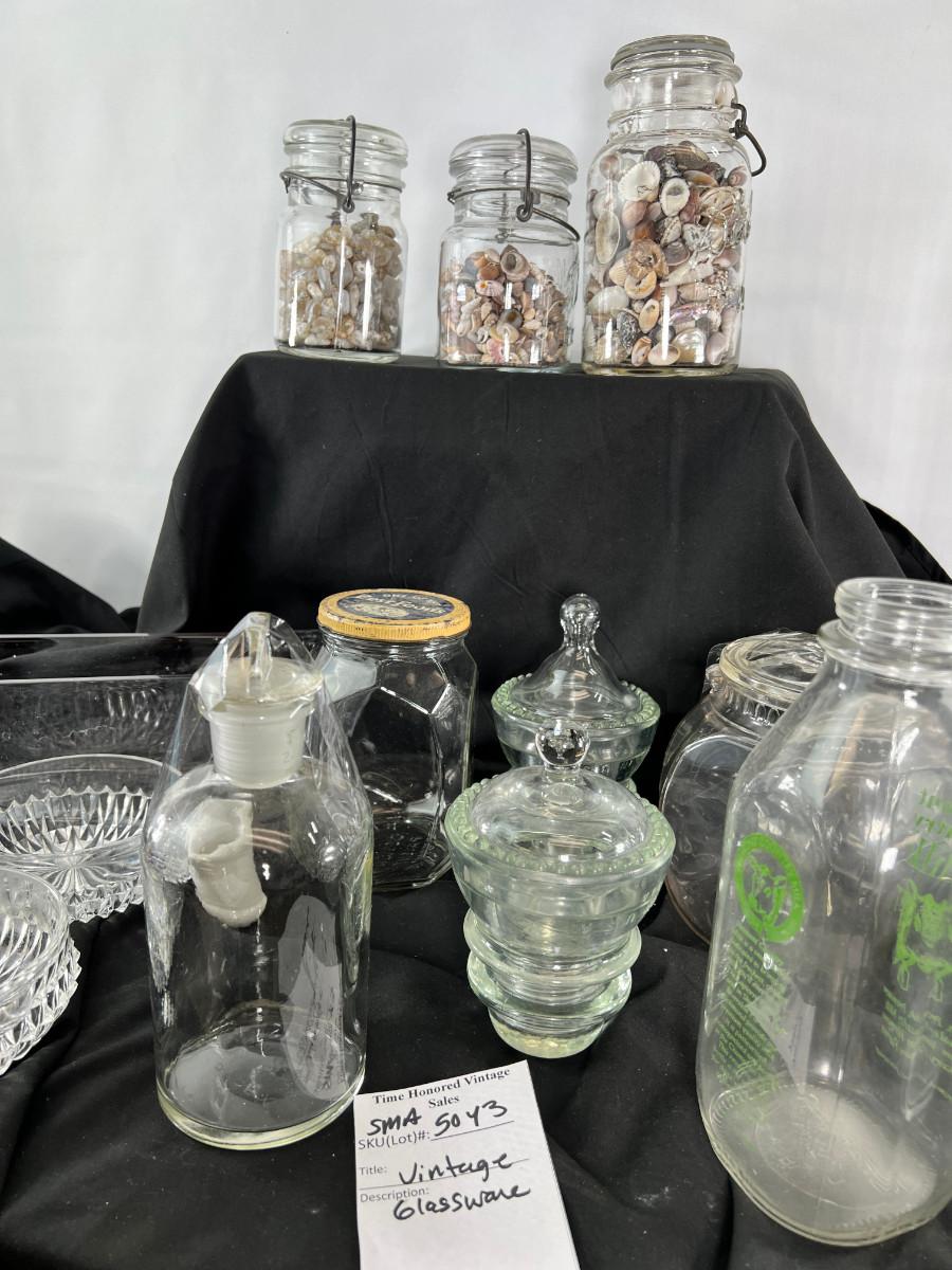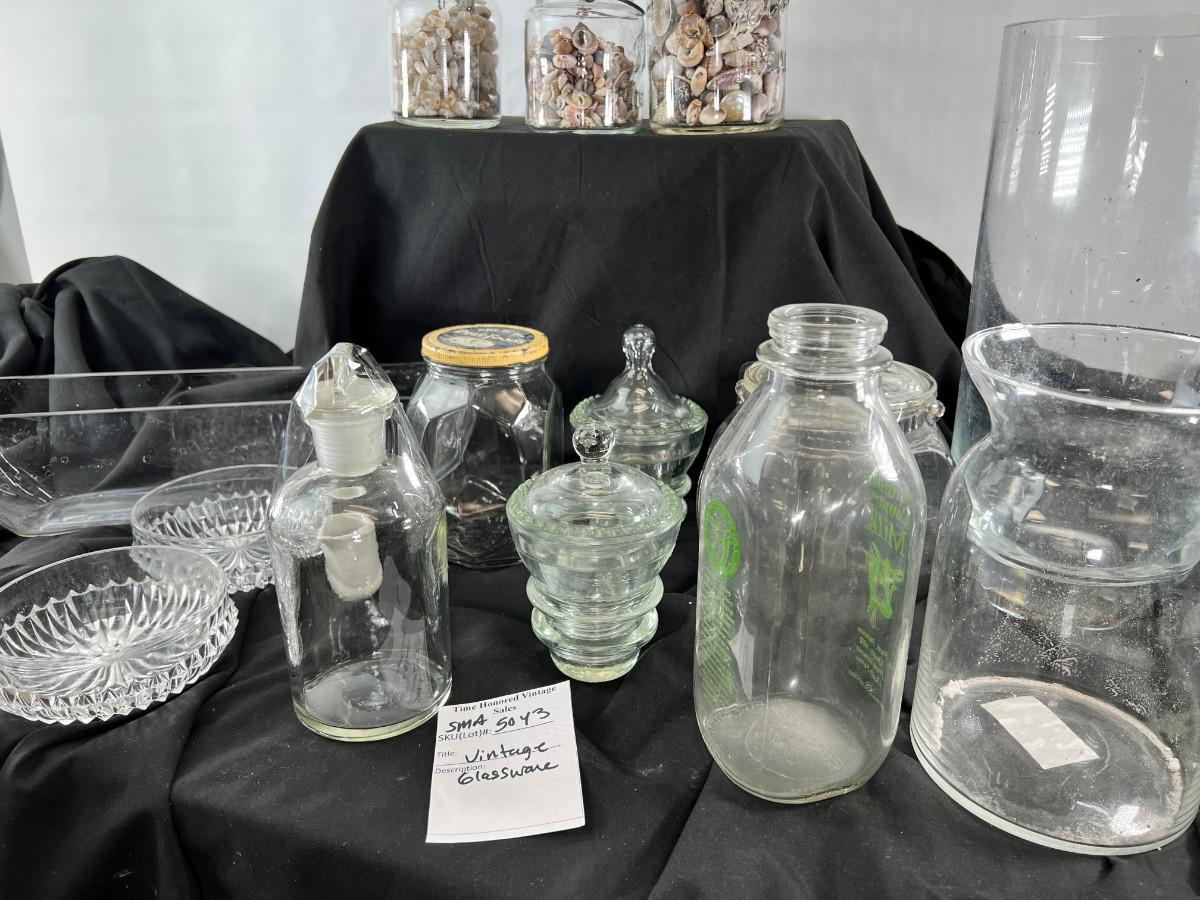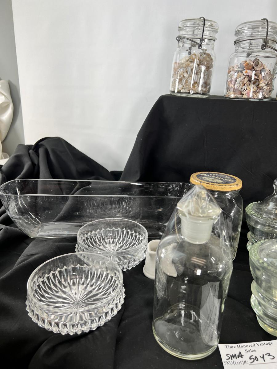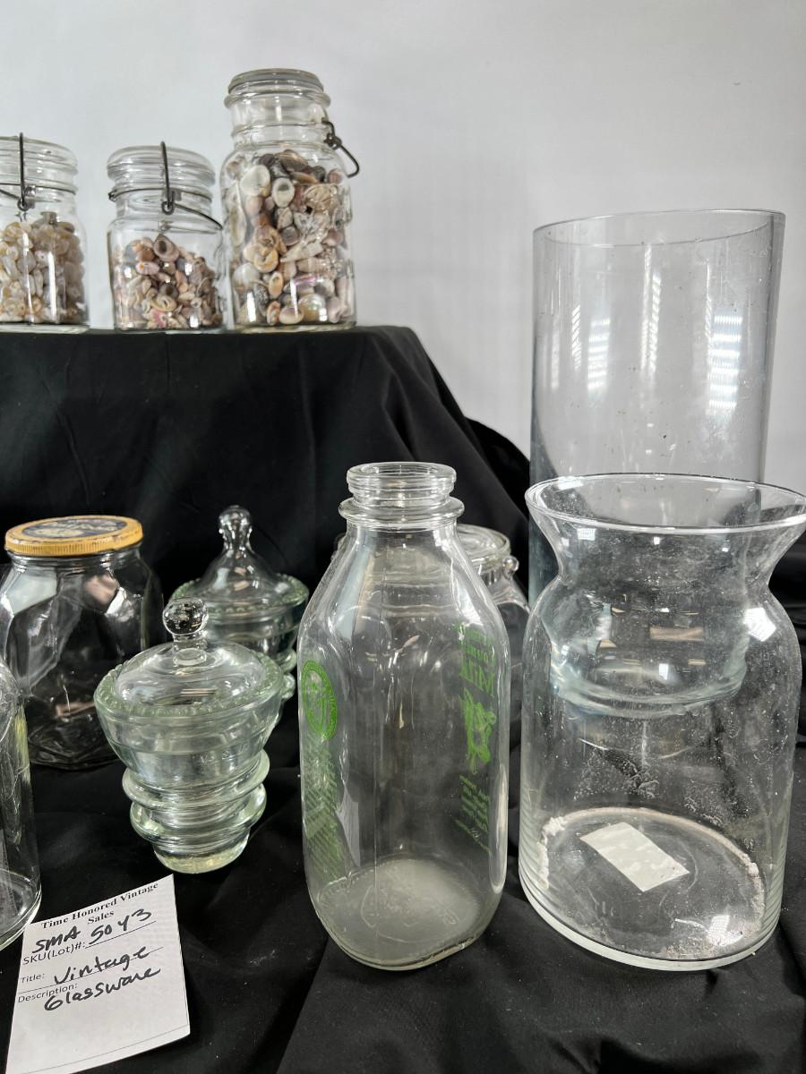 High quality tall vase and flower float bowl. Depression glass vanity jars, milk bottles.