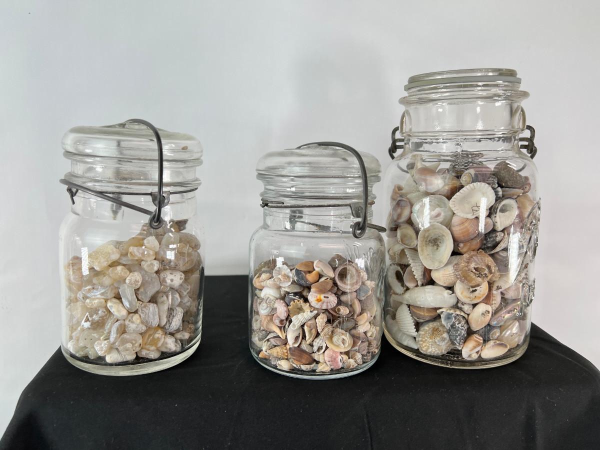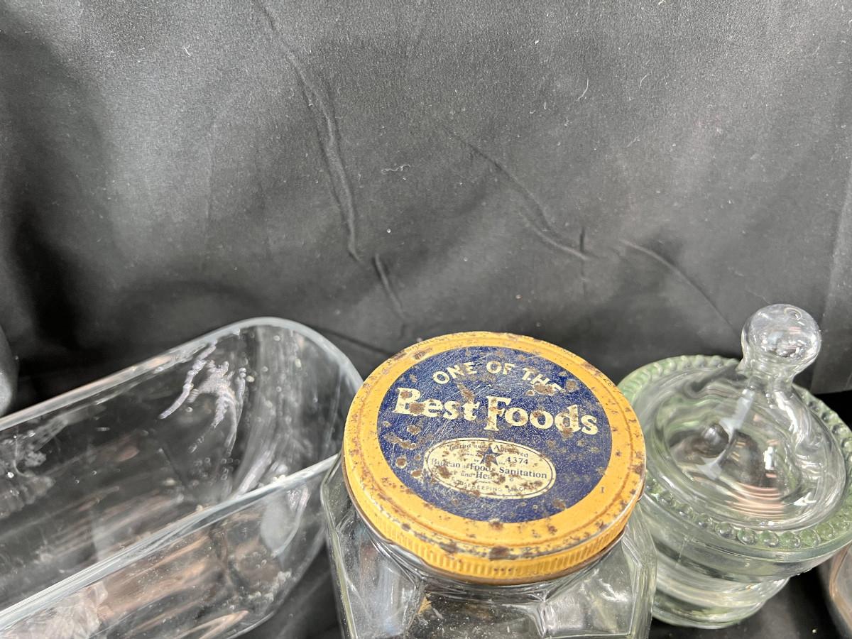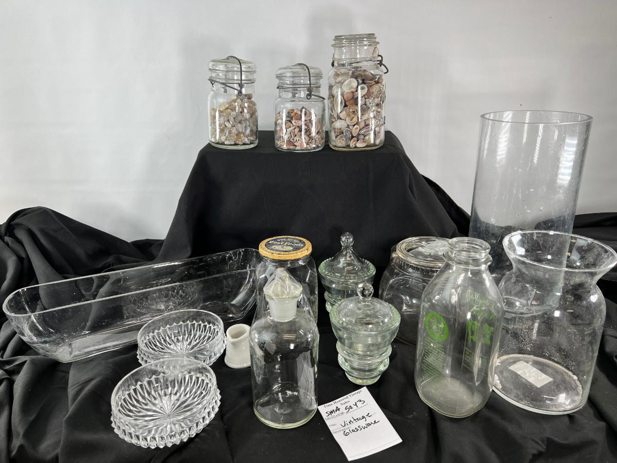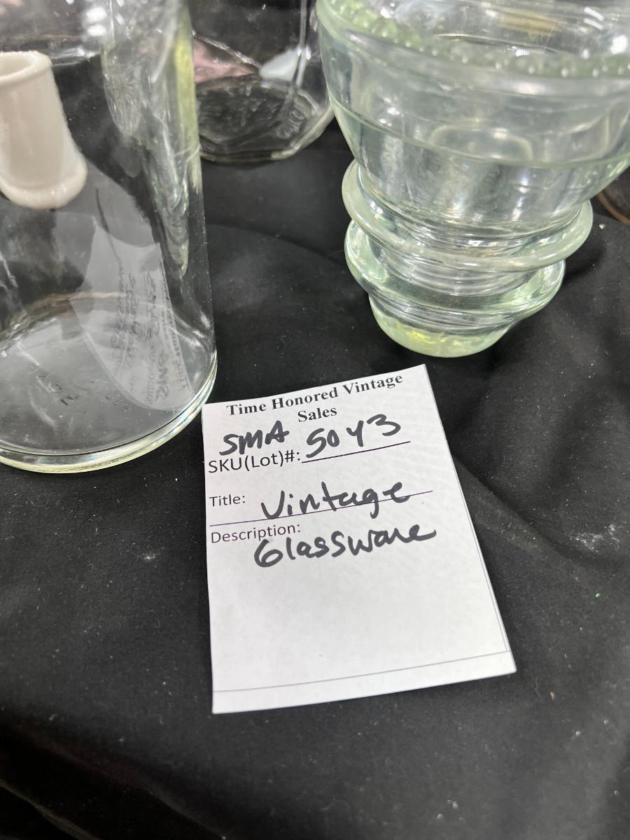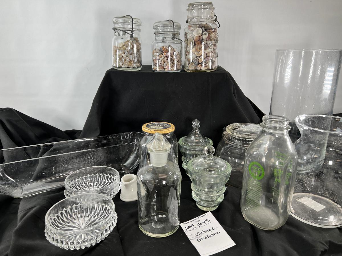 High quality tall vase and flower float bowl. Depression glass vanity jars, milk bottles.