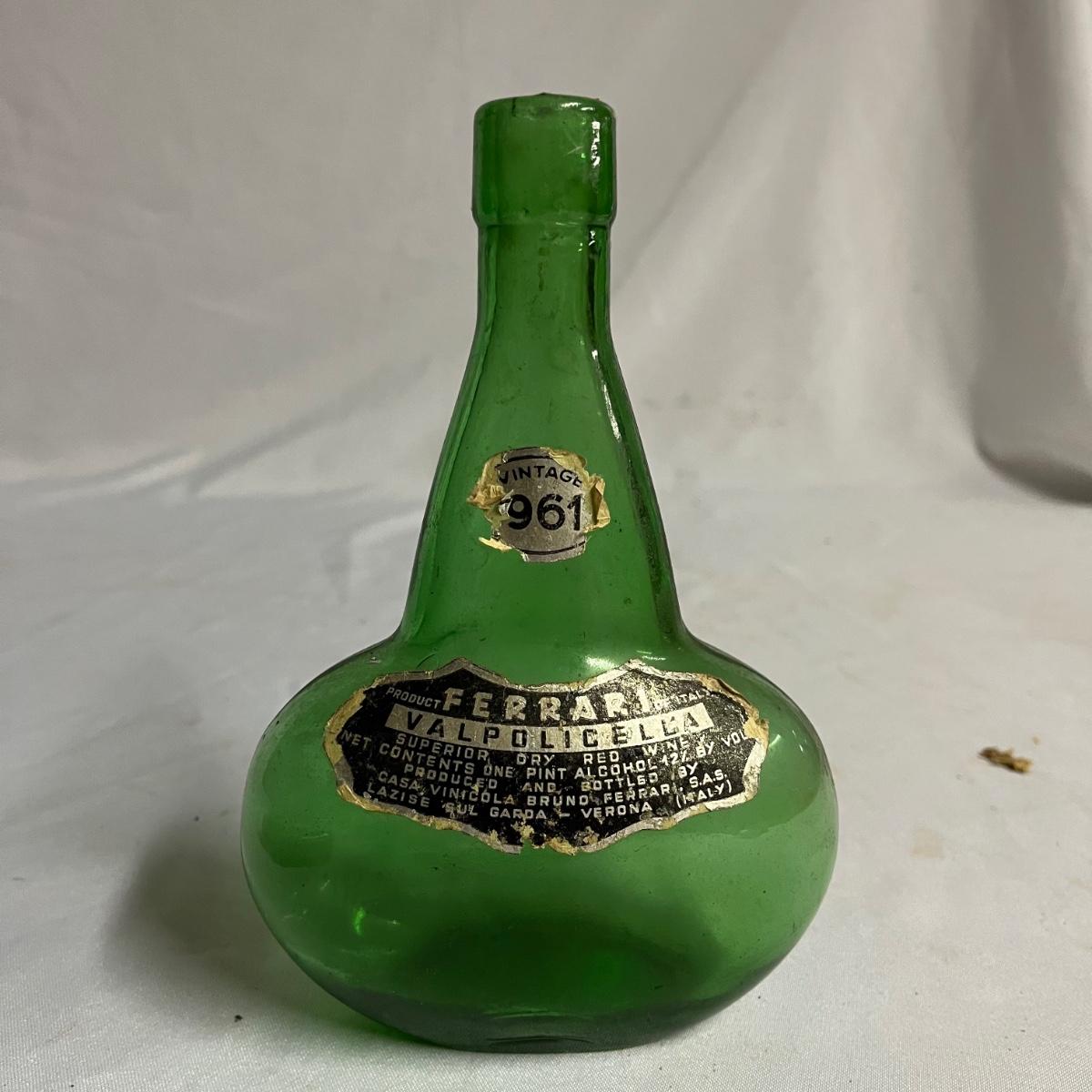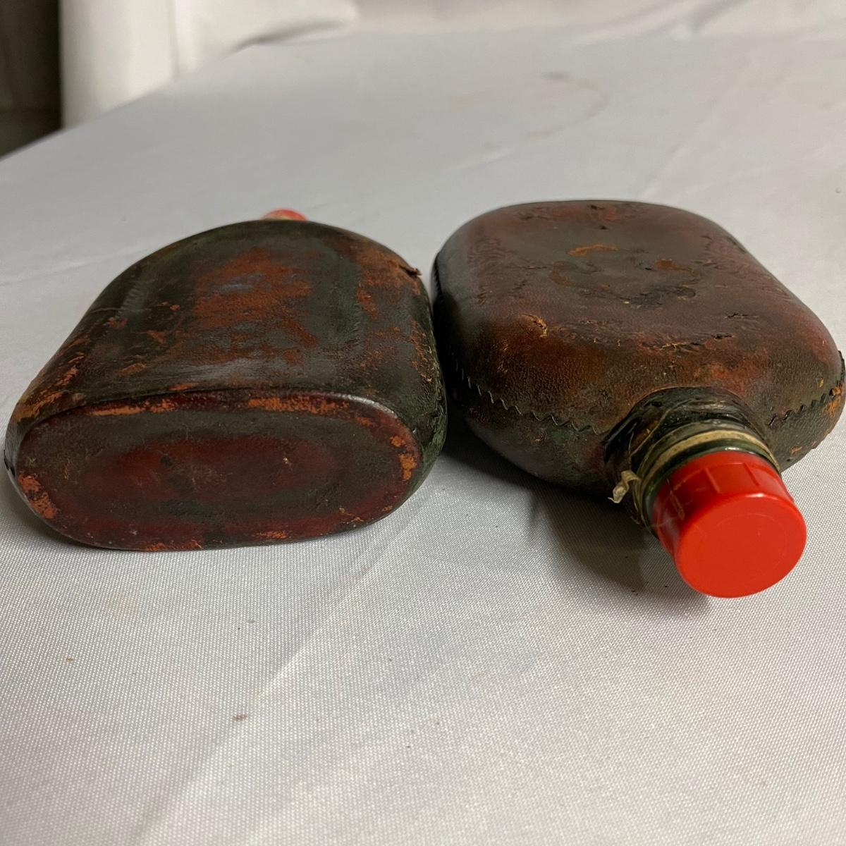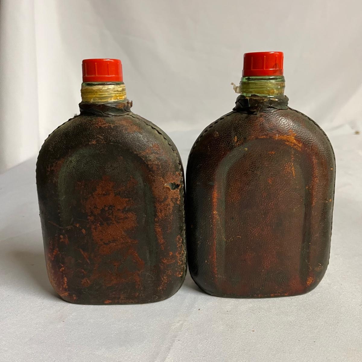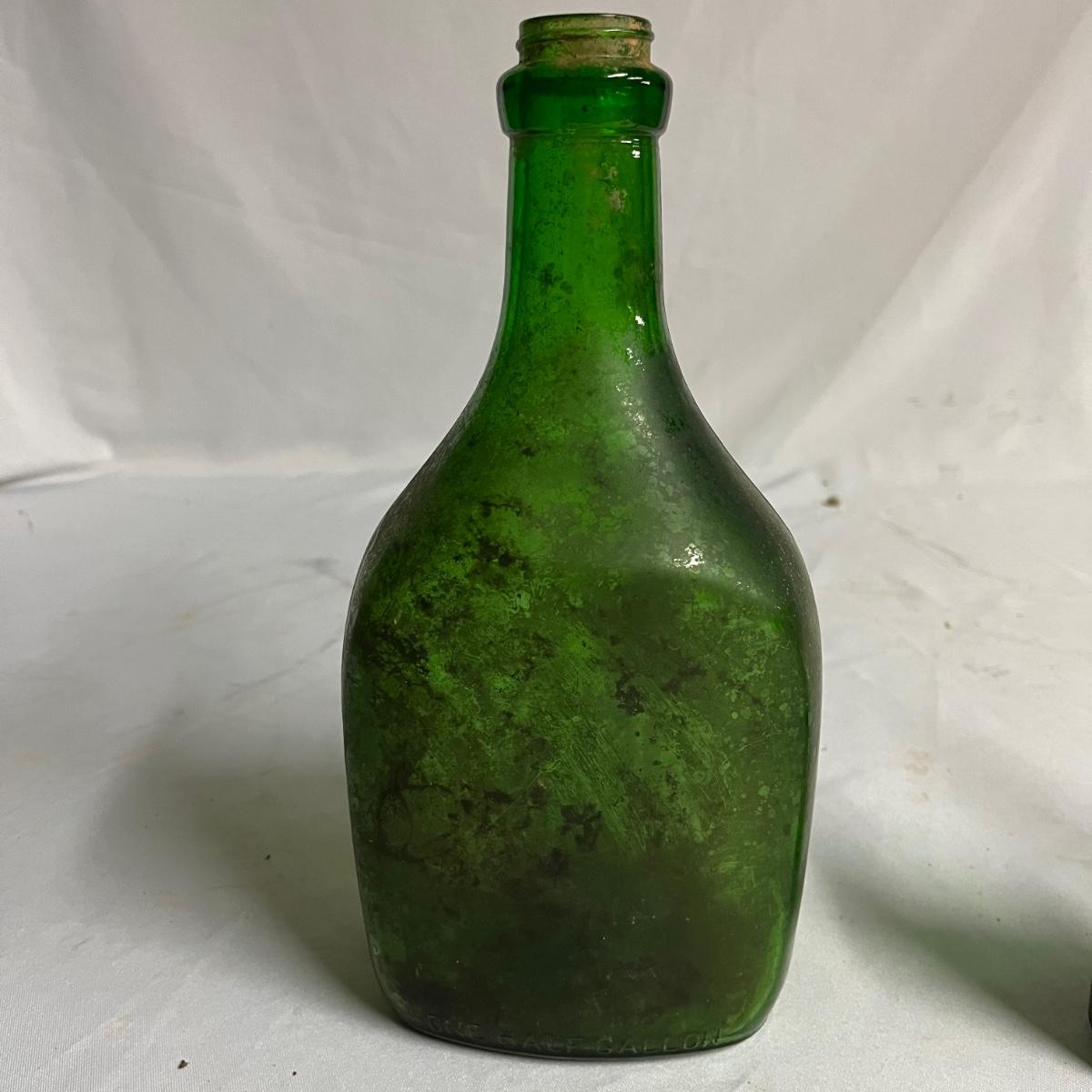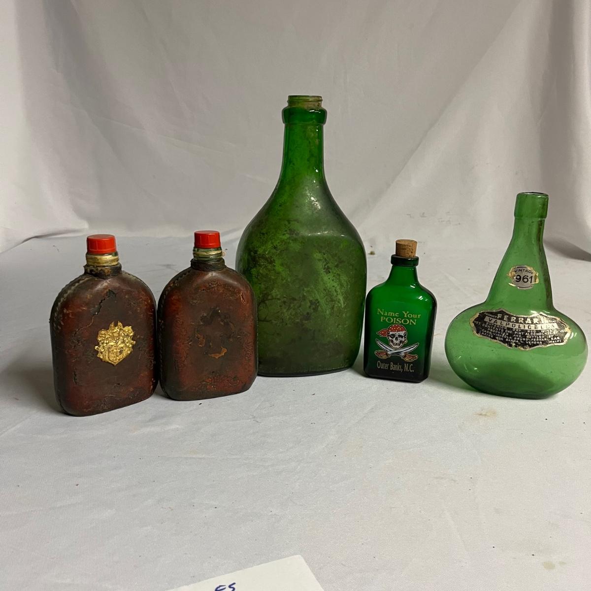 Lot includes two leather covered bottles, Ferrari wine bottle, 1/2 gallon bottle and a souvenir bottle from the Outer Banks. Largest bottle measures 3.5” x 5” x 12”. All bottles are made of glass.