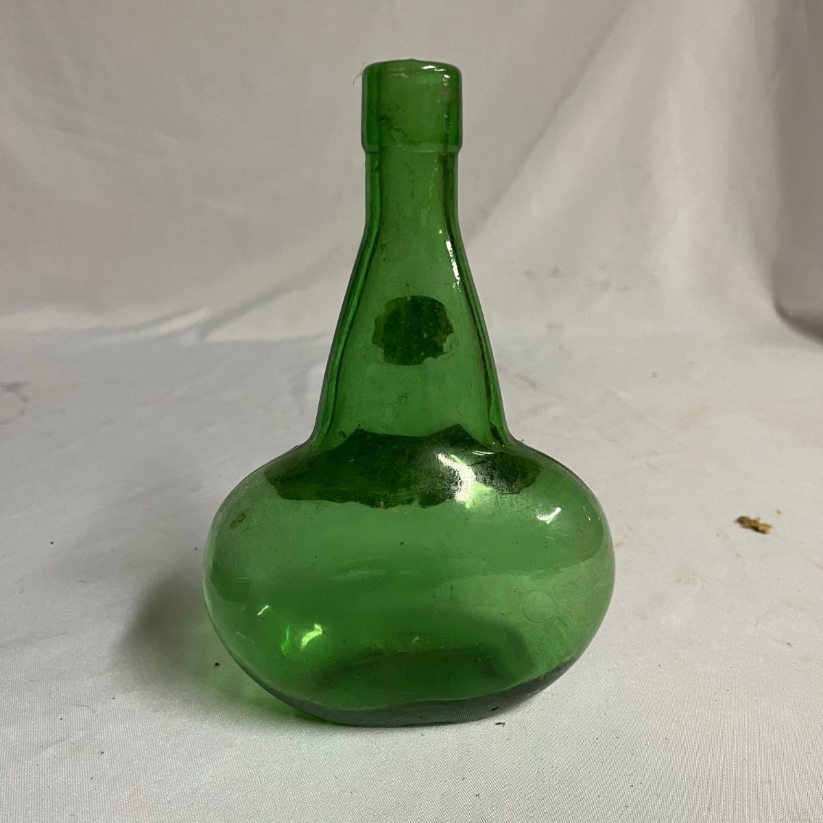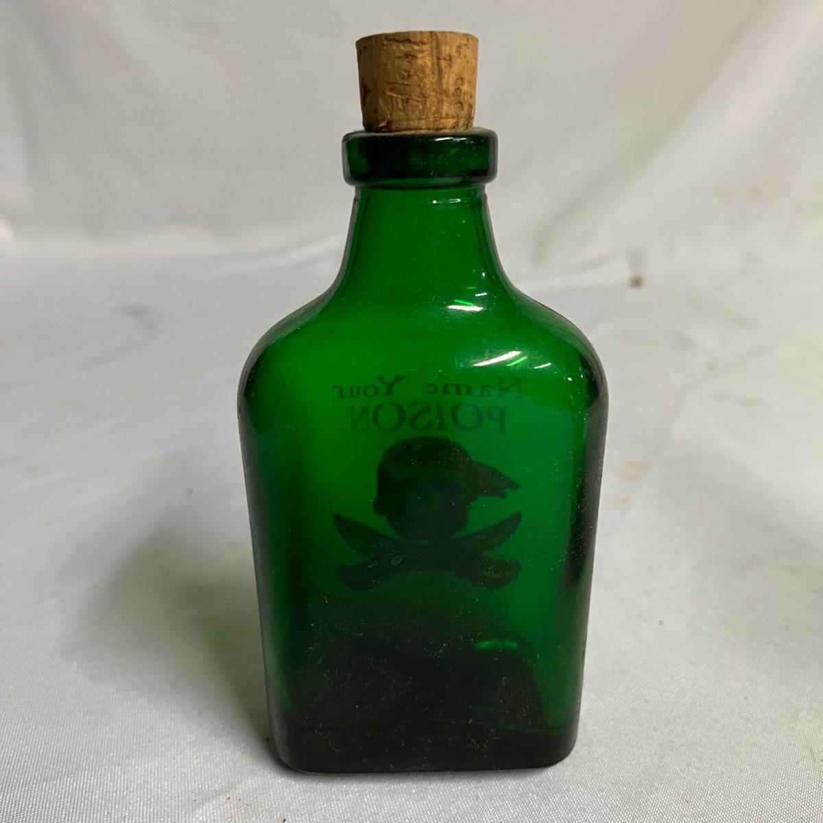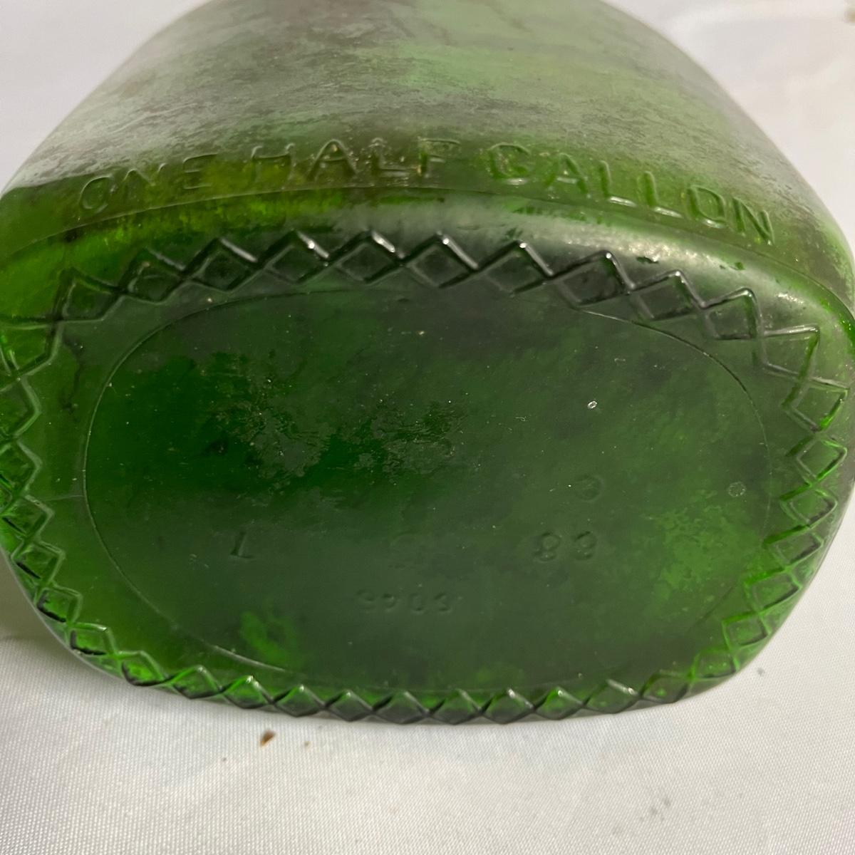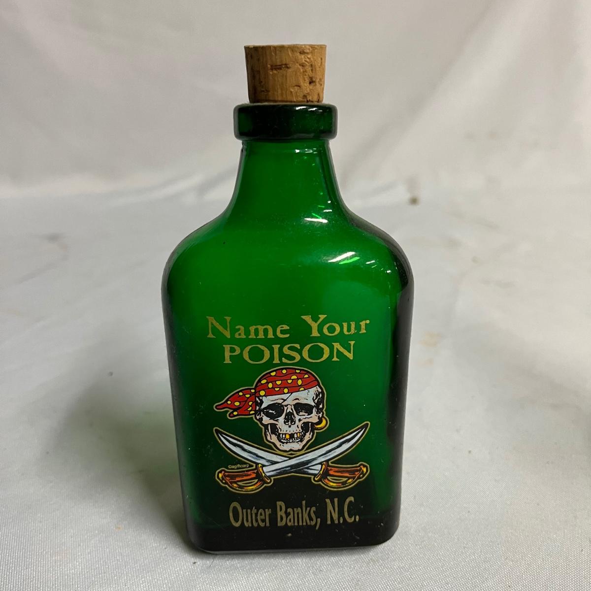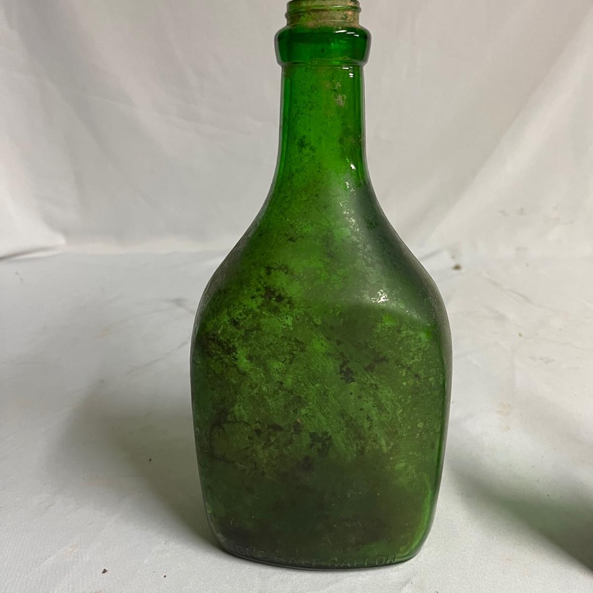 Lot includes two leather covered bottles, Ferrari wine bottle, 1/2 gallon bottle and a souvenir bottle from the Outer Banks. Largest bottle measures 3.5” x 5” x 12”. All bottles are made of glass.