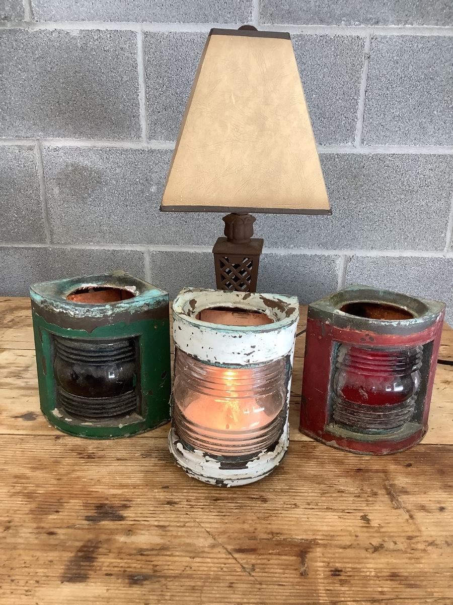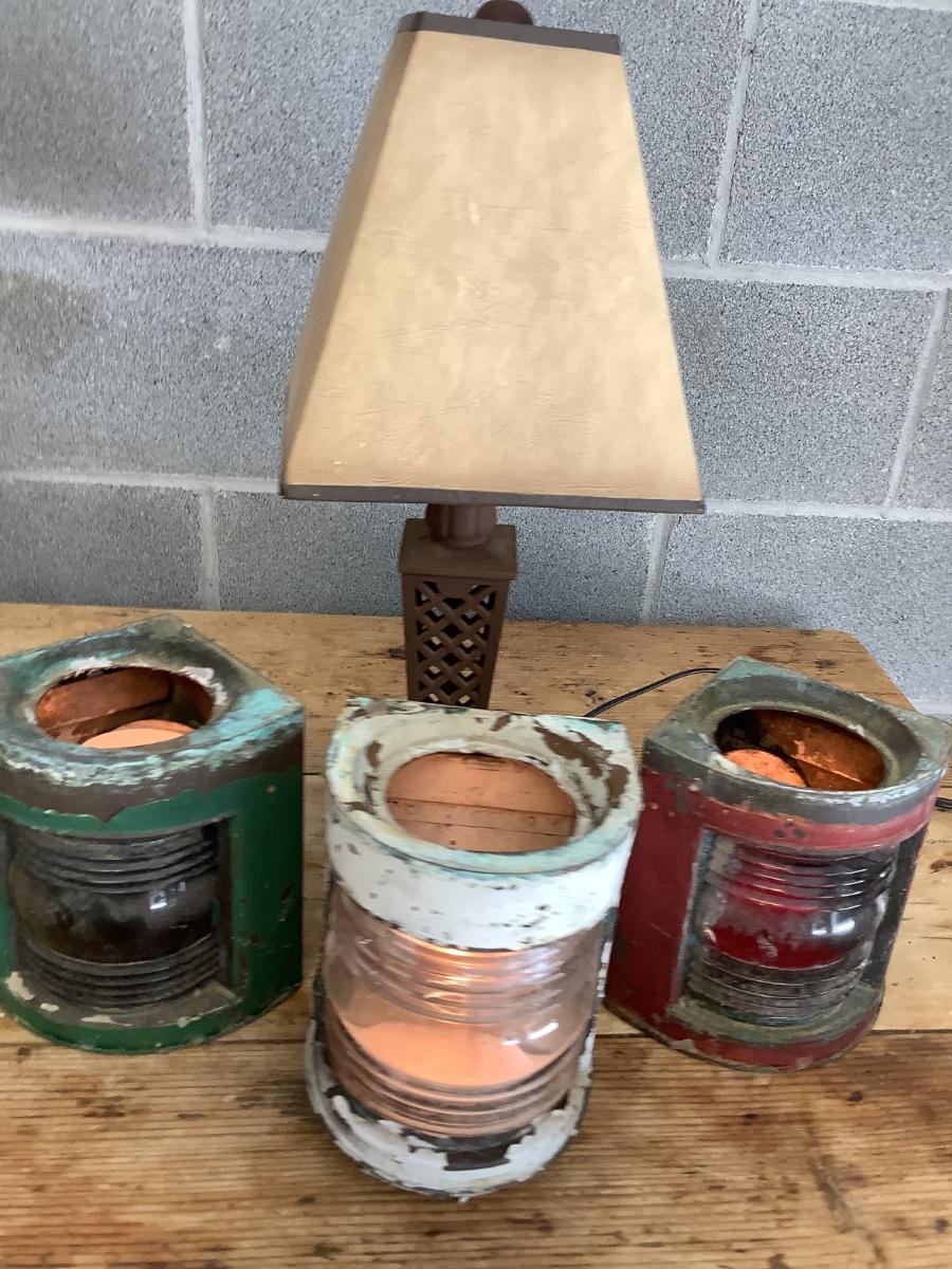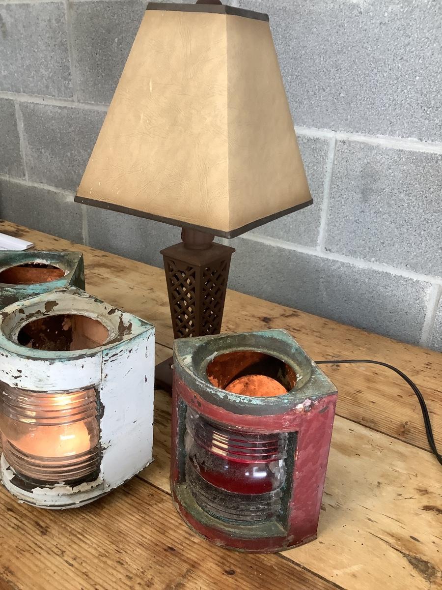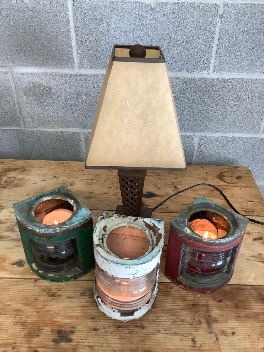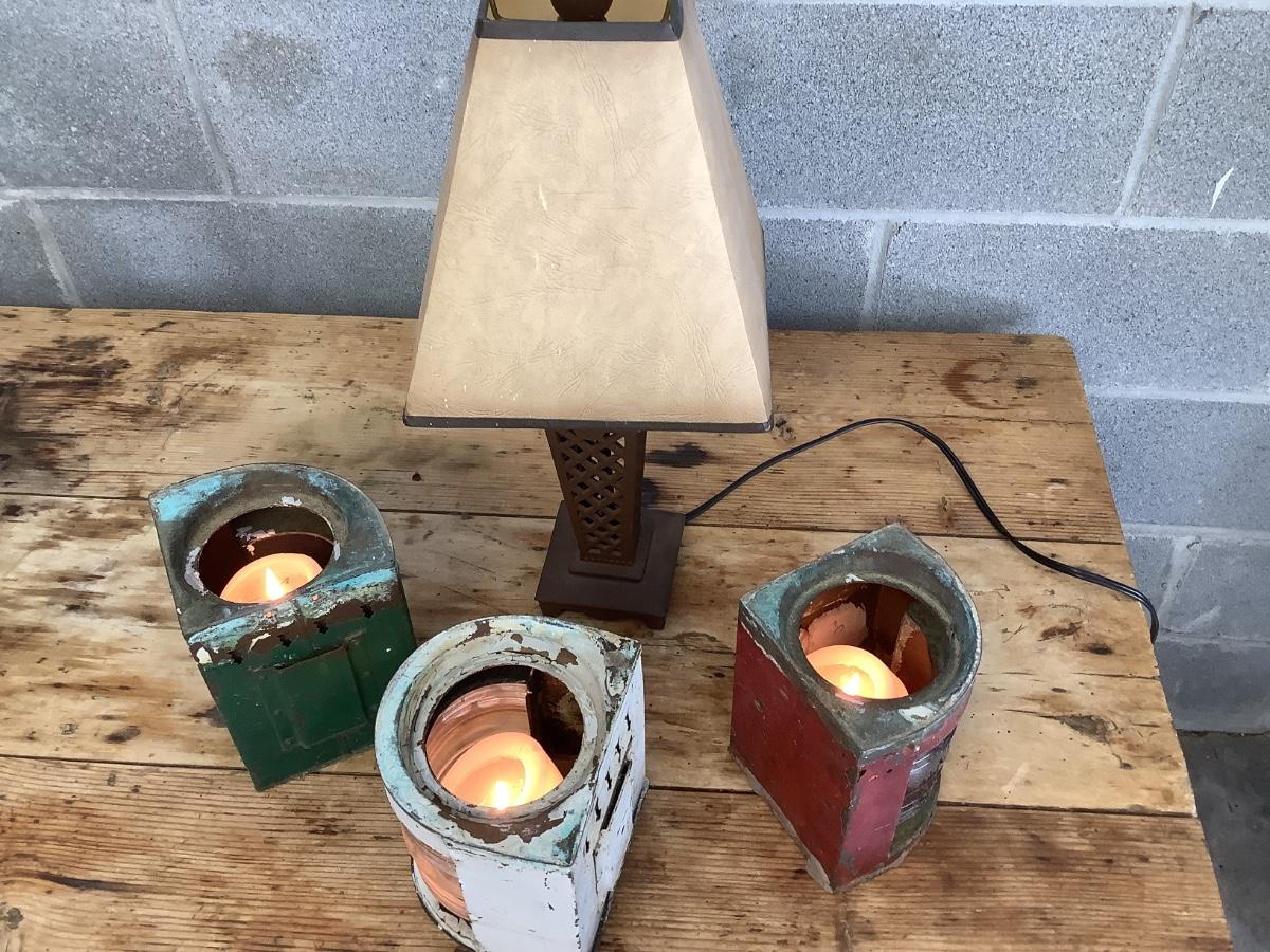 Vintage Bow & stern running lights shown with candles and a lamp