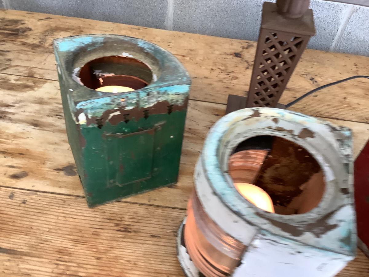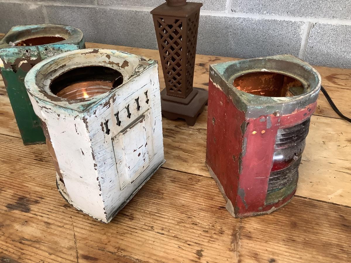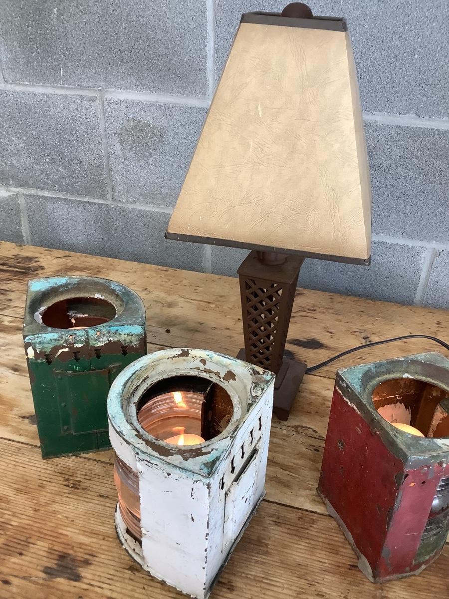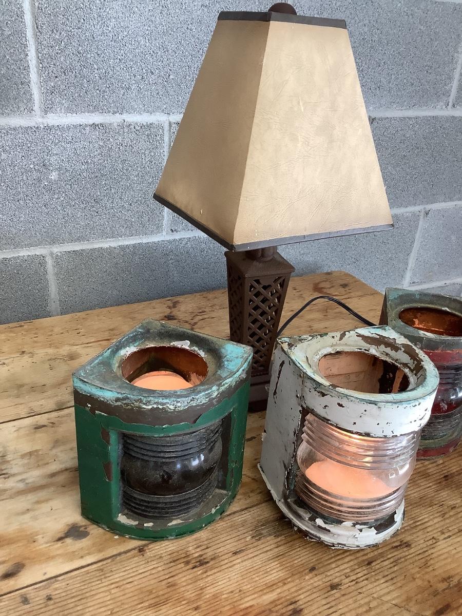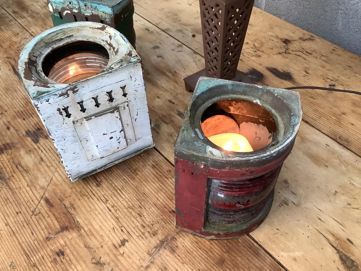 Vintage Bow & stern running lights shown with candles and a lamp
