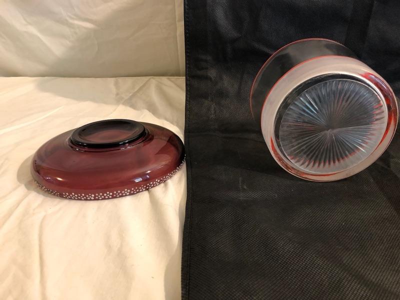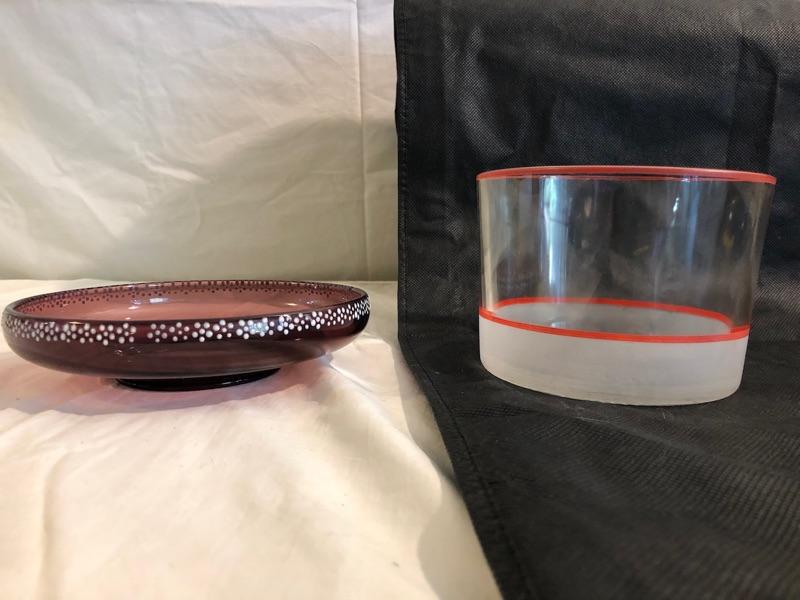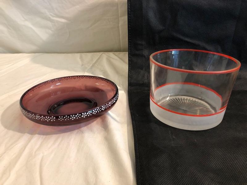 2 vintage bowls. 1 purple with raised white polkadots on the rim the other is frosted at the base with a decorative red striping The purple dish is 7.25in diameter and 1.5in tall at the rim, the clear glass bowl is 5.75in diameter and 4.25in tall