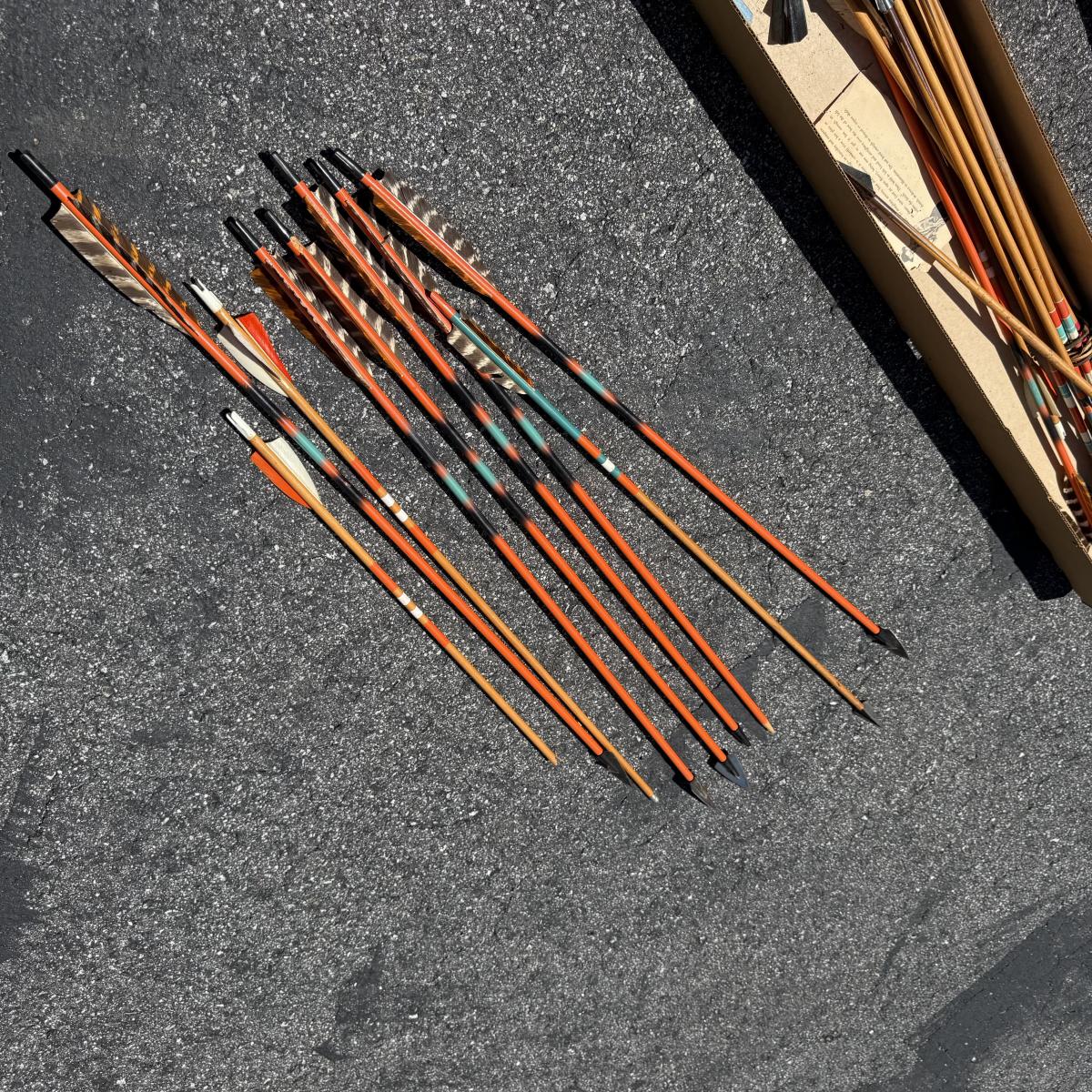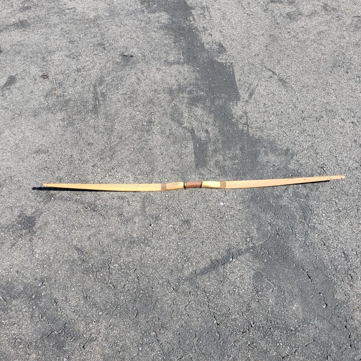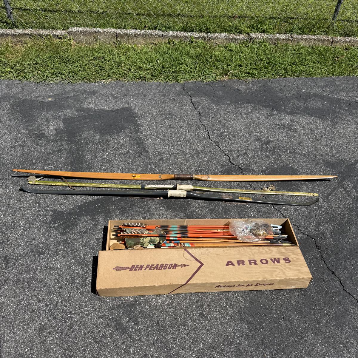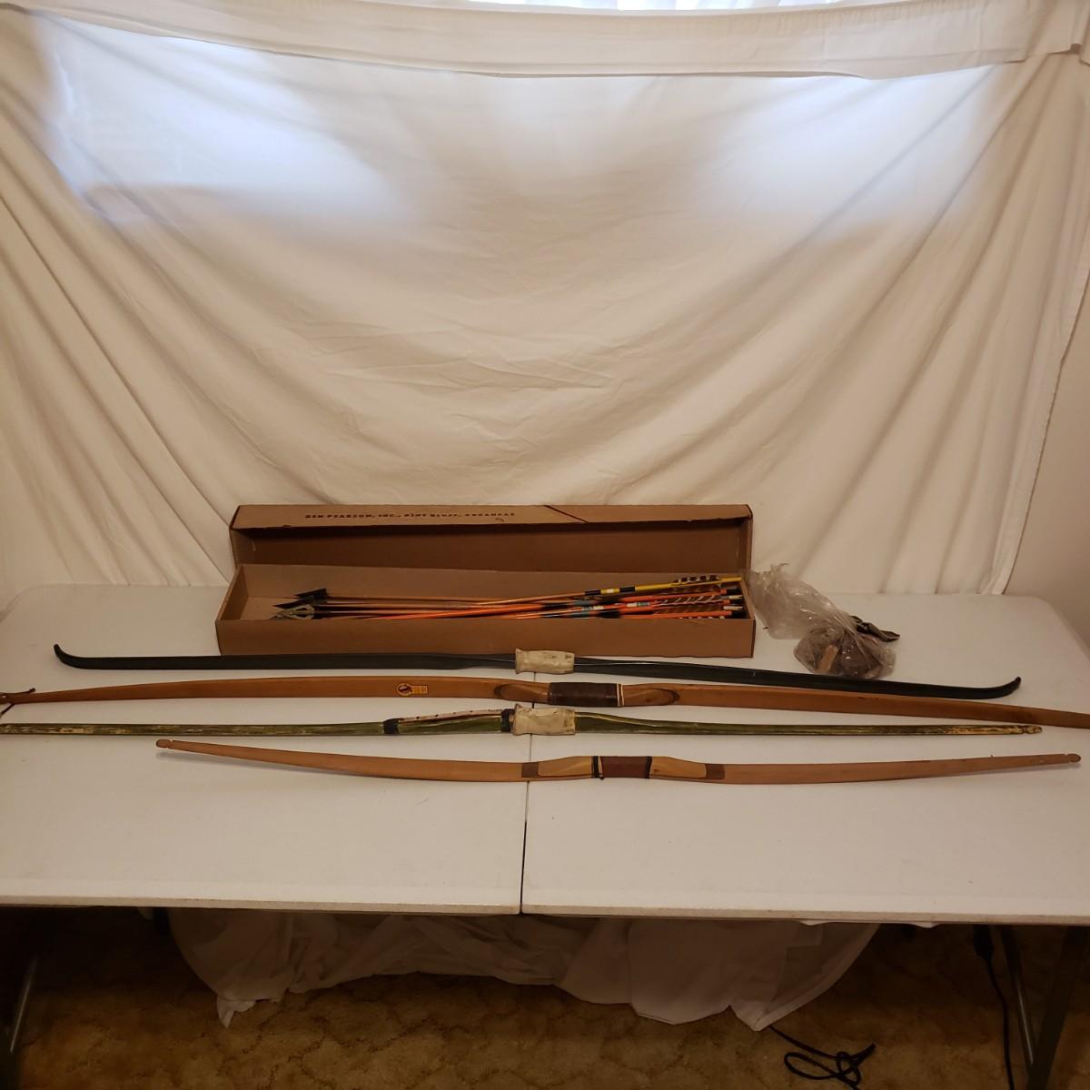 This lot contains four vintage bows and over 20+ arrows. The first is an Indian Archery wooden longbow with a leather grip and measures 1.5” x 68”. The next is a grey Amundson Archer bow that appears to be a plastic material with a plastic grip. This bow measures 1.25” x 60”. The Stemmler also appears to be some sort of plastic with a plastic grip. It measures .75” x 60”. The last bow pictured is unmarked. There is some tape separated at the handle. Also included are over 20 arrows with metal tips and feather backs which appear to be made of wood and a wrist guard. Shipping available