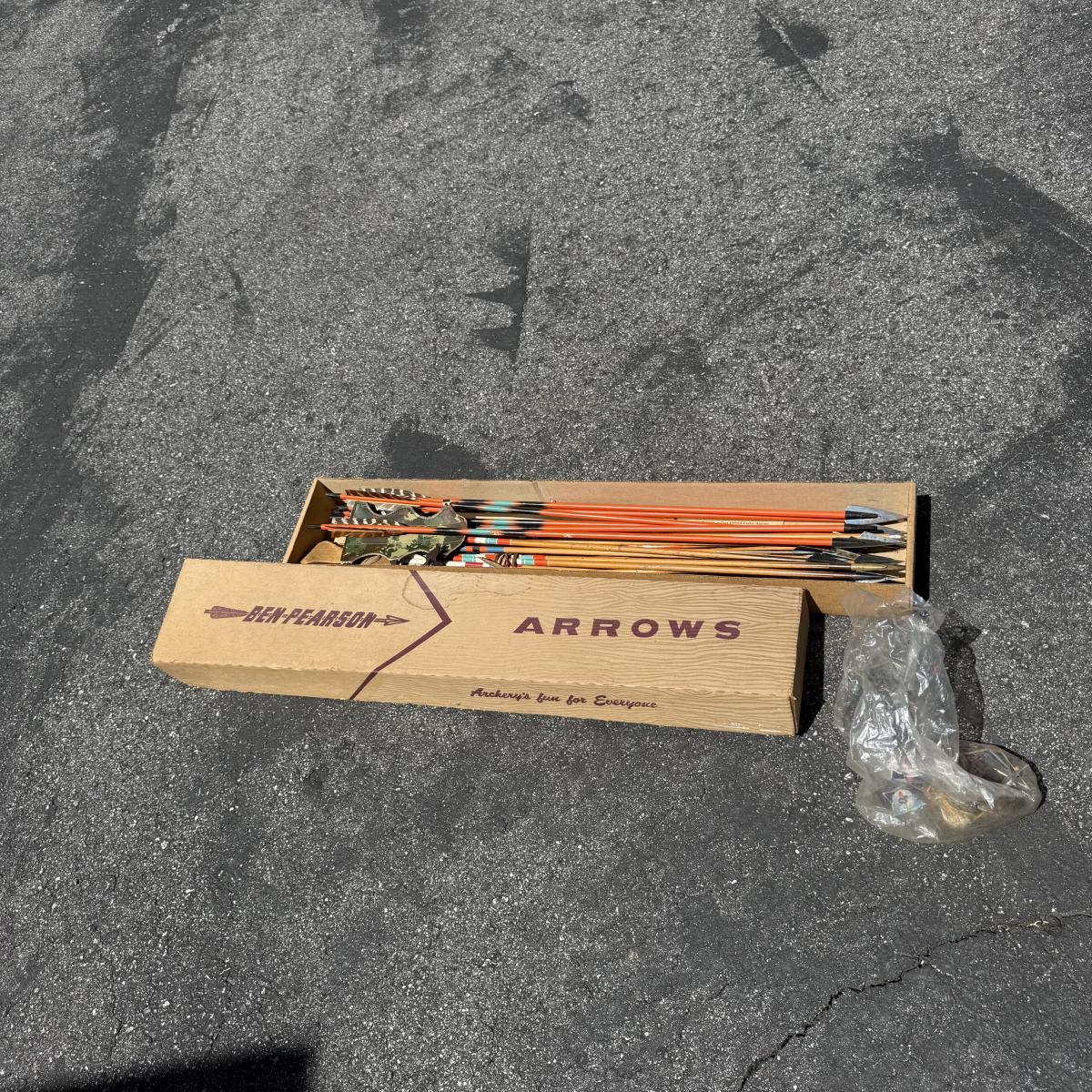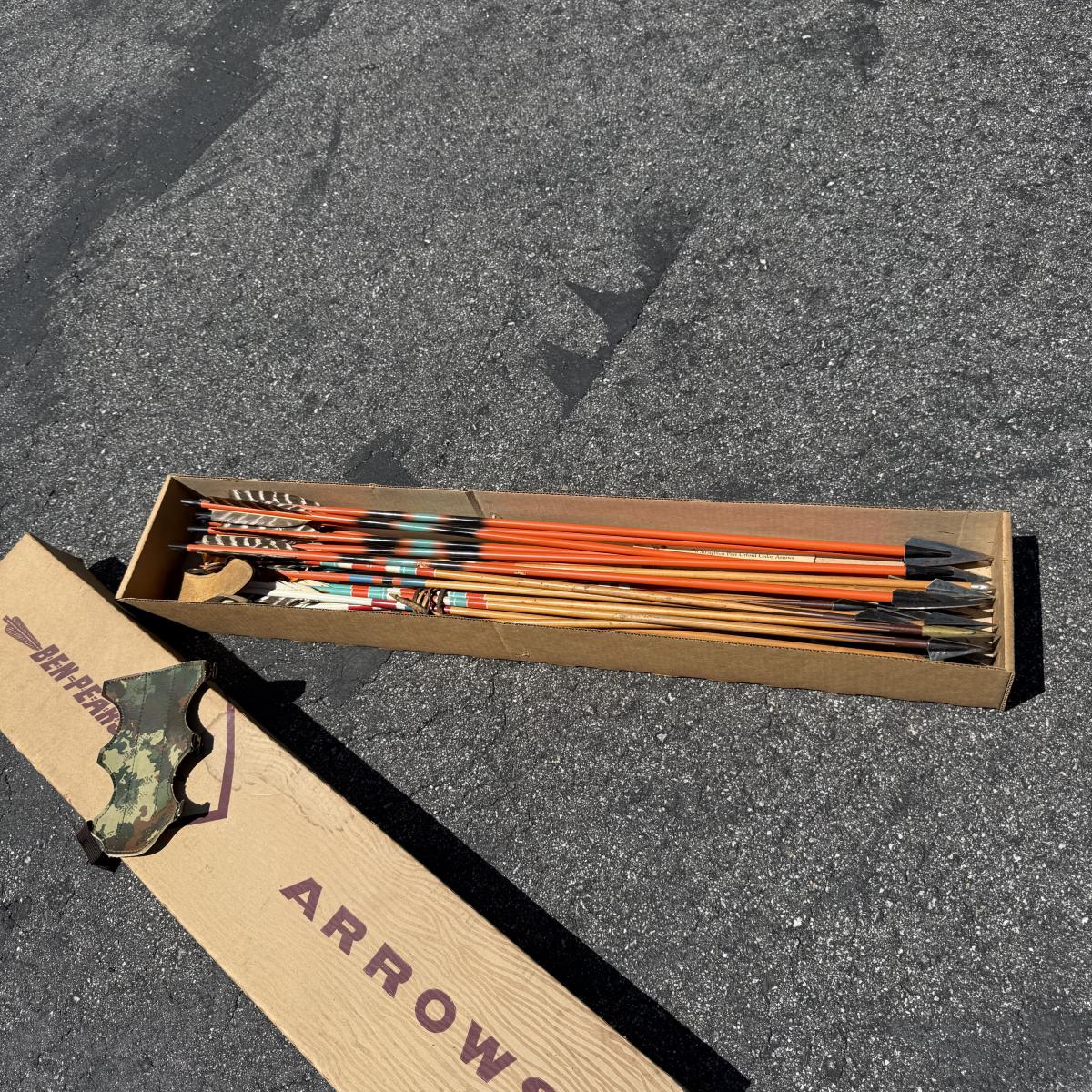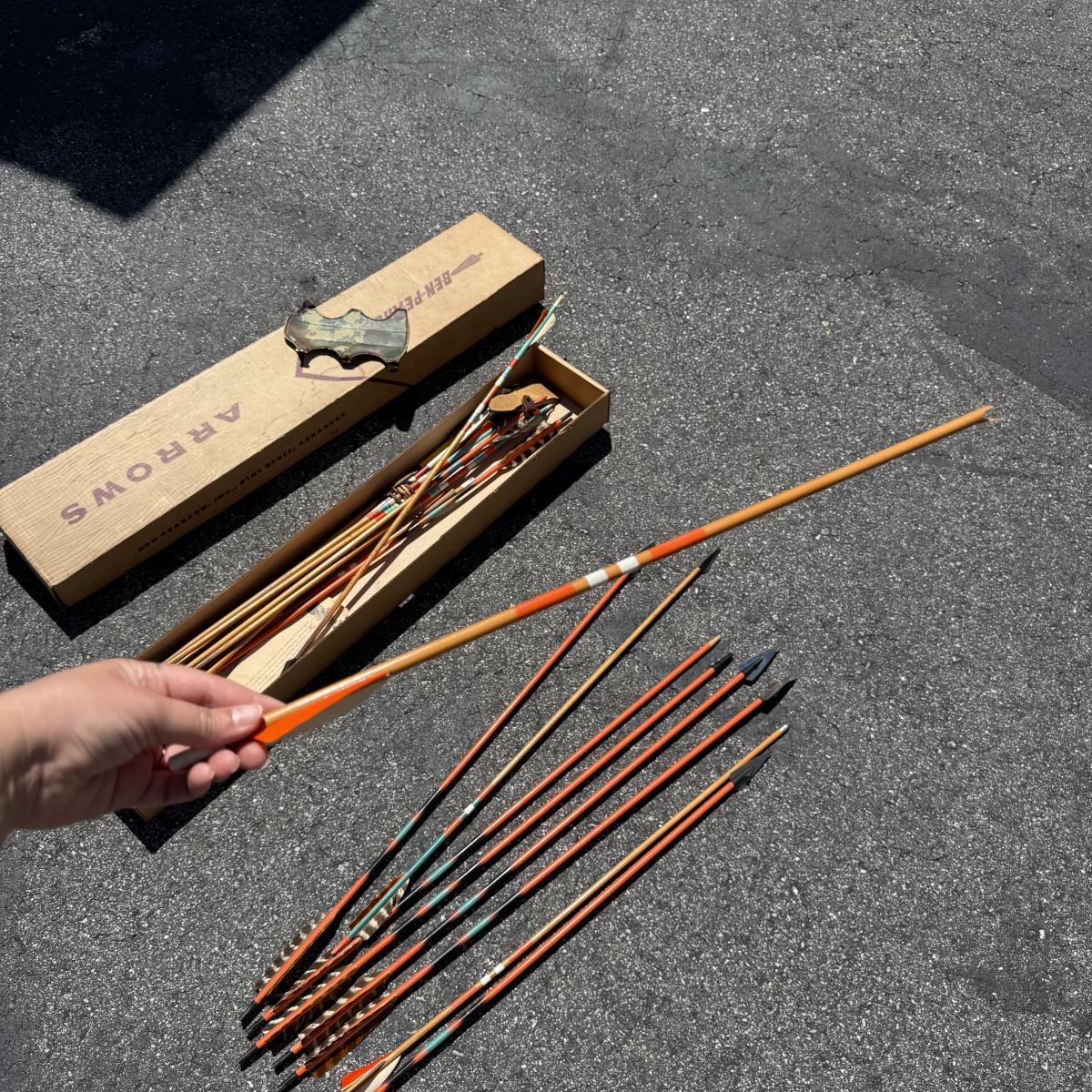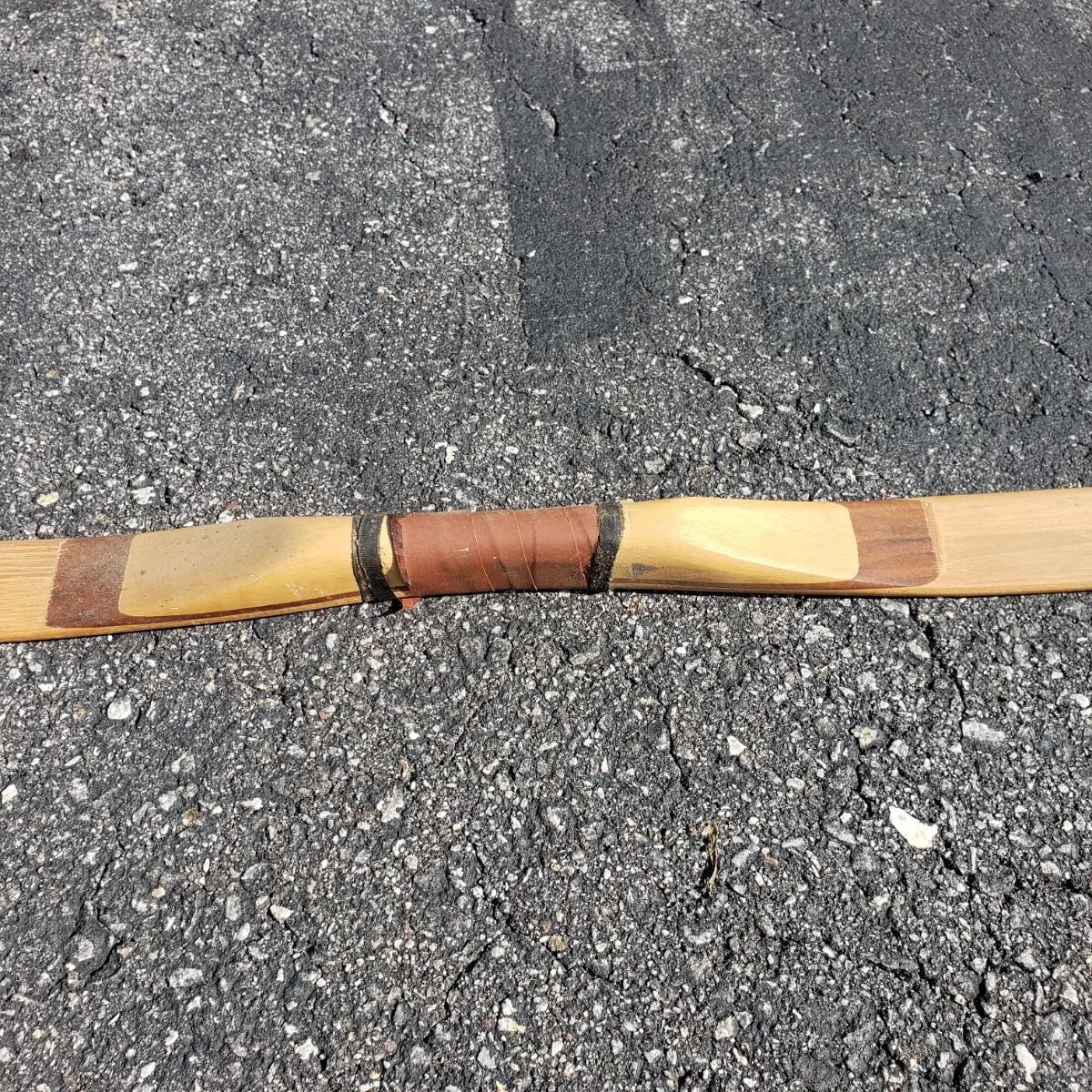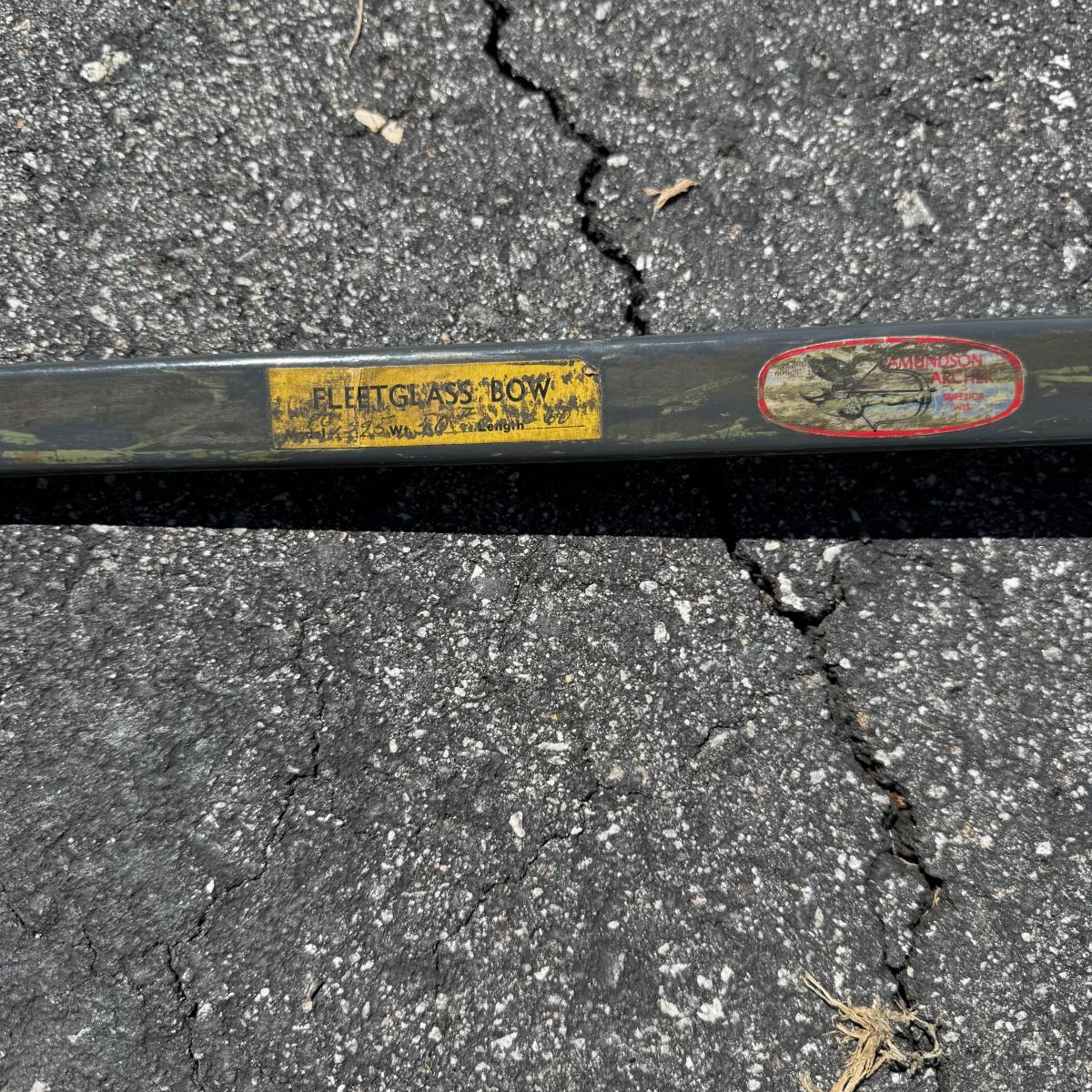 This lot contains four vintage bows and over 20+ arrows. The first is an Indian Archery wooden longbow with a leather grip and measures 1.5” x 68”. The next is a grey Amundson Archer bow that appears to be a plastic material with a plastic grip. This bow measures 1.25” x 60”. The Stemmler also appears to be some sort of plastic with a plastic grip. It measures .75” x 60”. The last bow pictured is unmarked. There is some tape separated at the handle. Also included are over 20 arrows with metal tips and feather backs which appear to be made of wood and a wrist guard. Shipping available
