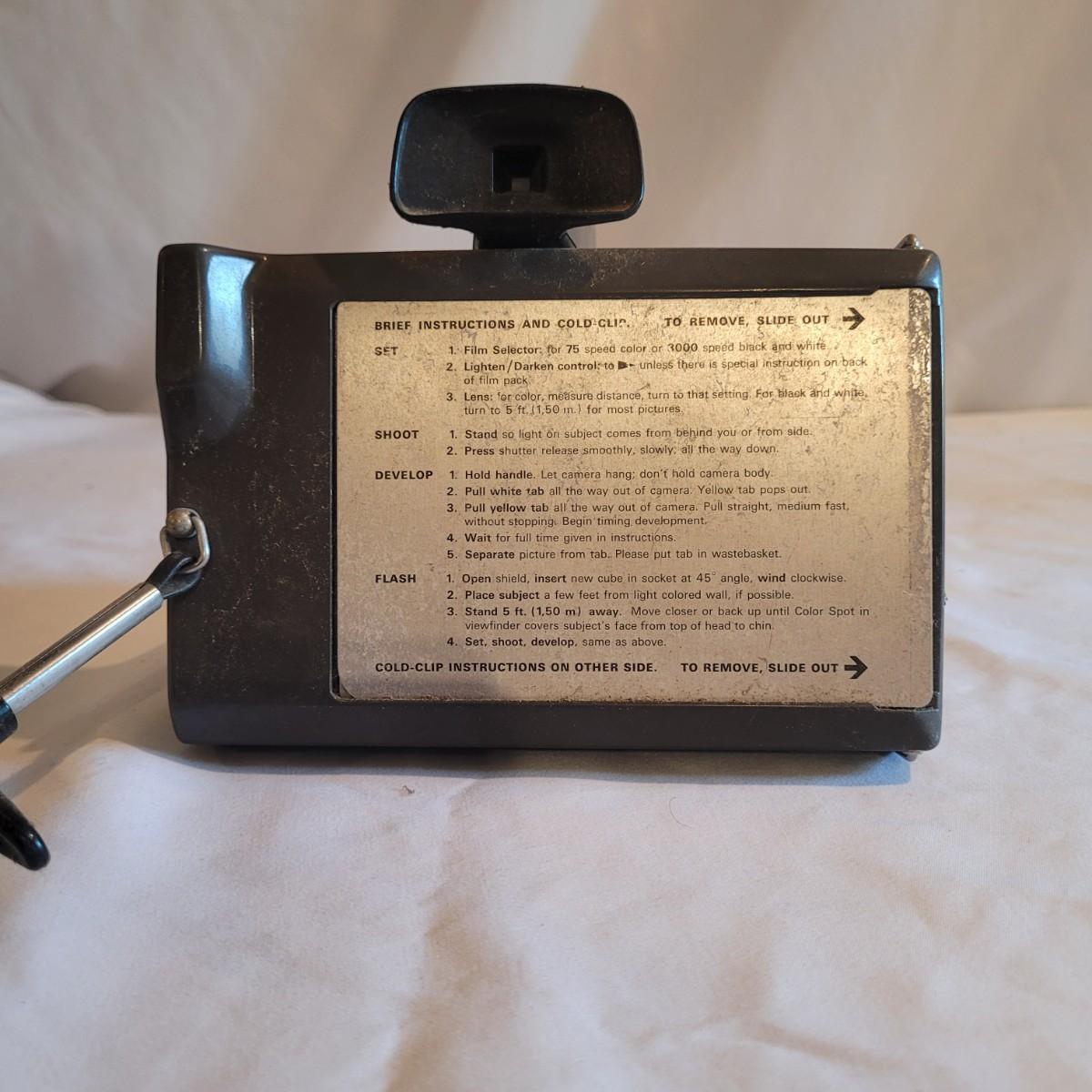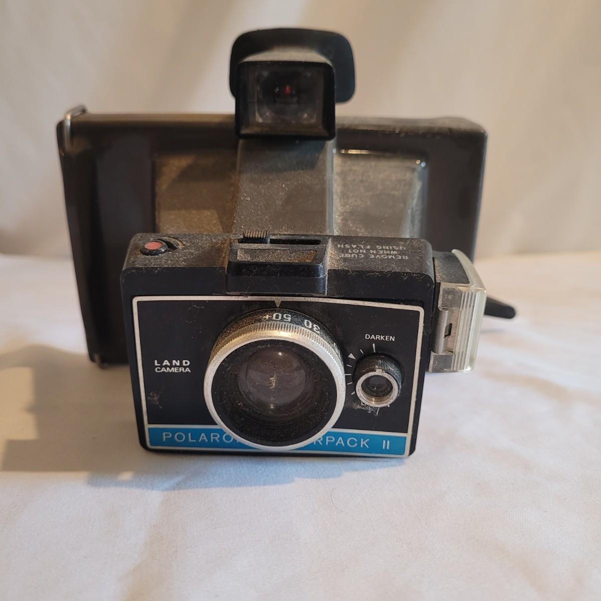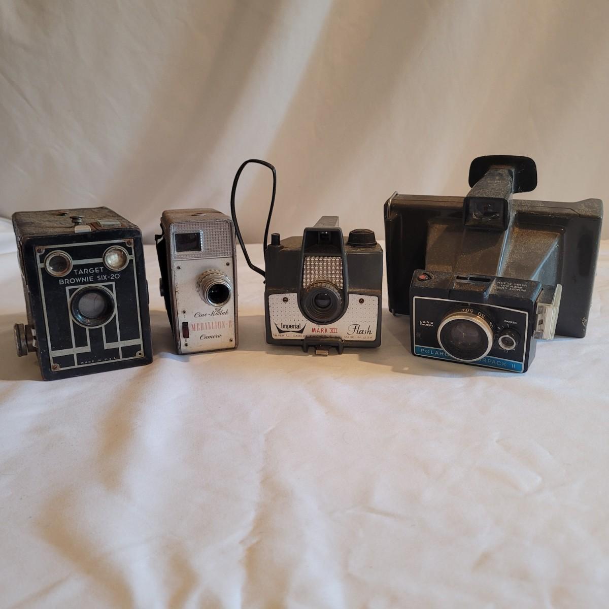 This lot includes four vintage box style cameras. The first camera is a Polaroid Colorpack 2. It features built in instructions and a carrying strap. The second camera is a Target Brownie Six-20. Manufactured in the late 30s and early 40s. The third camera is Cine-Kodak Medallion-8. It is a very small camera with many settings and features. The third camera is an Imperial Mark 7. It is a box style camera featuring a carrying strap. All cameras show signs of age. None of the cameras have been tested. The largest camera (the Polaroid) measures 7" x 7" x 6.5"H.
