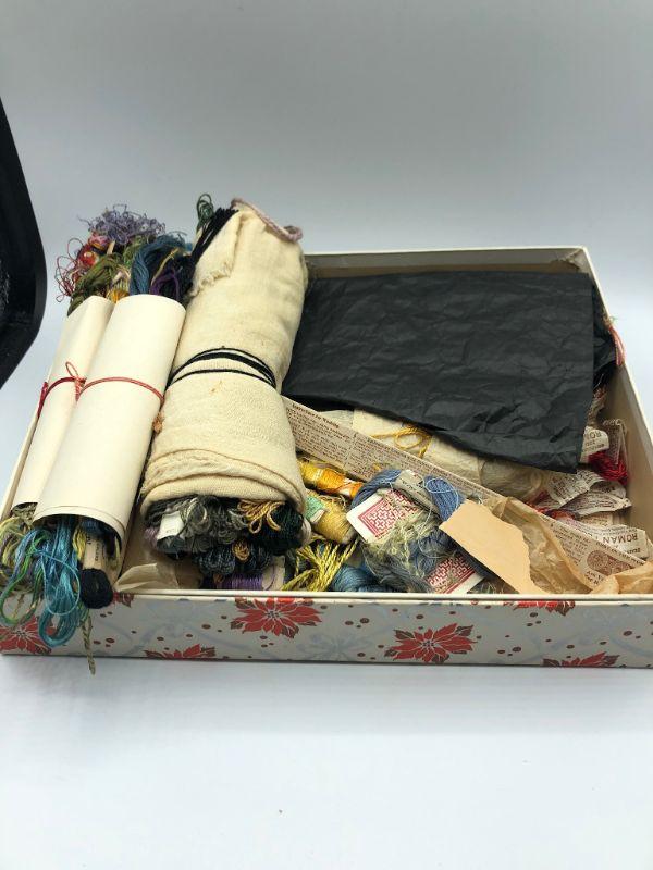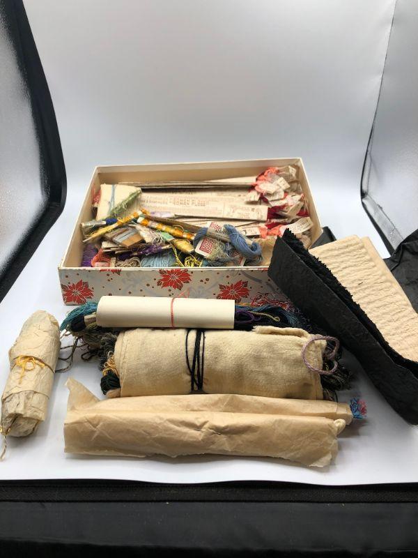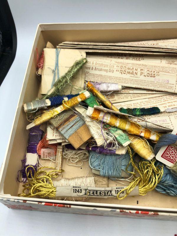 Vintage box of embroidery cross stitch thread floss. Some of the packages are unused. Wide variety of colors, styles, and lengths.