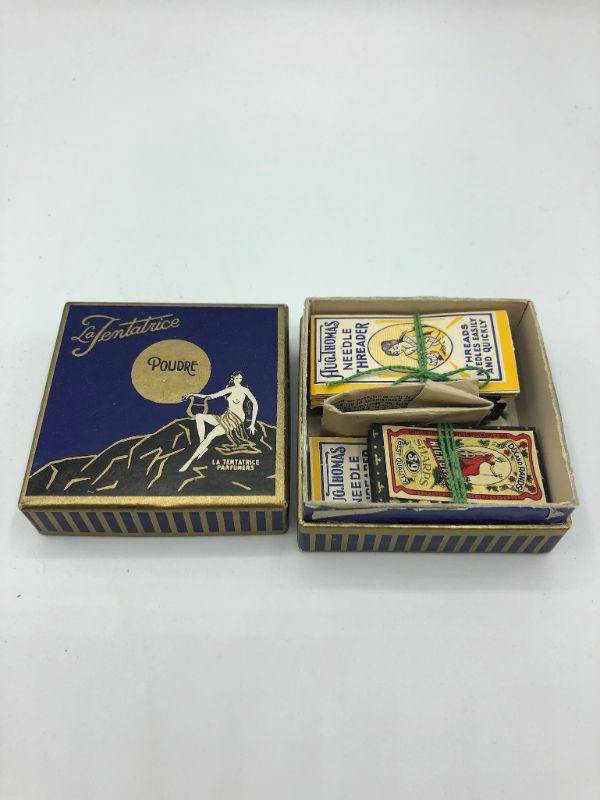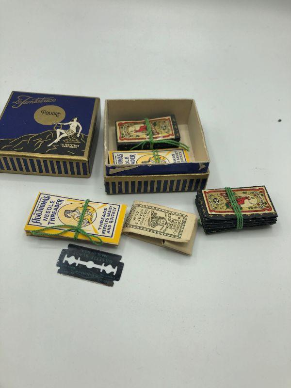 Small vintage box with multiple vintage sewing needle packages. Also has an old razor blade. Packages are in good vintage condition.