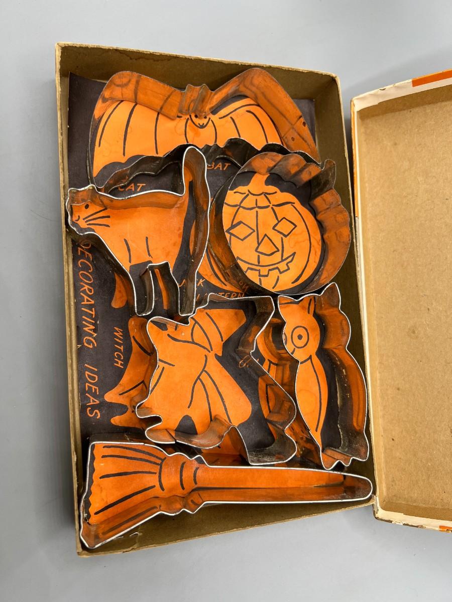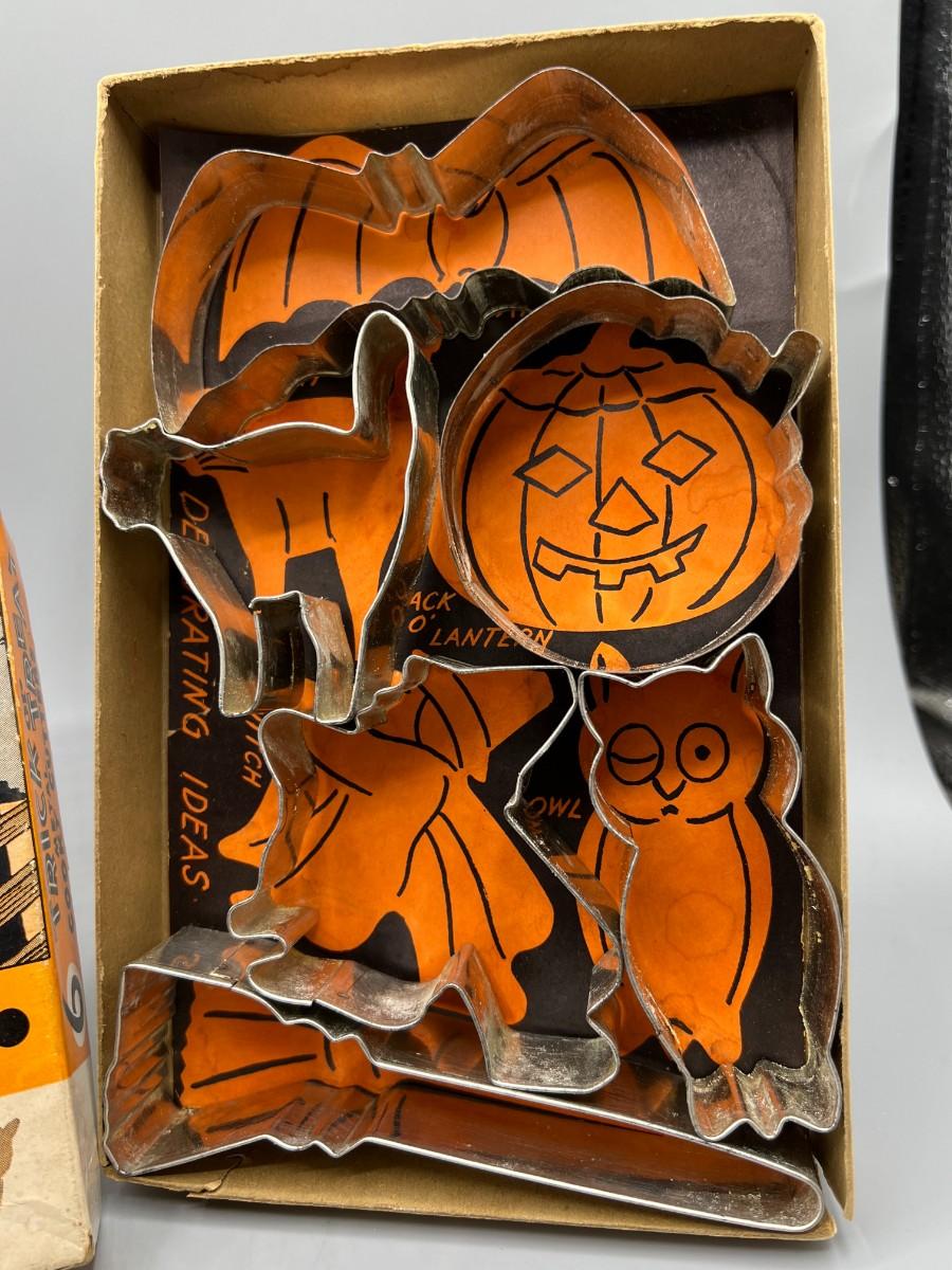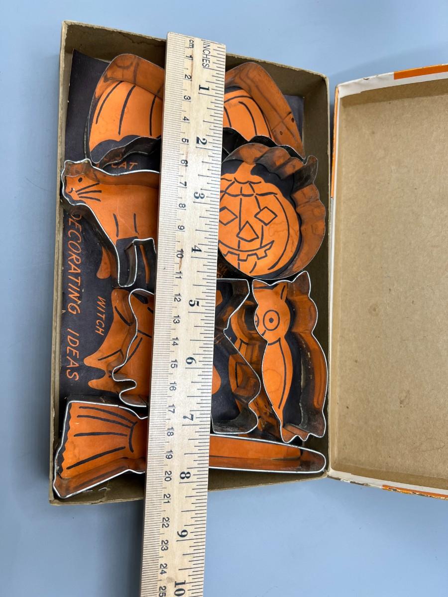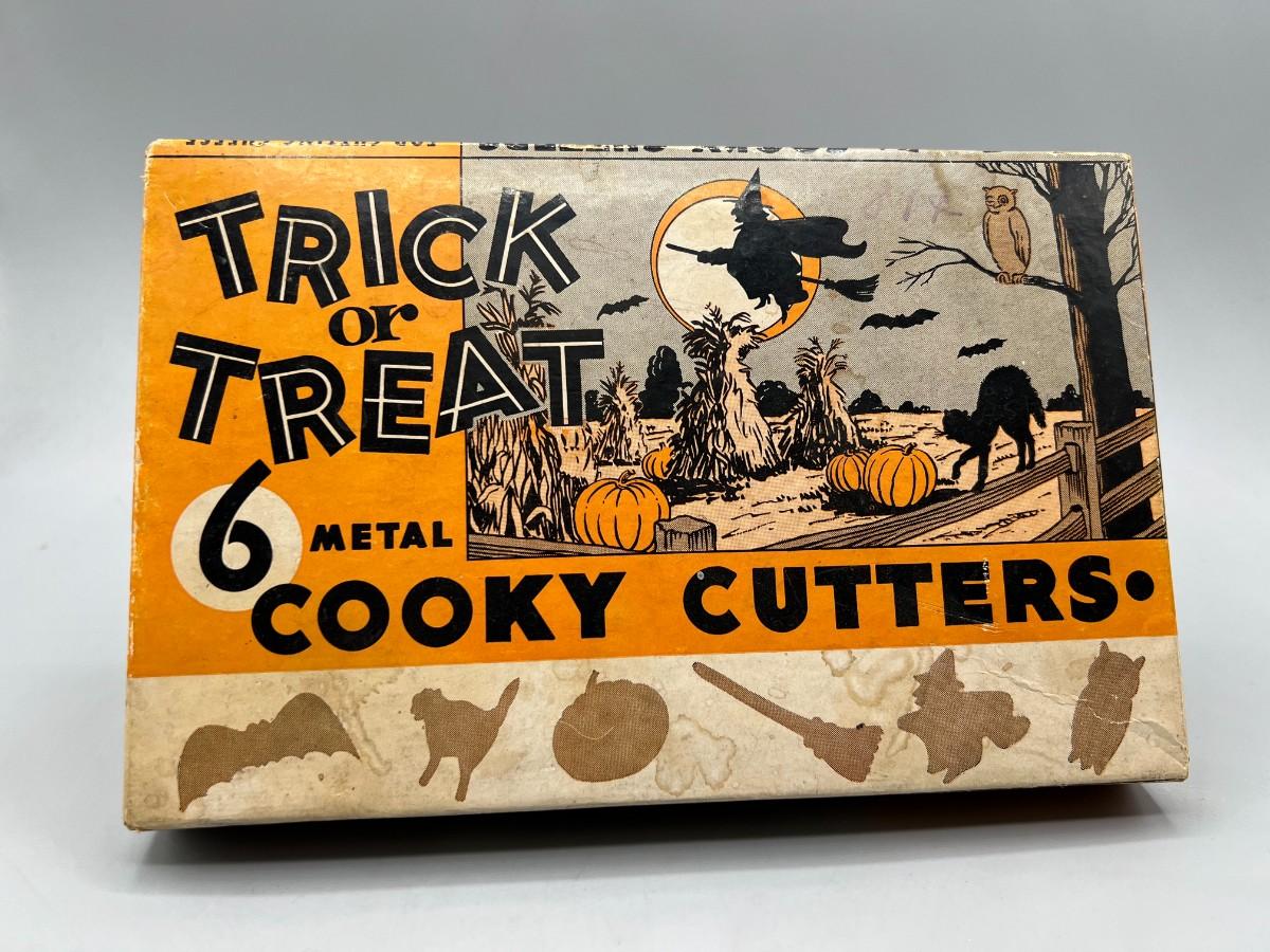 Vintage Box Set of Halloween Trick or Treat Cookie Cutters, Spooky Pumpkin, Flying WItch, & More