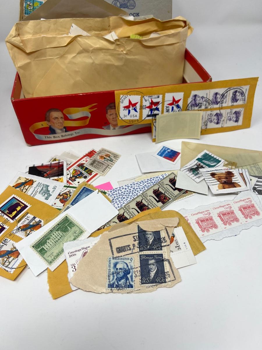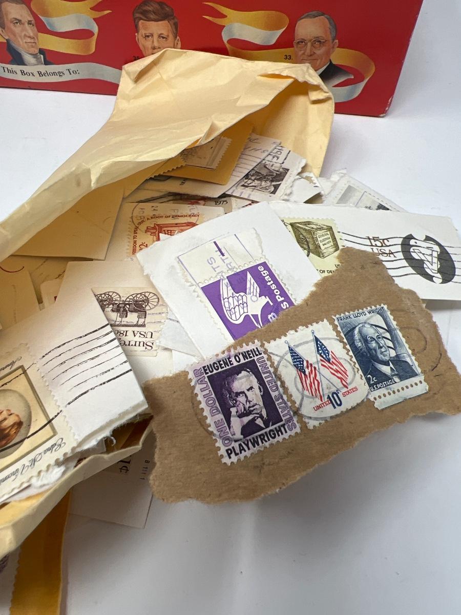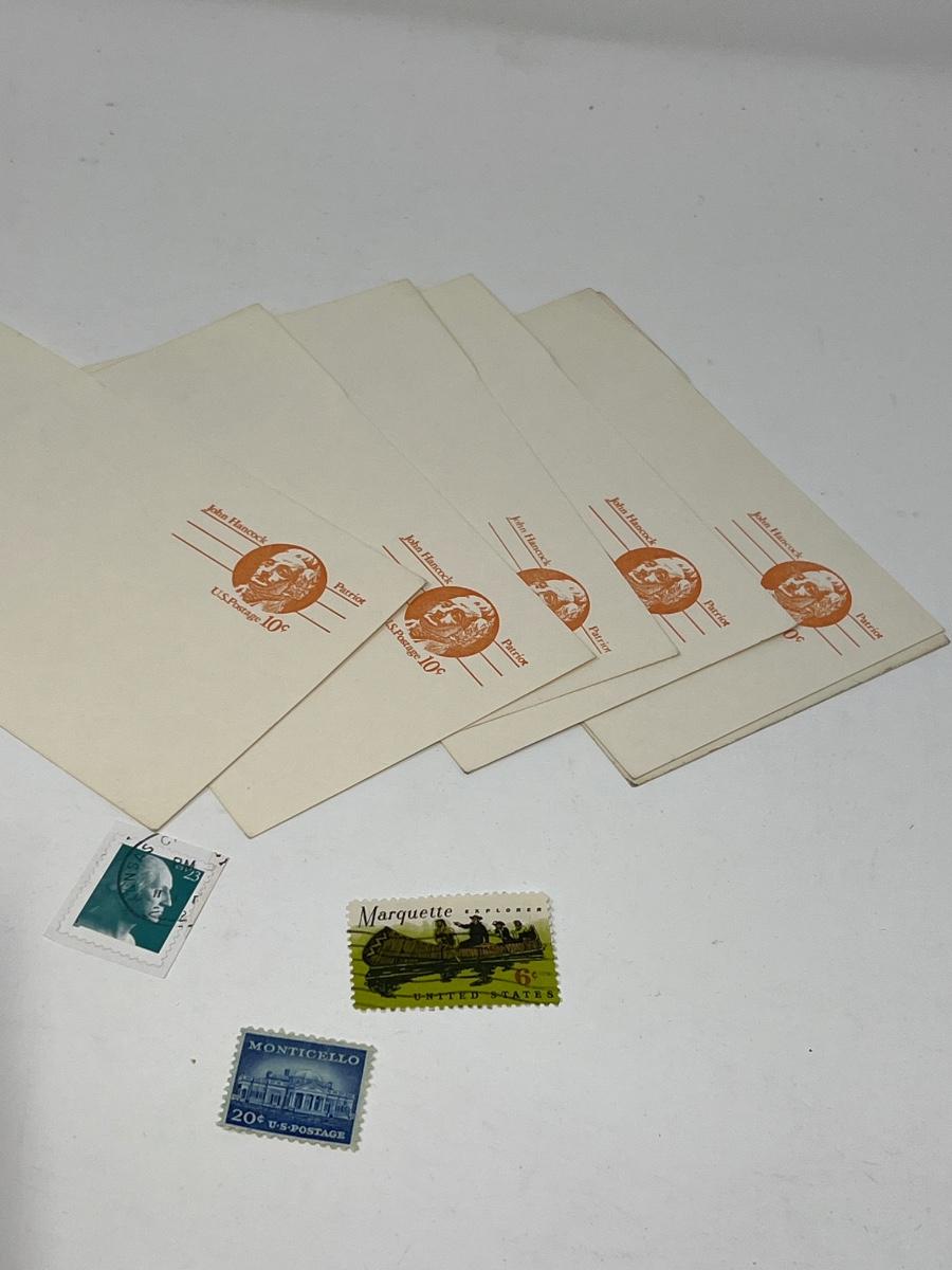 Variety of cancelled and live postage stamps from United States and Canada. 10 cent Hancock Postage Cards