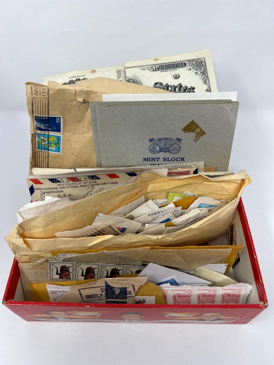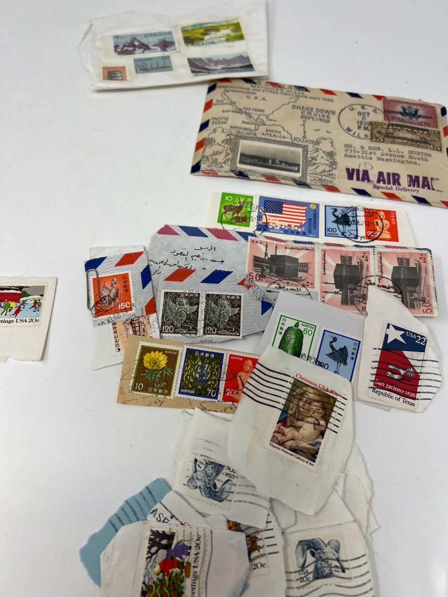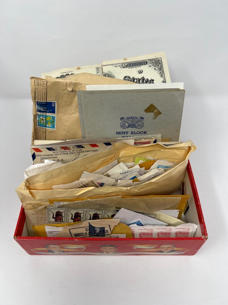 Variety of cancelled and live postage stamps from United States and Canada. 10 cent Hancock Postage Cards