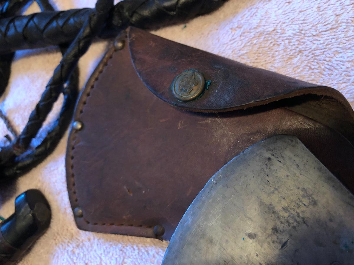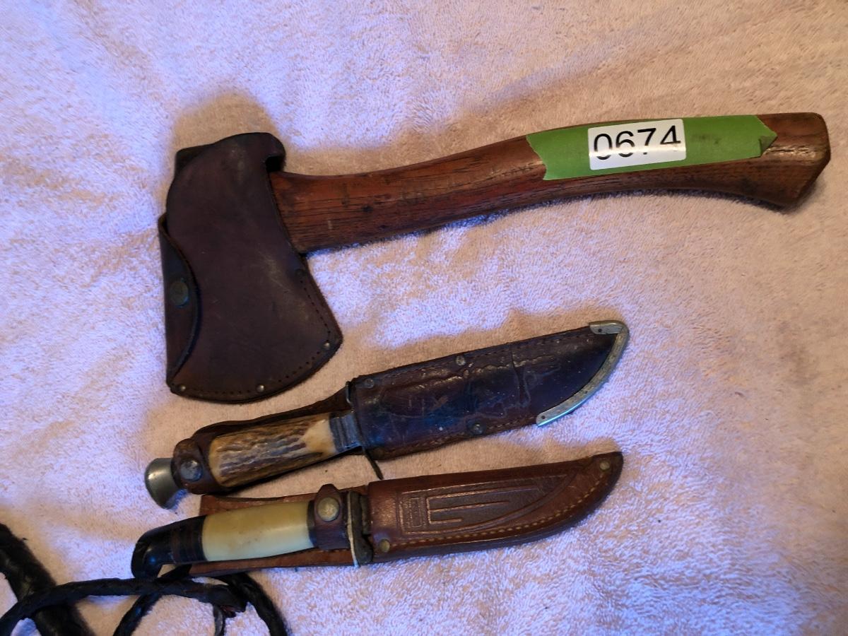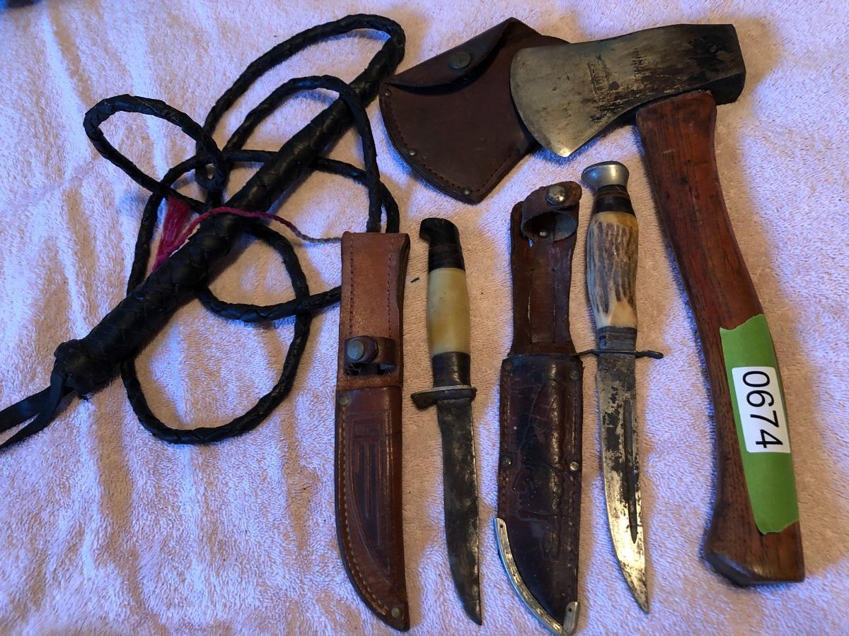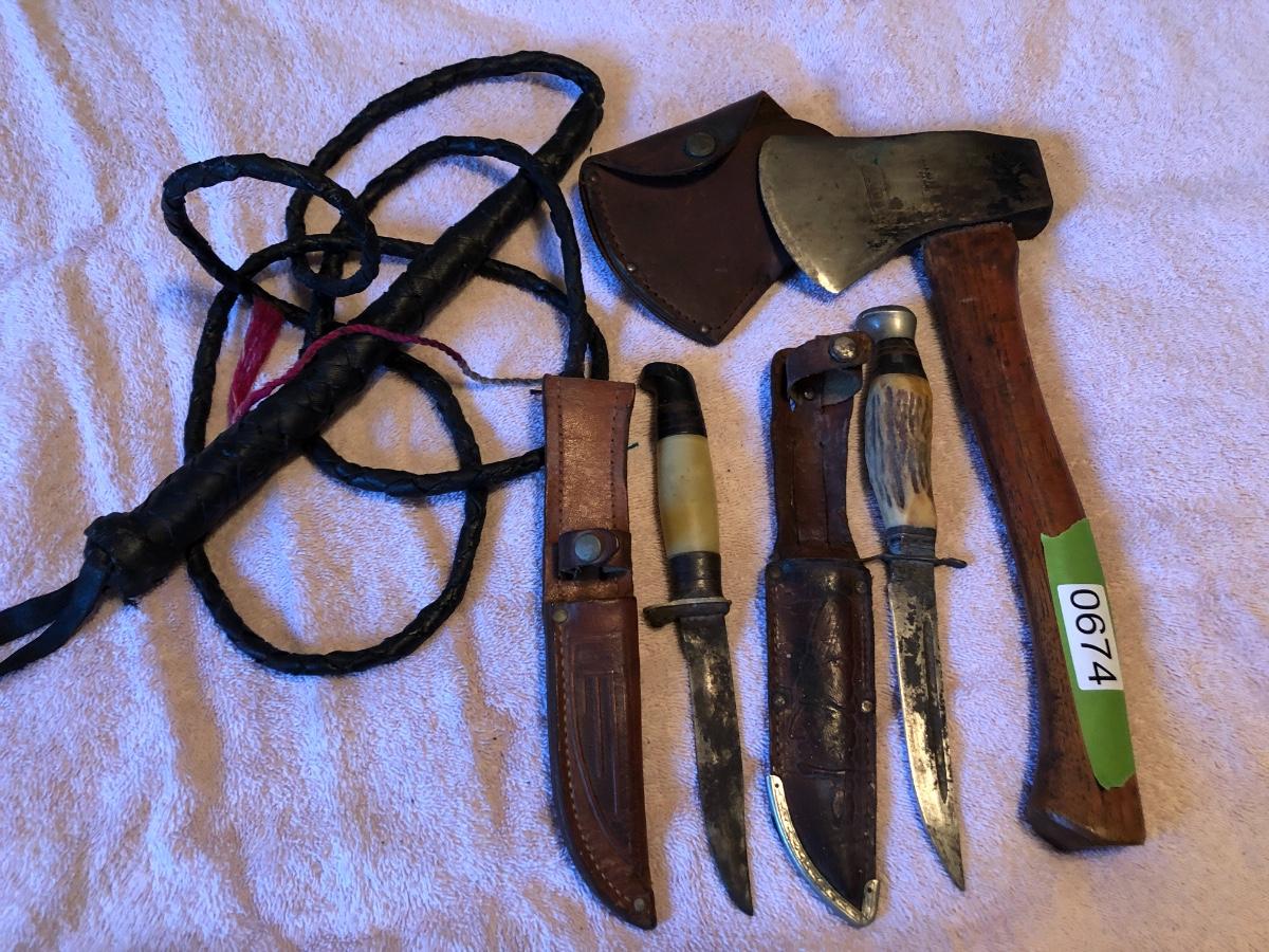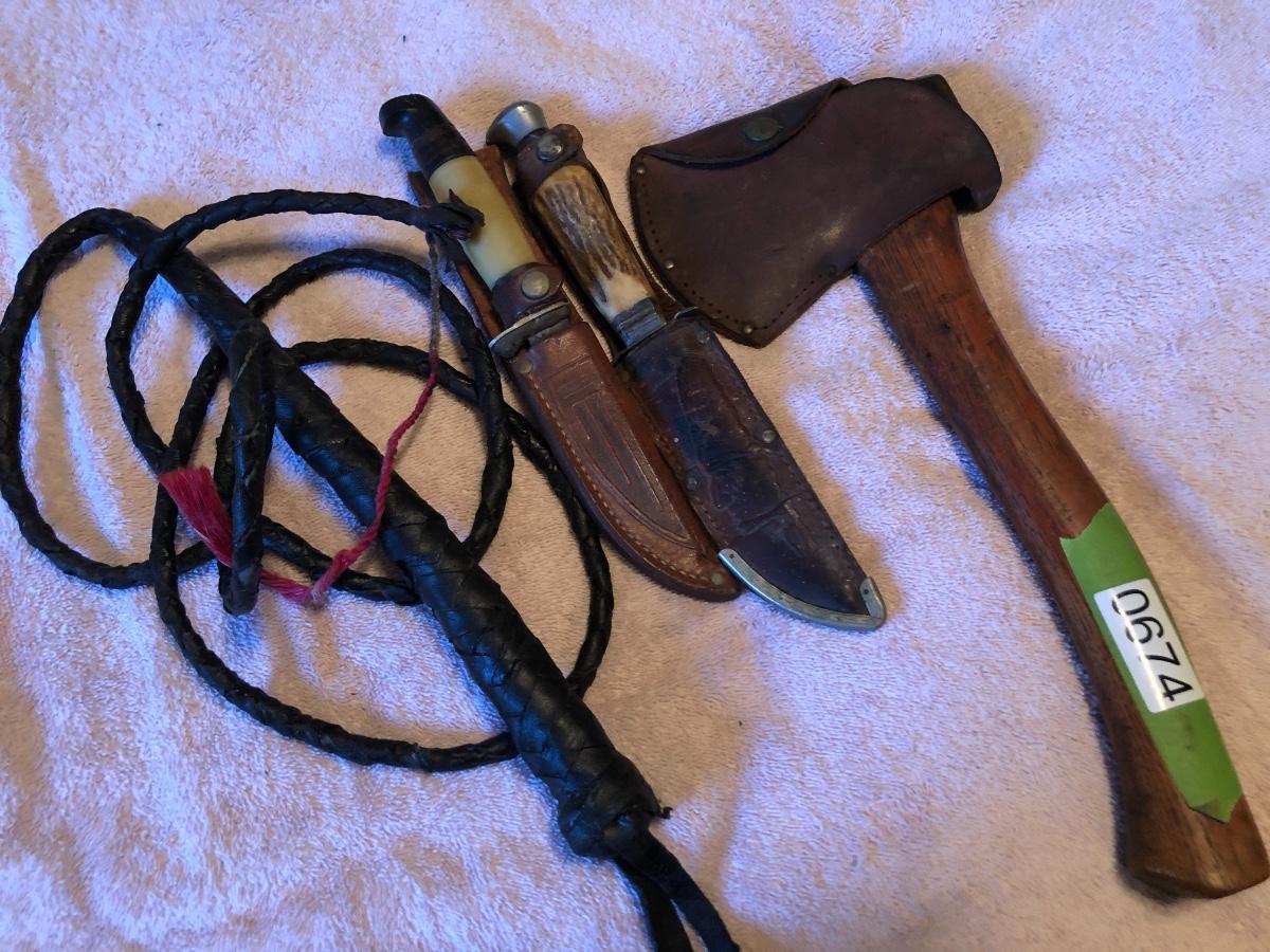 Vintage Boy Scout Axe, 2 Knives & Bull Whip. Lot #0674