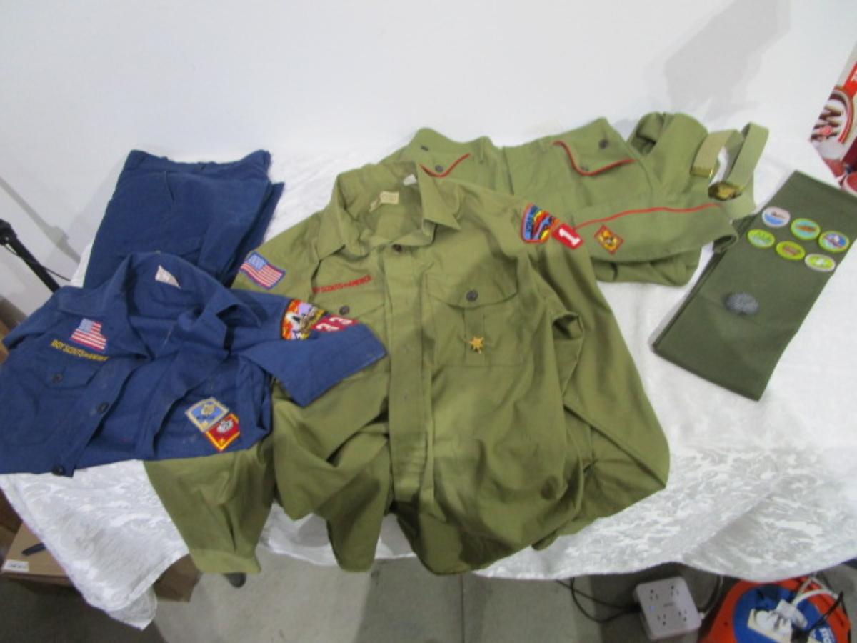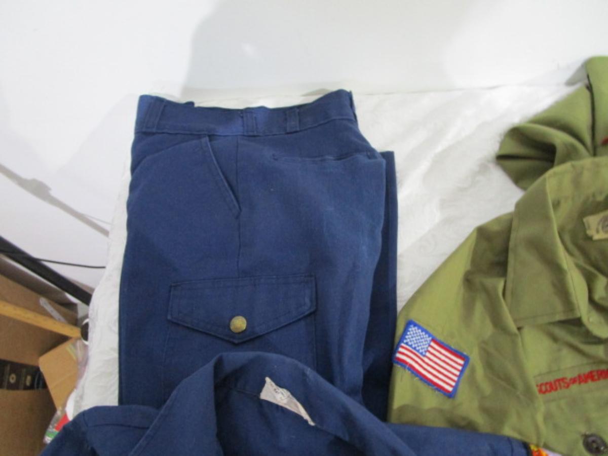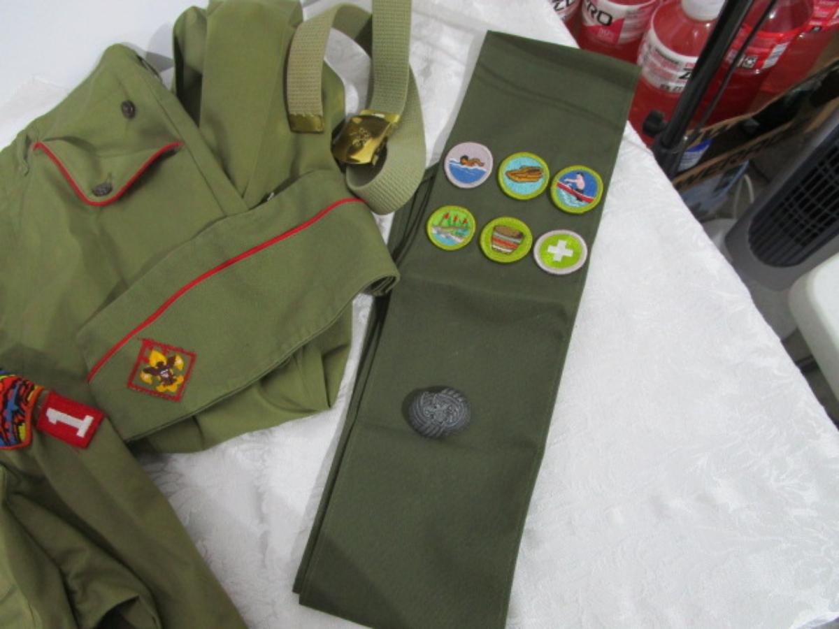 Boy Scout Pants 29" waist & inseam 29, belt 28", cap 21" around, merit badge sash, 1 shirt size 14-1/2 & long sleeved, neckerchief slide; Cub Scout pants 22-1/2" waist & inseam 22"( knees are patched), Cub Scout shirt size 10 & short sleeved