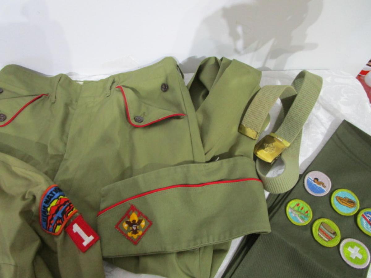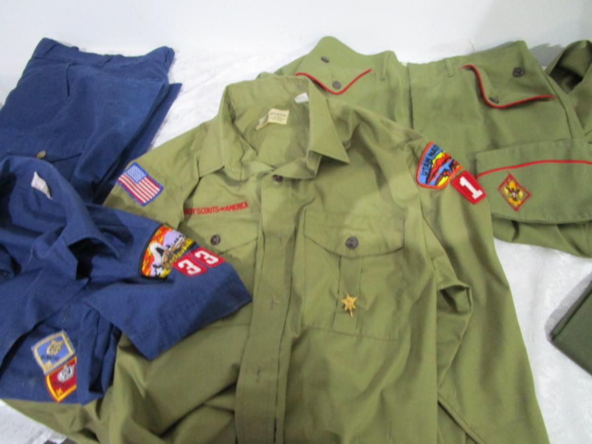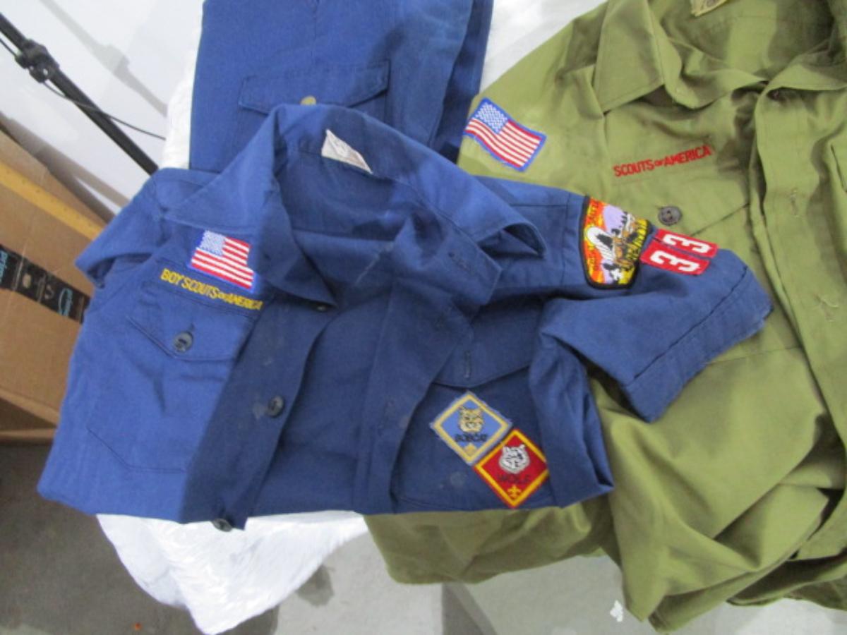 Boy Scout Pants 29" waist & inseam 29, belt 28", cap 21" around, merit badge sash, 1 shirt size 14-1/2 & long sleeved, neckerchief slide; Cub Scout pants 22-1/2" waist & inseam 22"( knees are patched), Cub Scout shirt size 10 & short sleeved