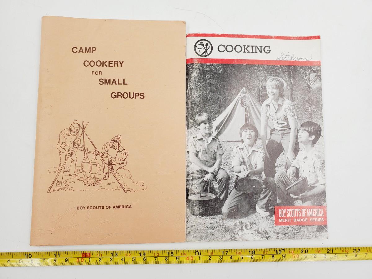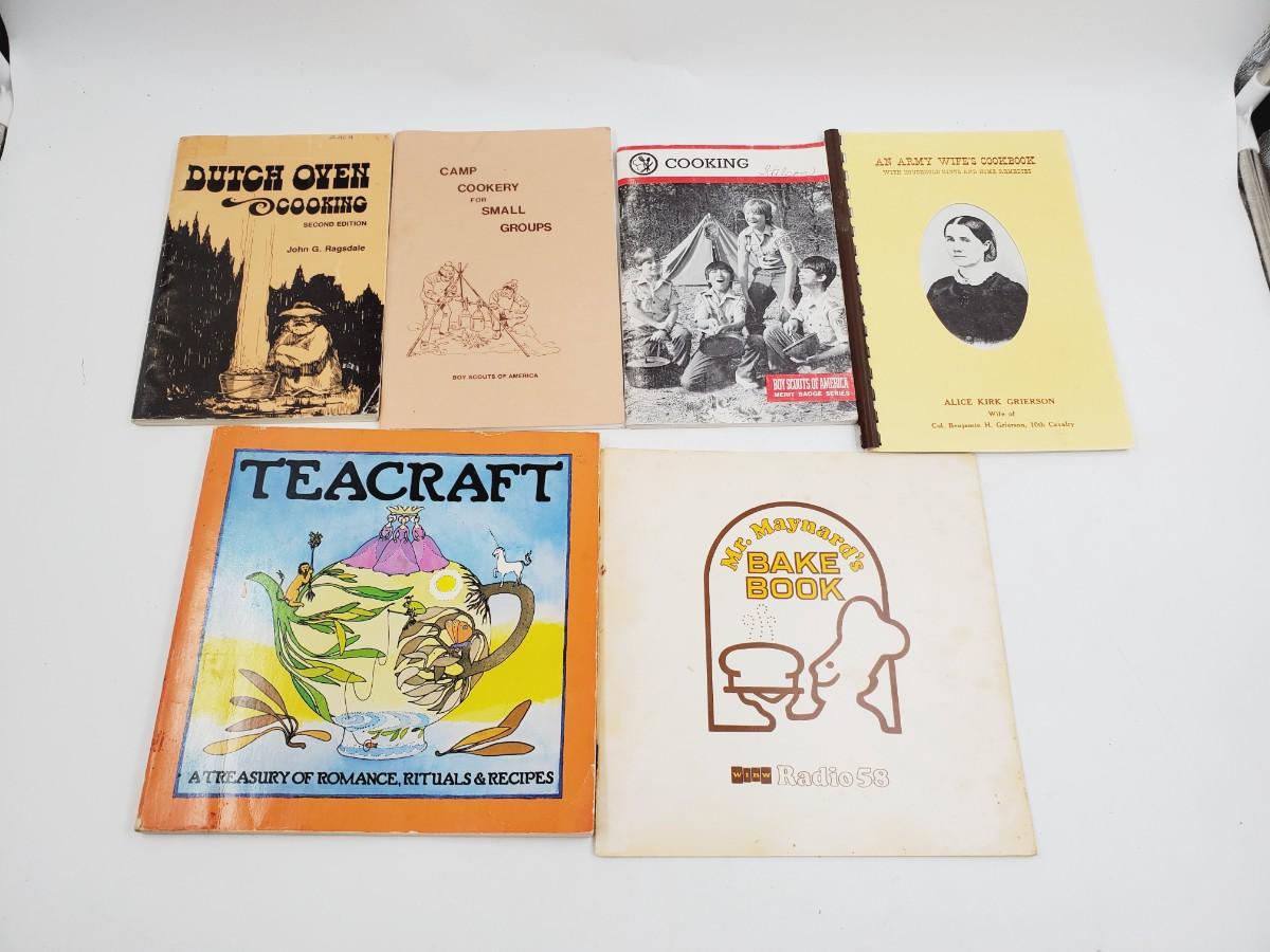 2 vintage Boyscouts of America paperback cookbooks , 1 second edition Dutch Oven. paperback, An ARMY Wife's Cookbook With Household Hints and Home Remedies, Teacraft paperback and Mr. Maynard's Bake Boon compiled by Wibw Radio Topeka, Ks.
