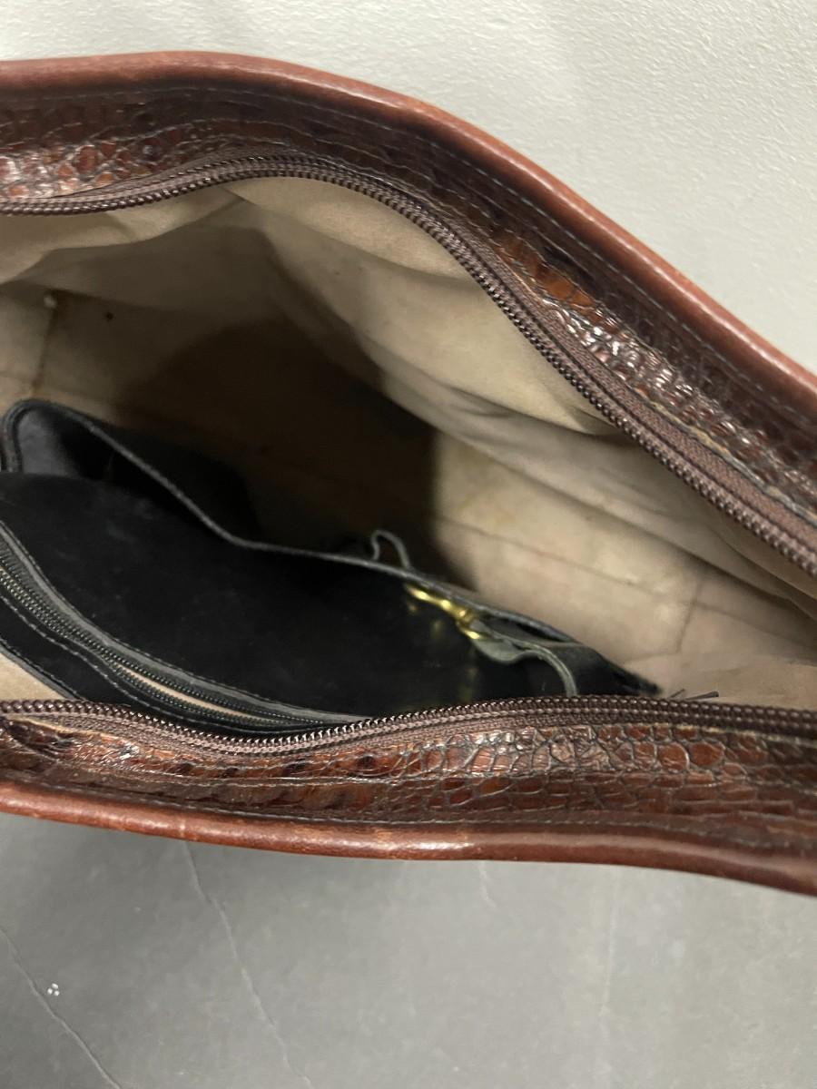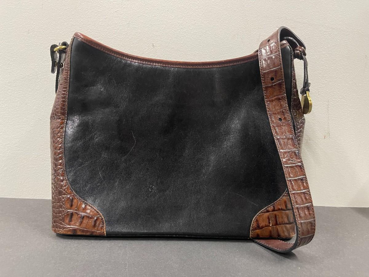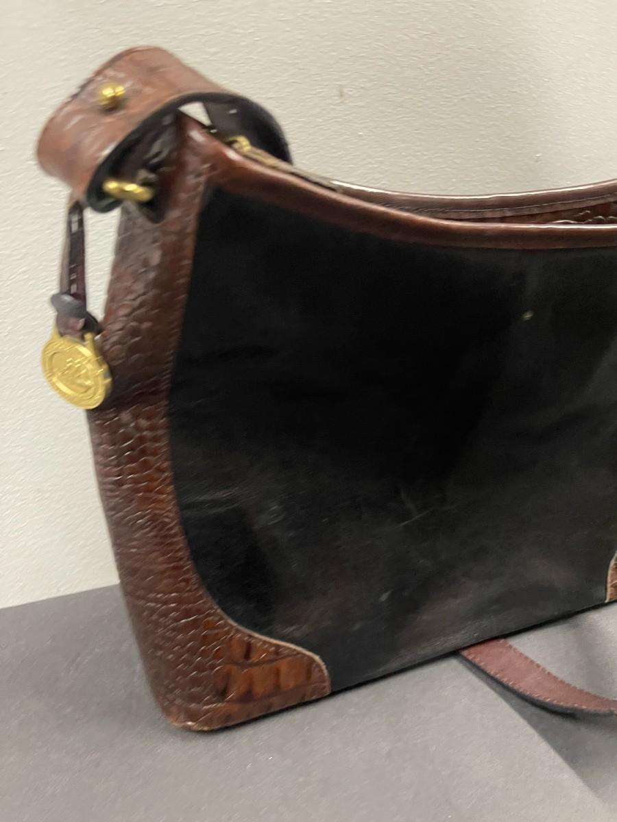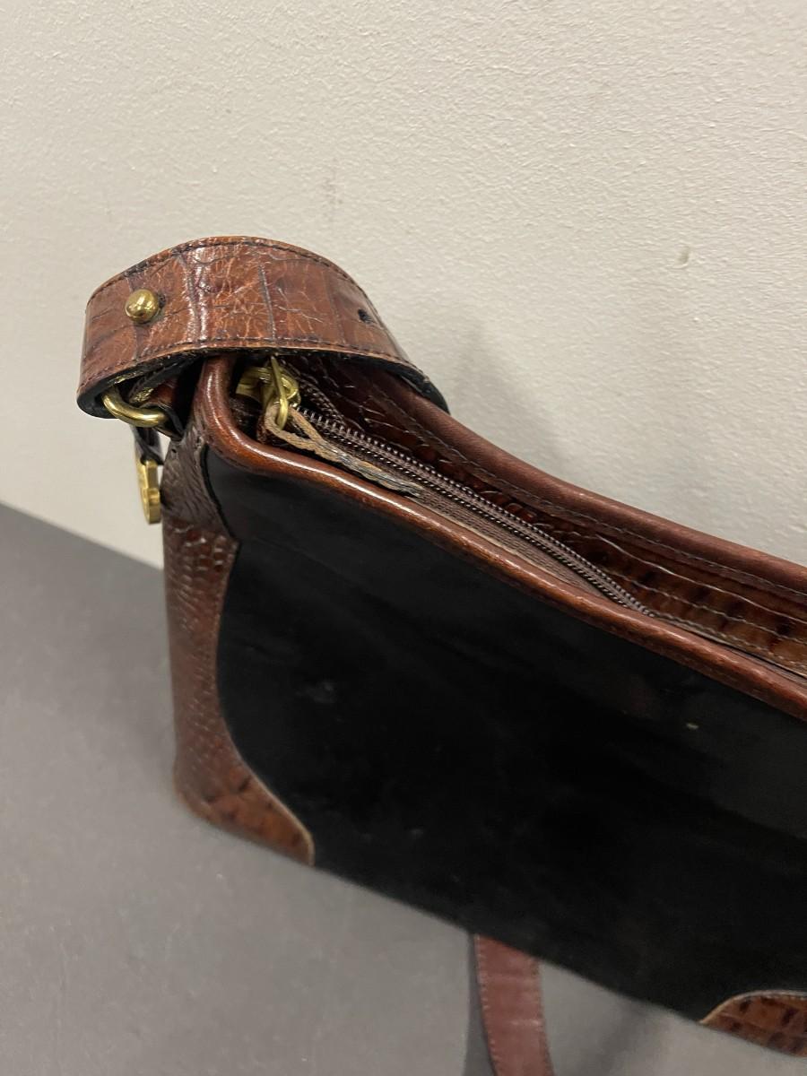 Vintage Brahmin pecan croc and black leather shoulder bag. Good condition with some minor scuff marks throughout and some wear at the feet. 9" x 12"